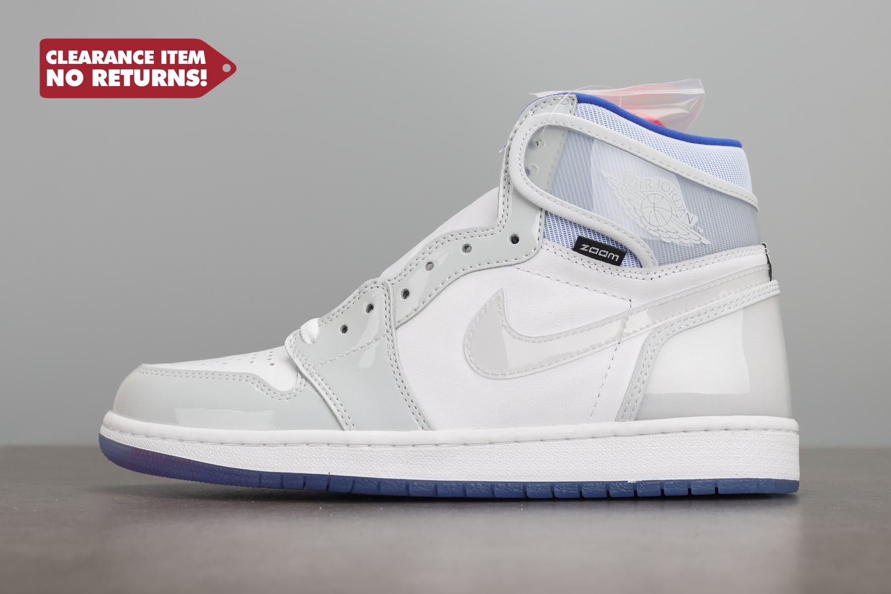 This AJ1 Retro High consists of a white leather upper with a mixture of mesh, patent leather, and translucent TPU overlays. An icy outsole, blue interior, and Zm branding above the logo completes the design.