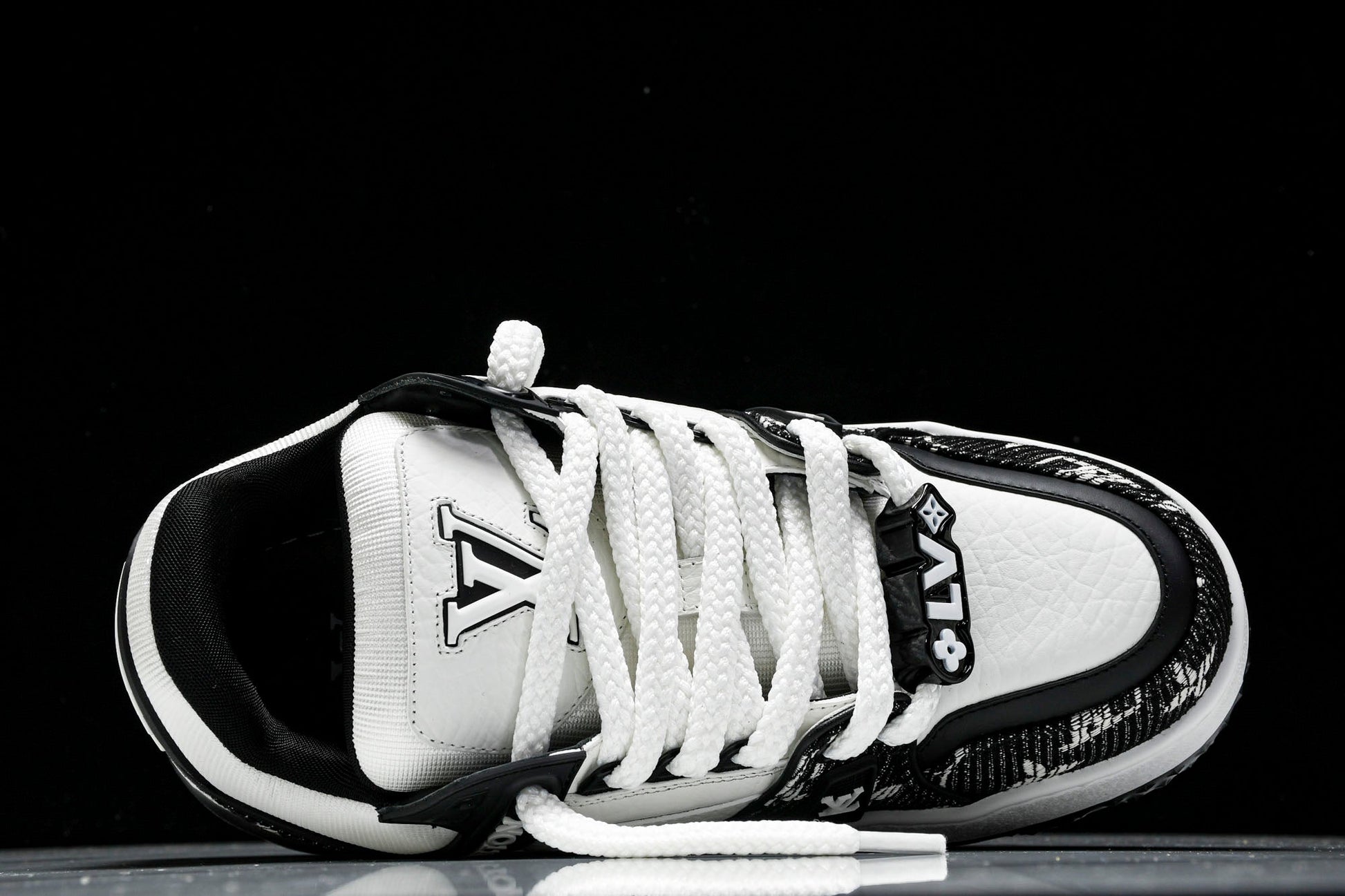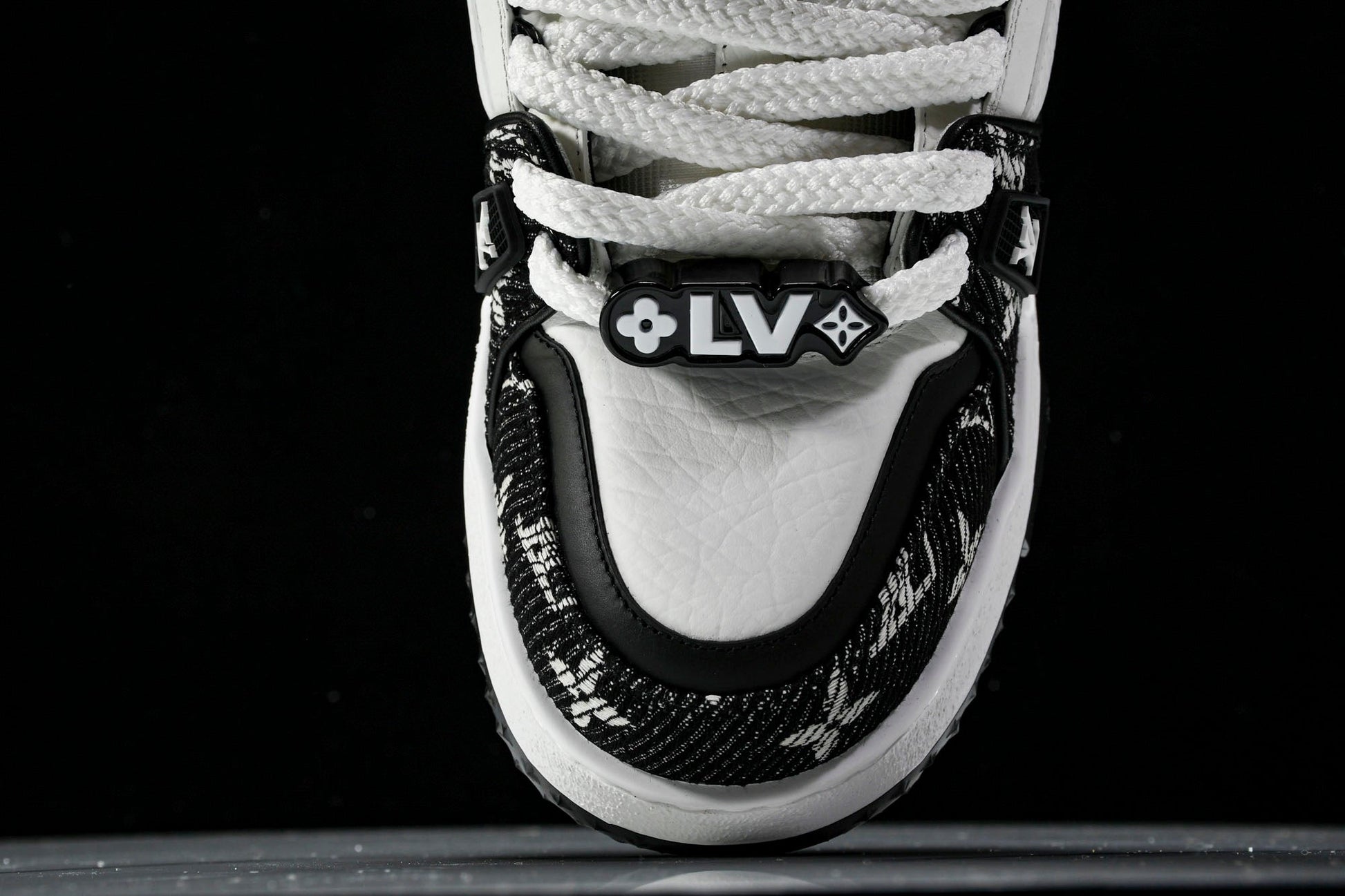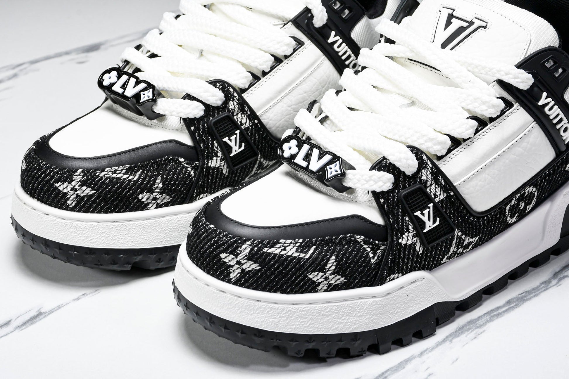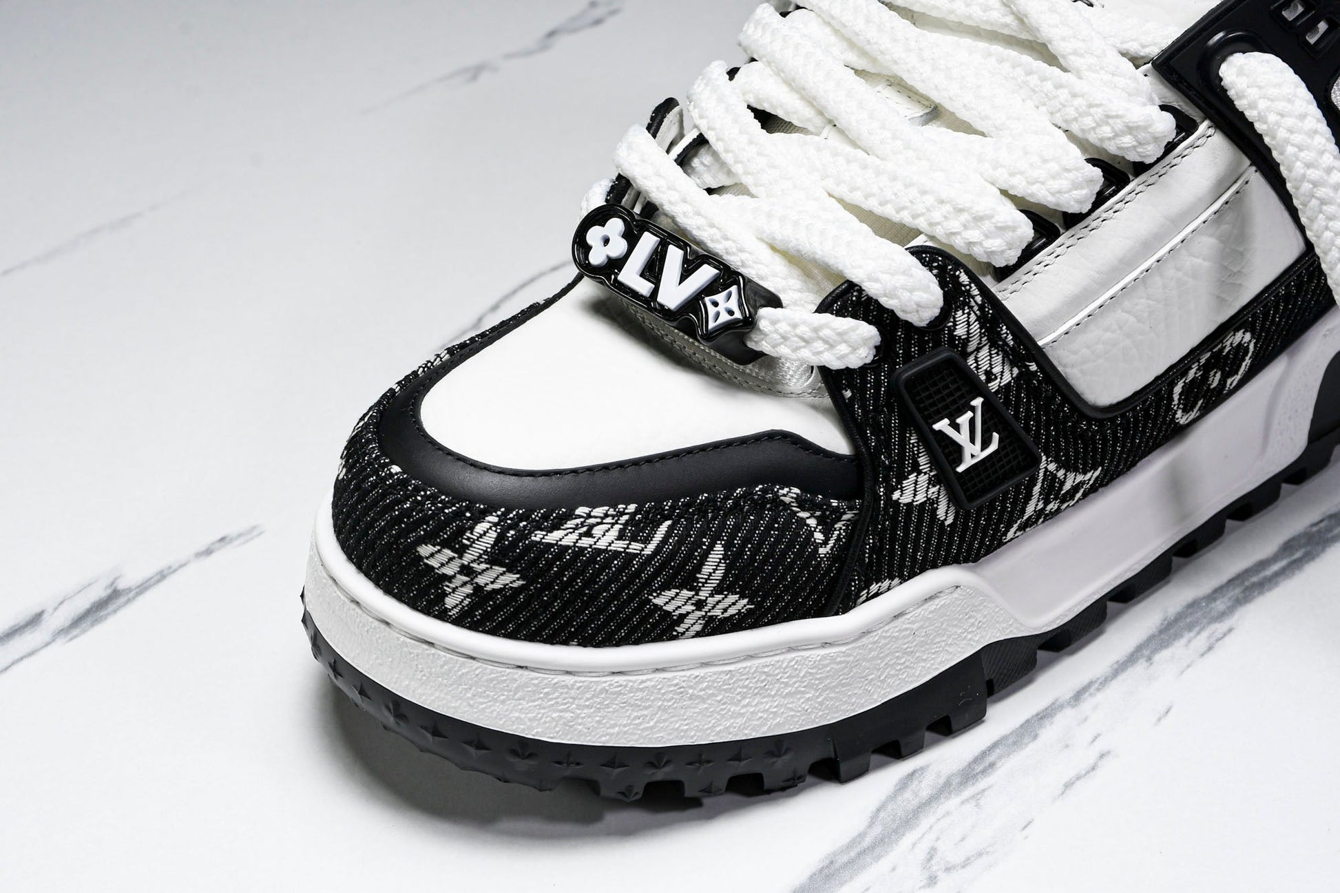 The 𝓛𝓥 Trainer Maxi Sneaker, crafted from soft calf leather, reimagines Virgil Abloh's iconic 𝓛𝓥 Trainer with an oversized fit and a modified outsole featuring pronounced tread. Inspired by vintage basketball sneakers, it includes multiple House signatures, such as rubber 𝓛𝓥 Initials on the upper and M0nogram Flowers on the outsole. Debuted at 𝓛𝓥's Spring-Summer 2023 men's show, this model also boasts thick textile laces adorned with colorful beads showcasing playful branding.