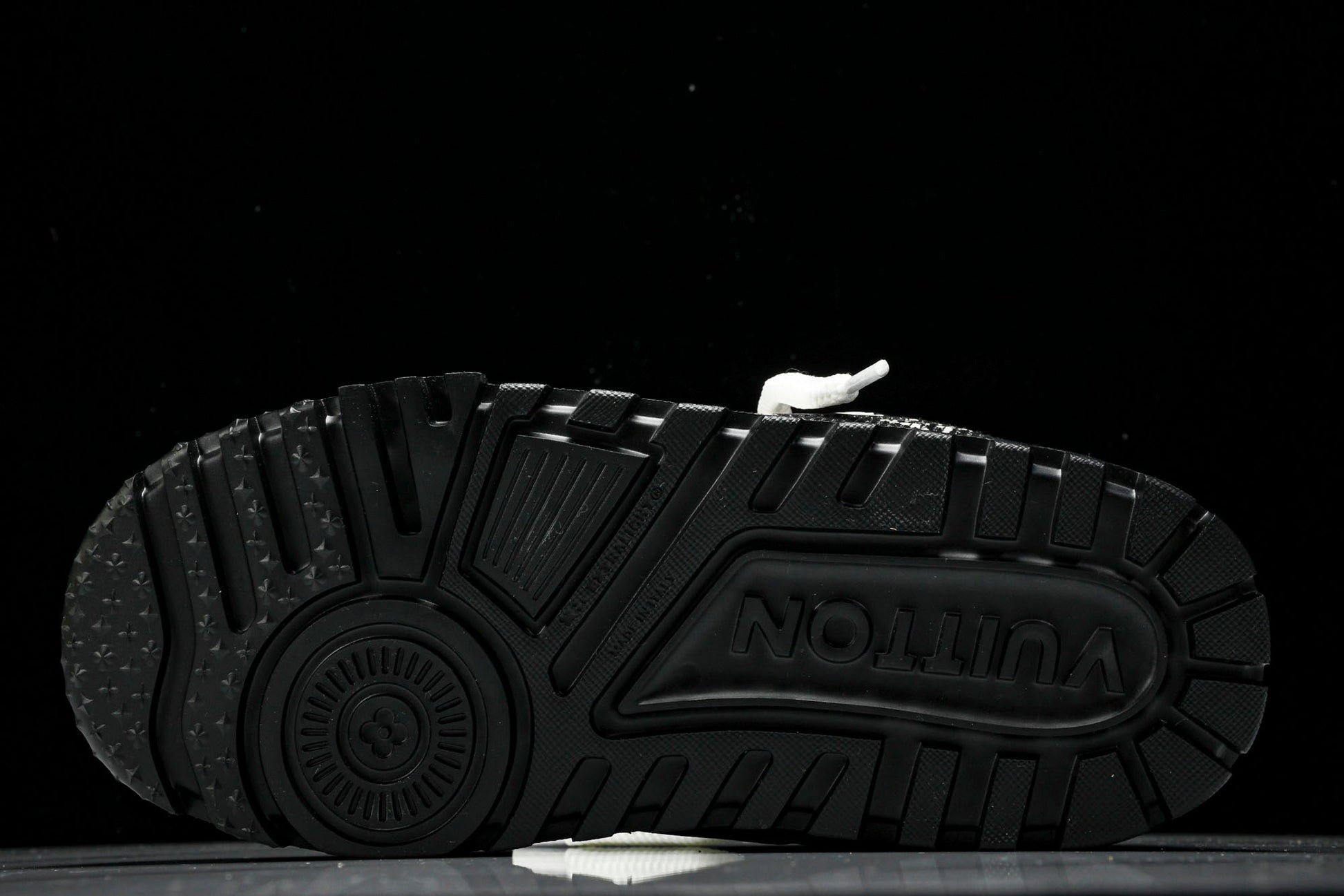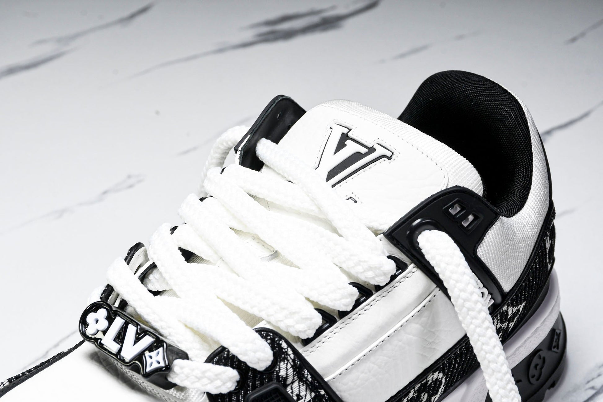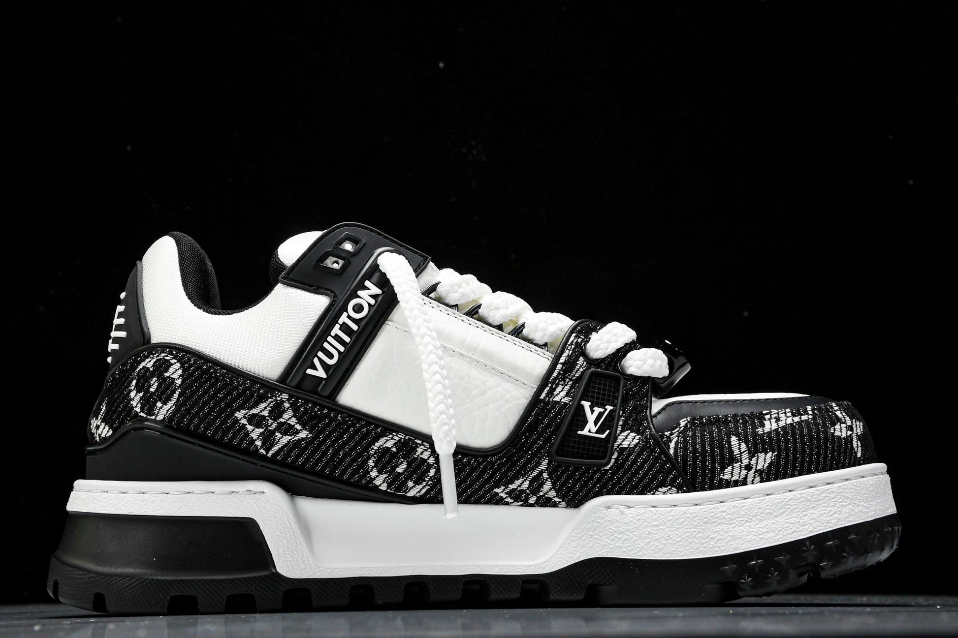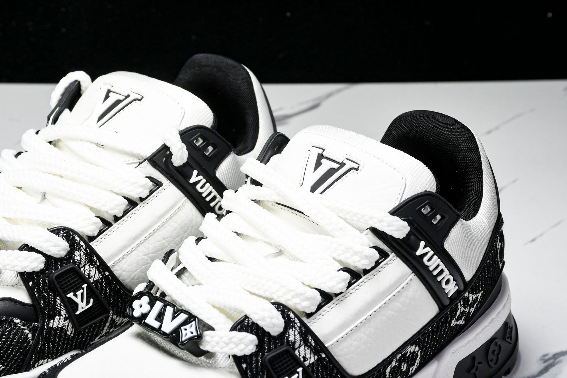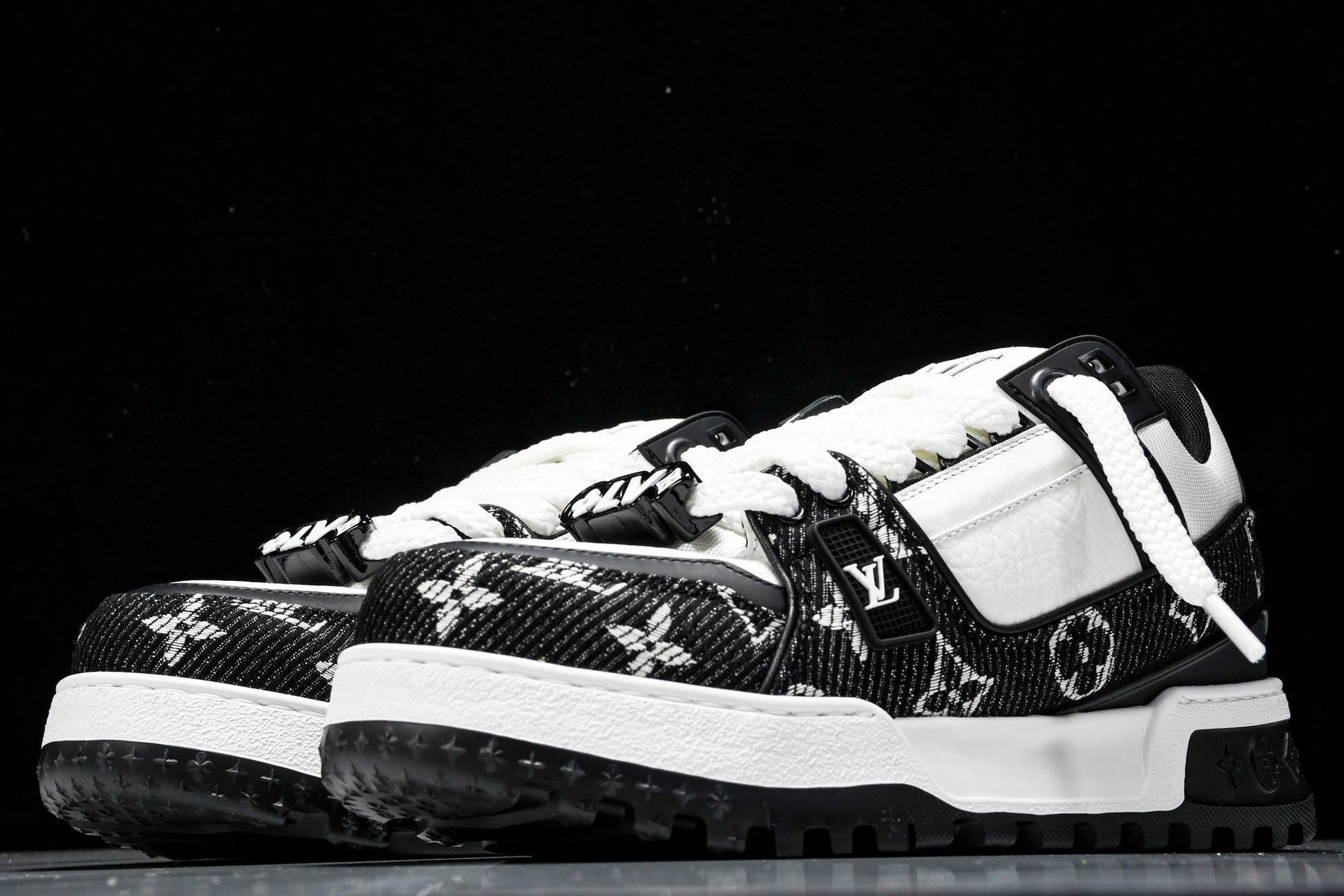 The 𝓛𝓥 Trainer Maxi Sneaker, crafted from soft calf leather, reimagines Virgil Abloh's iconic 𝓛𝓥 Trainer with an oversized fit and a modified outsole featuring pronounced tread. Inspired by vintage basketball sneakers, it includes multiple House signatures, such as rubber 𝓛𝓥 Initials on the upper and M0nogram Flowers on the outsole. Debuted at 𝓛𝓥's Spring-Summer 2023 men's show, this model also boasts thick textile laces adorned with colorful beads showcasing playful branding.