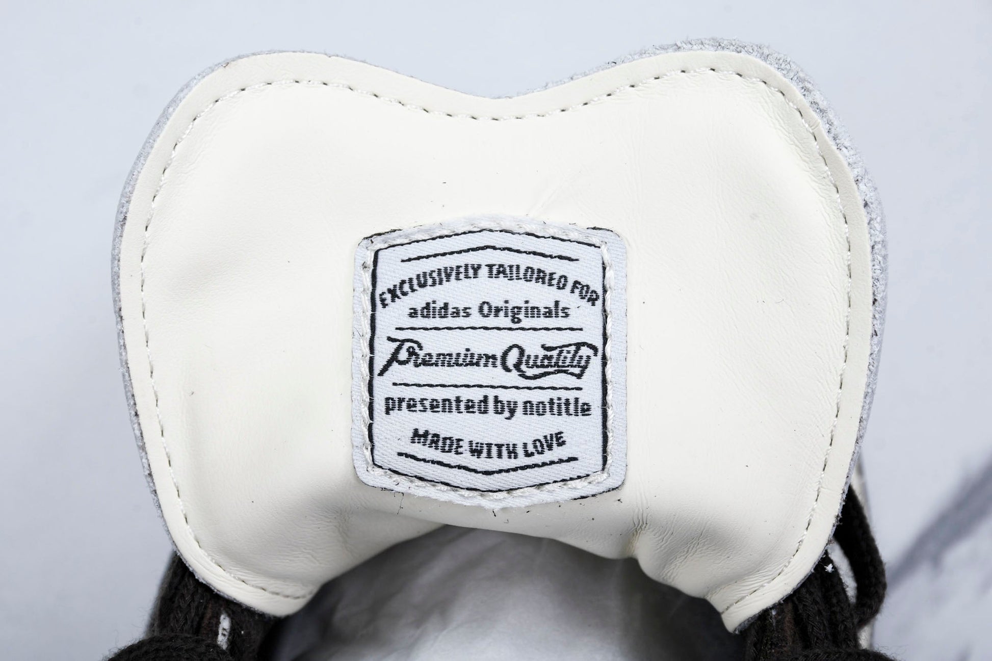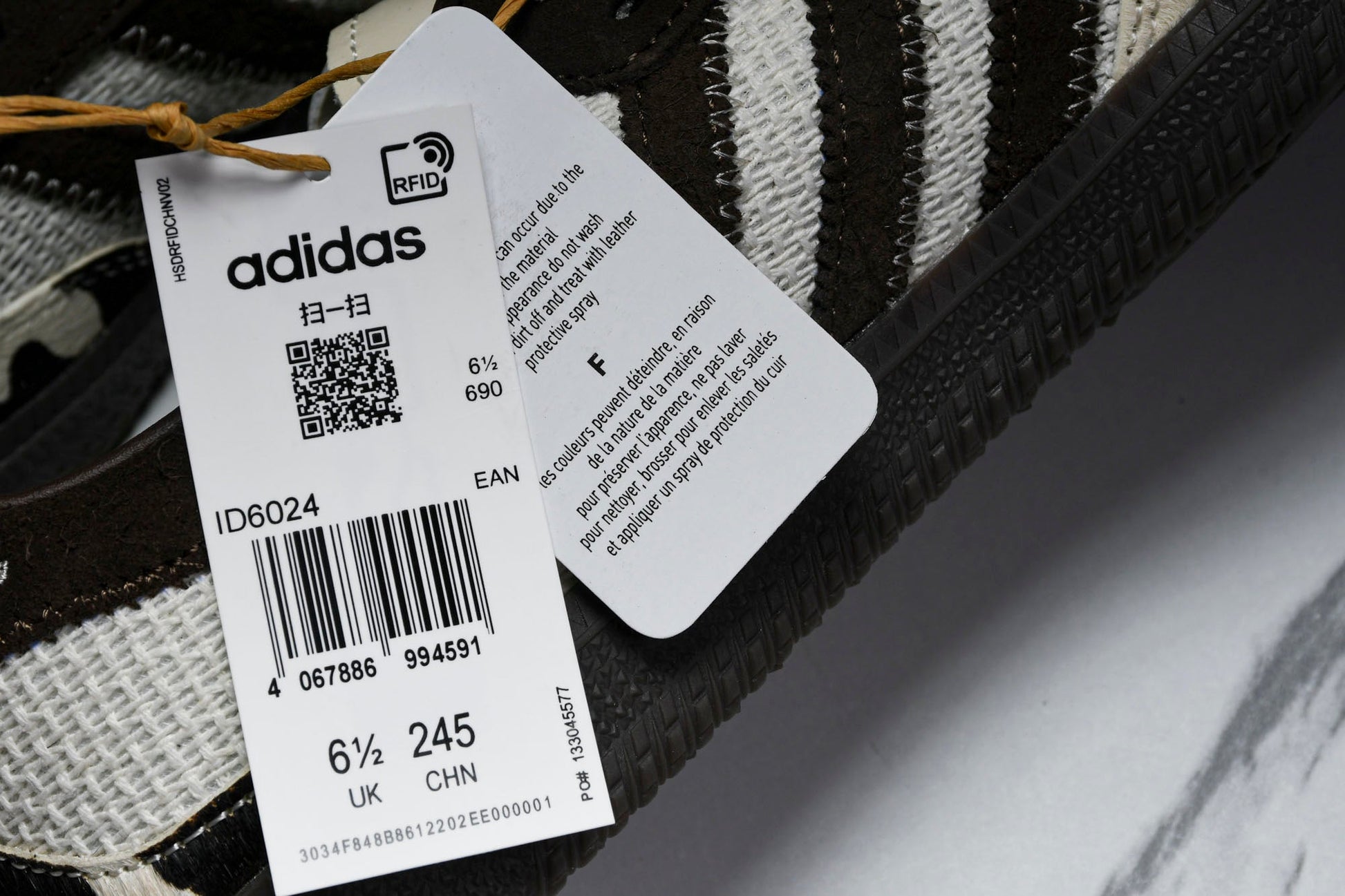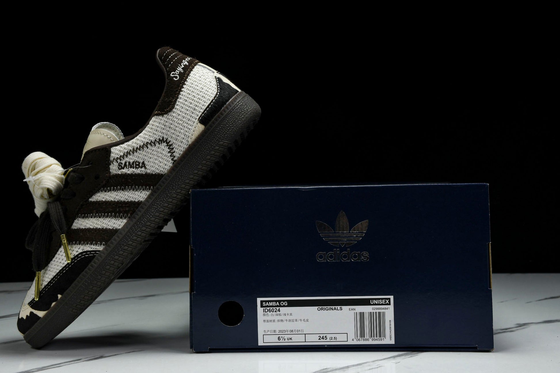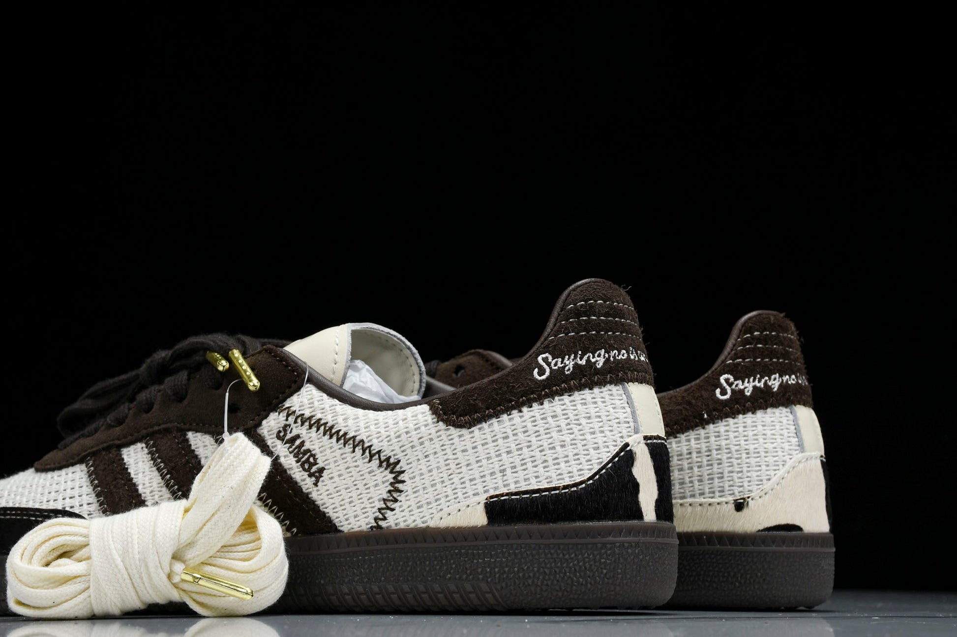 Part of a collaborative footwear collection, the Samba x notitle ‘Cow Print’ showcases an off-white knit textile base with faux cowhide overlays on the forefoot and heel. The design is accented with brown suede on the eyestay, stripes, and back tab, which features the phrase 'Saying No Is an Act of Love.' A brown gum rubber cupsole completes the look.