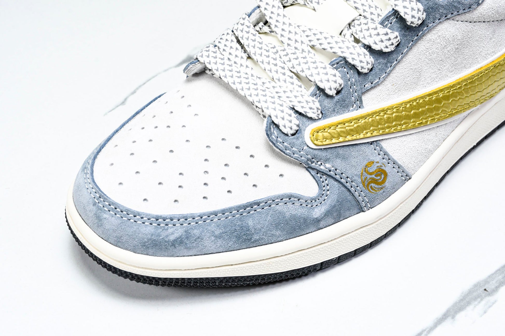 Drip Locker is here to make your impossible fantasy collaborations a reality - bringing together iconic brands in a series of custom creations that sneakerheads could only dream of. These unreleased Travis Scott AJ1 Retro Low x Year of The Snake sneakers offer an exclusive fusion of streetwear icons, blending the Travis Scott AJ1 Low design with distinctive Chinese New Year branding. Featuring unique premium materials and the signature reverse check, these sneakers showcase a one-of-a-kind look that elevates any collection