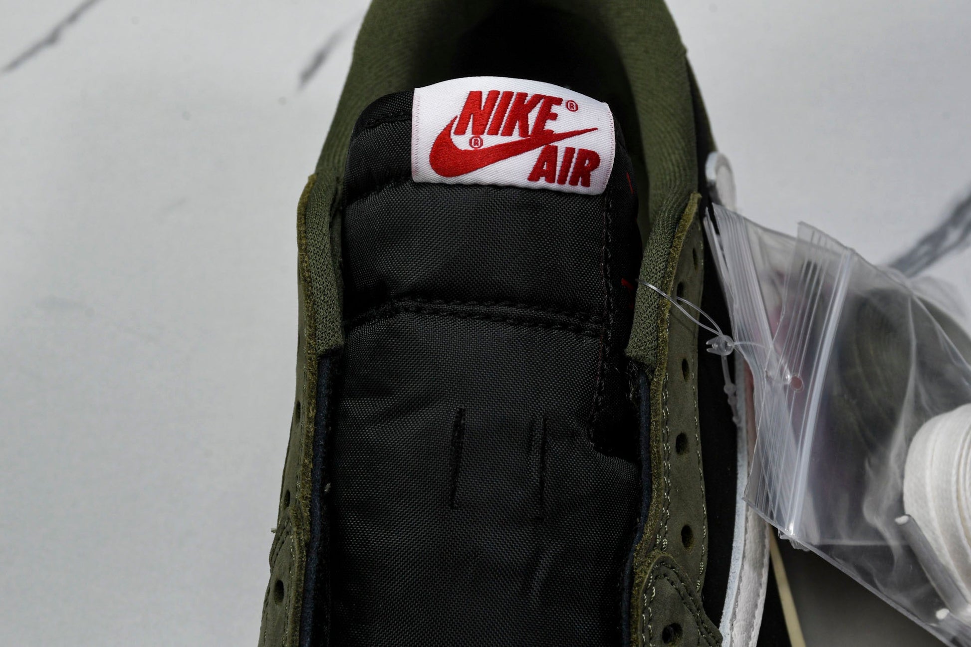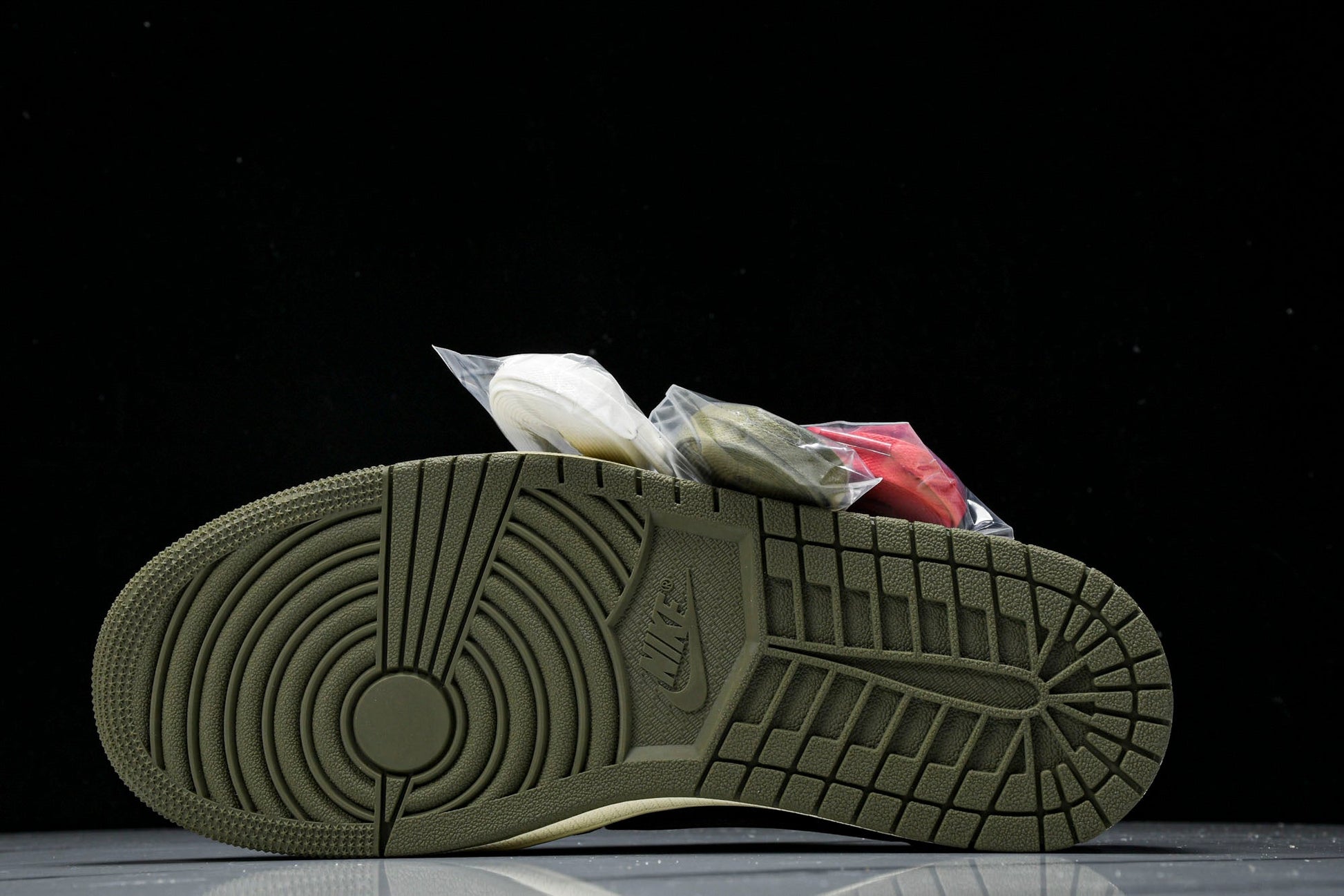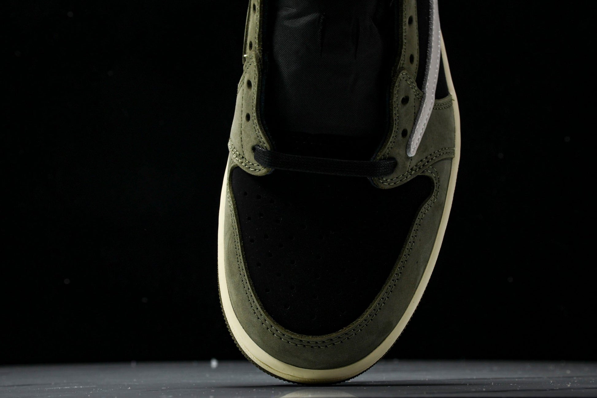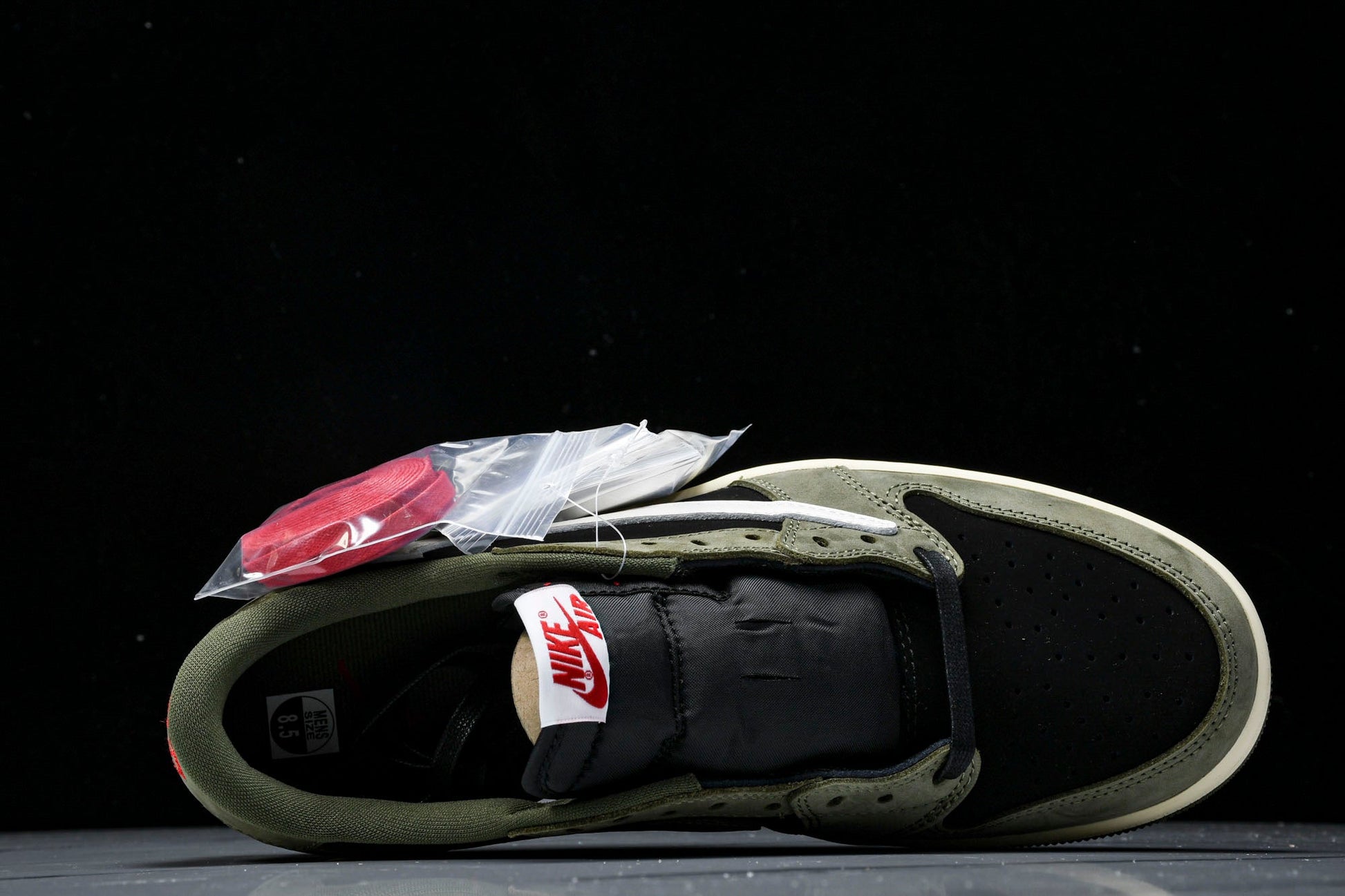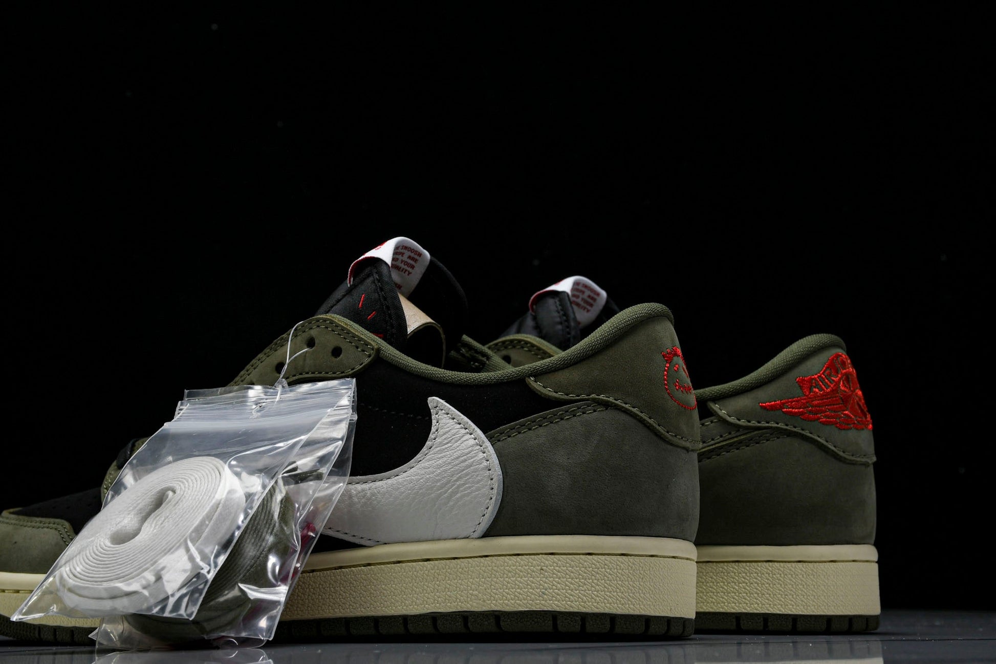 Building off the success of their previous collaborations, Travis Scott introduces the AJ1 Retro Low OG 'Black Olive,' reminiscent of the Original AJ1 Low Dark Mocha colorway. Despite being reported as canceled and not seeing an official release, you can still find this rare sneaker exclusively through Drip Locker. Featuring a black upper with olive overlays and red branding accents, this design includes Travis's signature backwards logo on the lateral side and “Cactus Jack” insignias on the heel and inner upper.