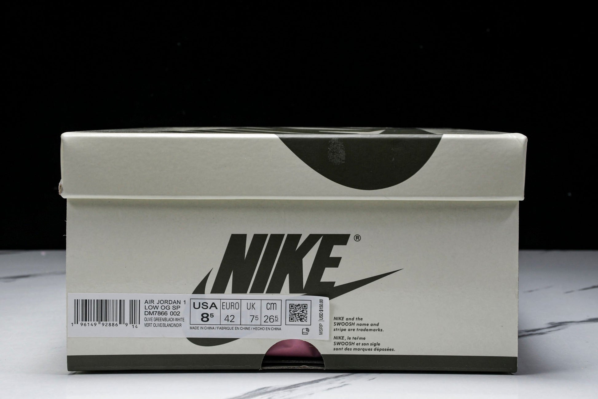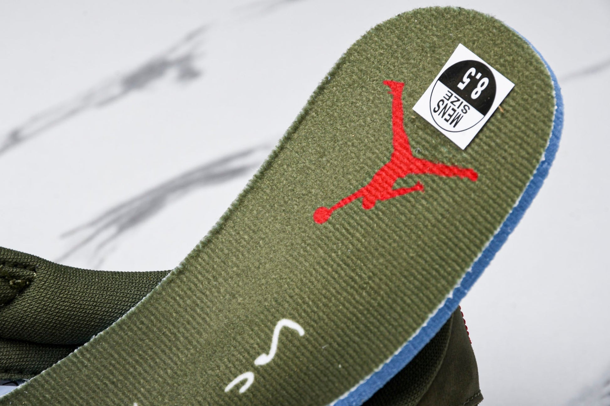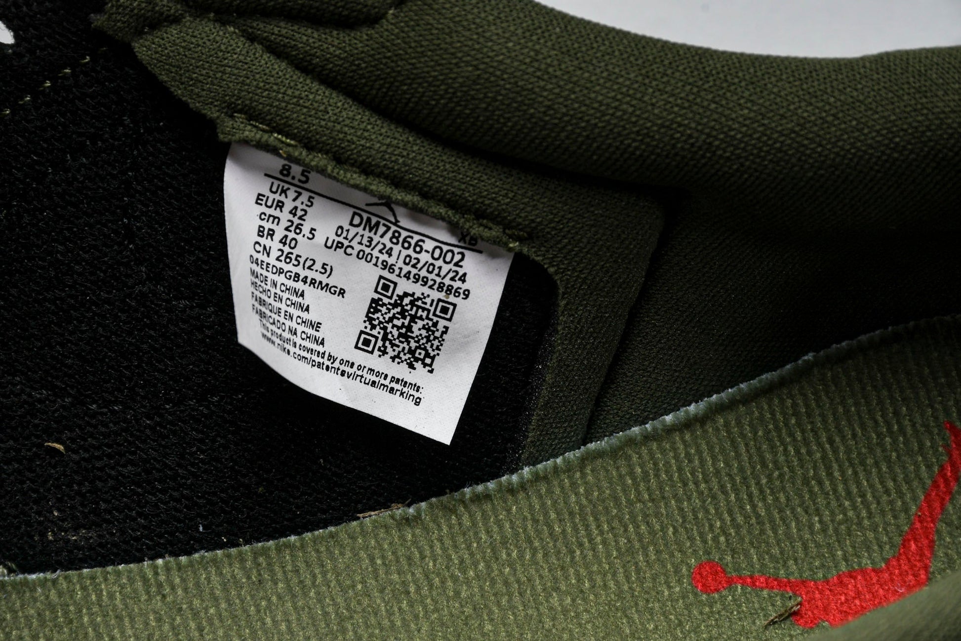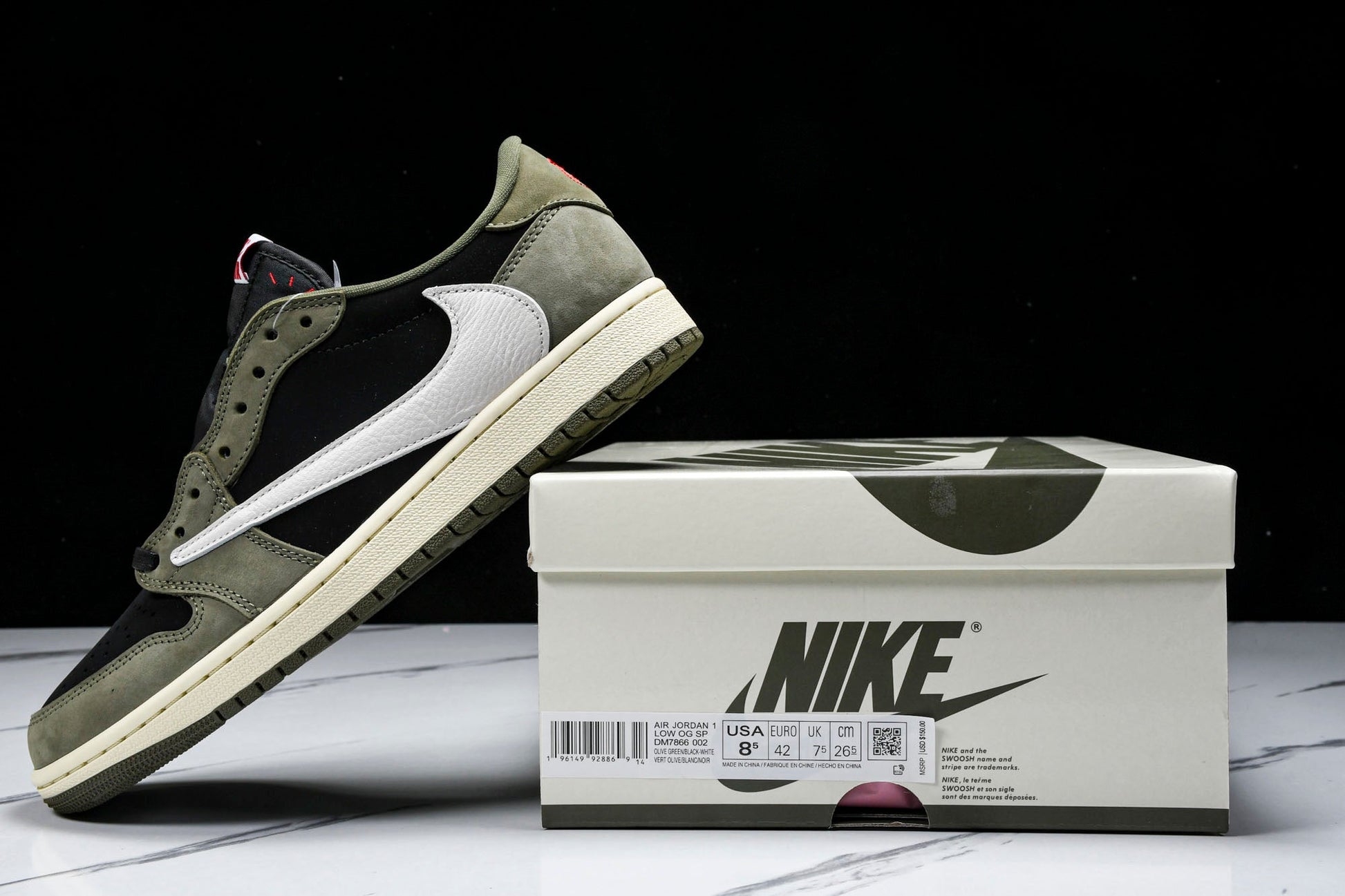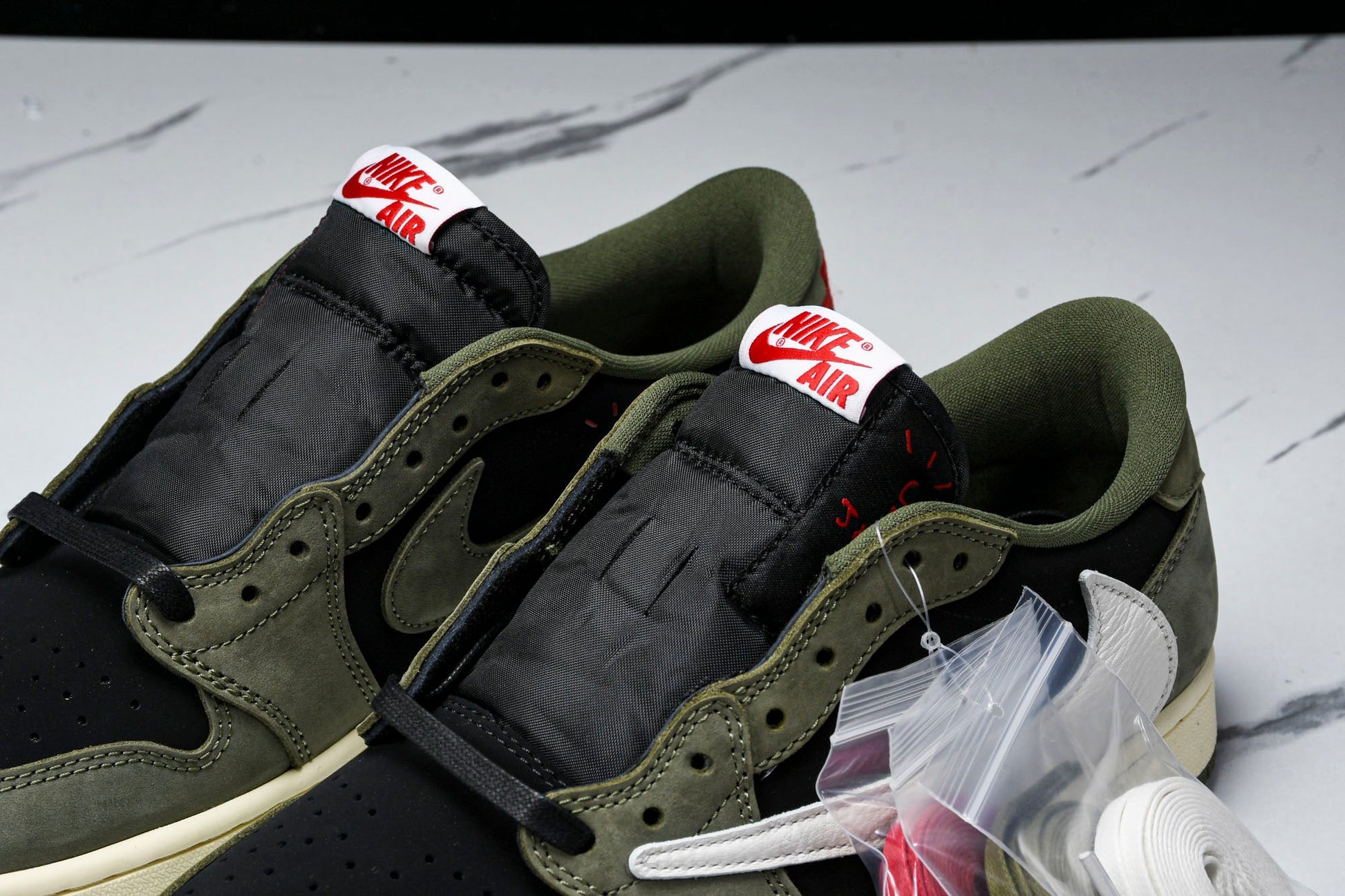 Building off the success of their previous collaborations, Travis Scott introduces the AJ1 Retro Low OG 'Black Olive,' reminiscent of the Original AJ1 Low Dark Mocha colorway. Despite being reported as canceled and not seeing an official release, you can still find this rare sneaker exclusively through Drip Locker. Featuring a black upper with olive overlays and red branding accents, this design includes Travis's signature backwards logo on the lateral side and “Cactus Jack” insignias on the heel and inner upper.