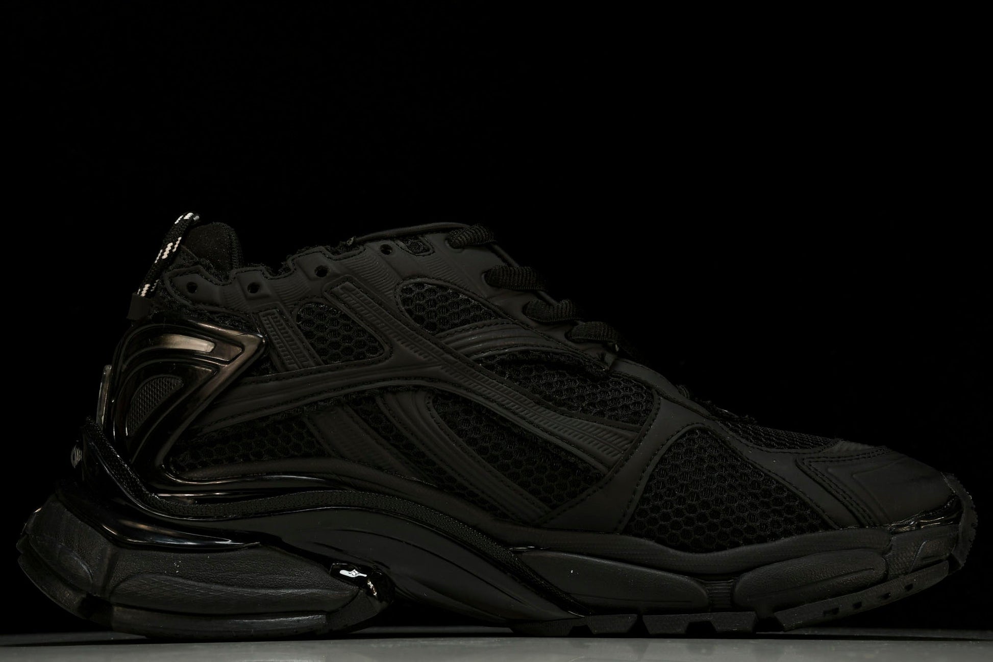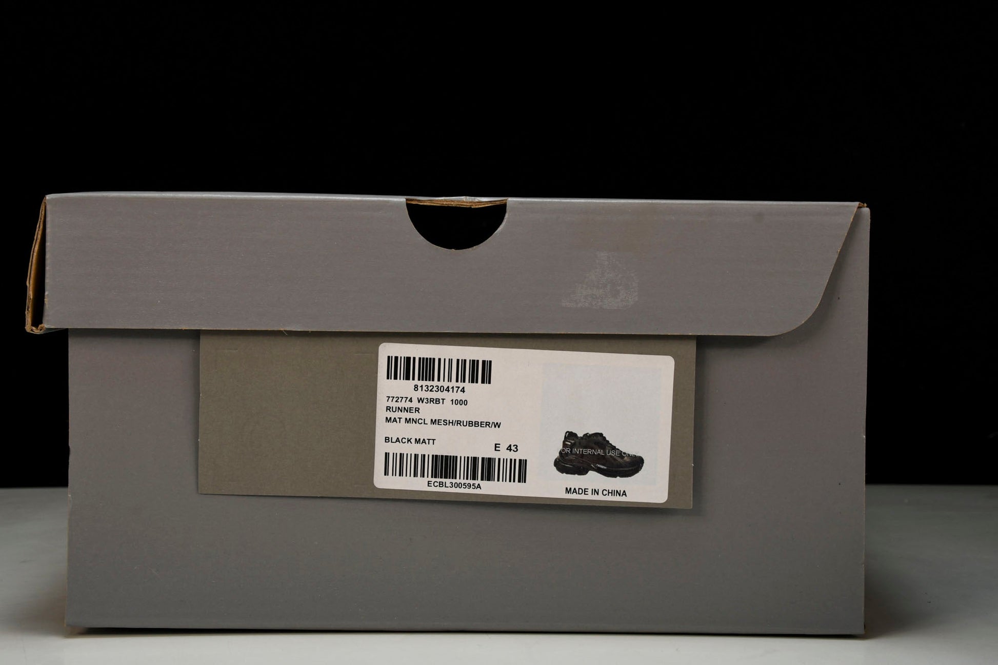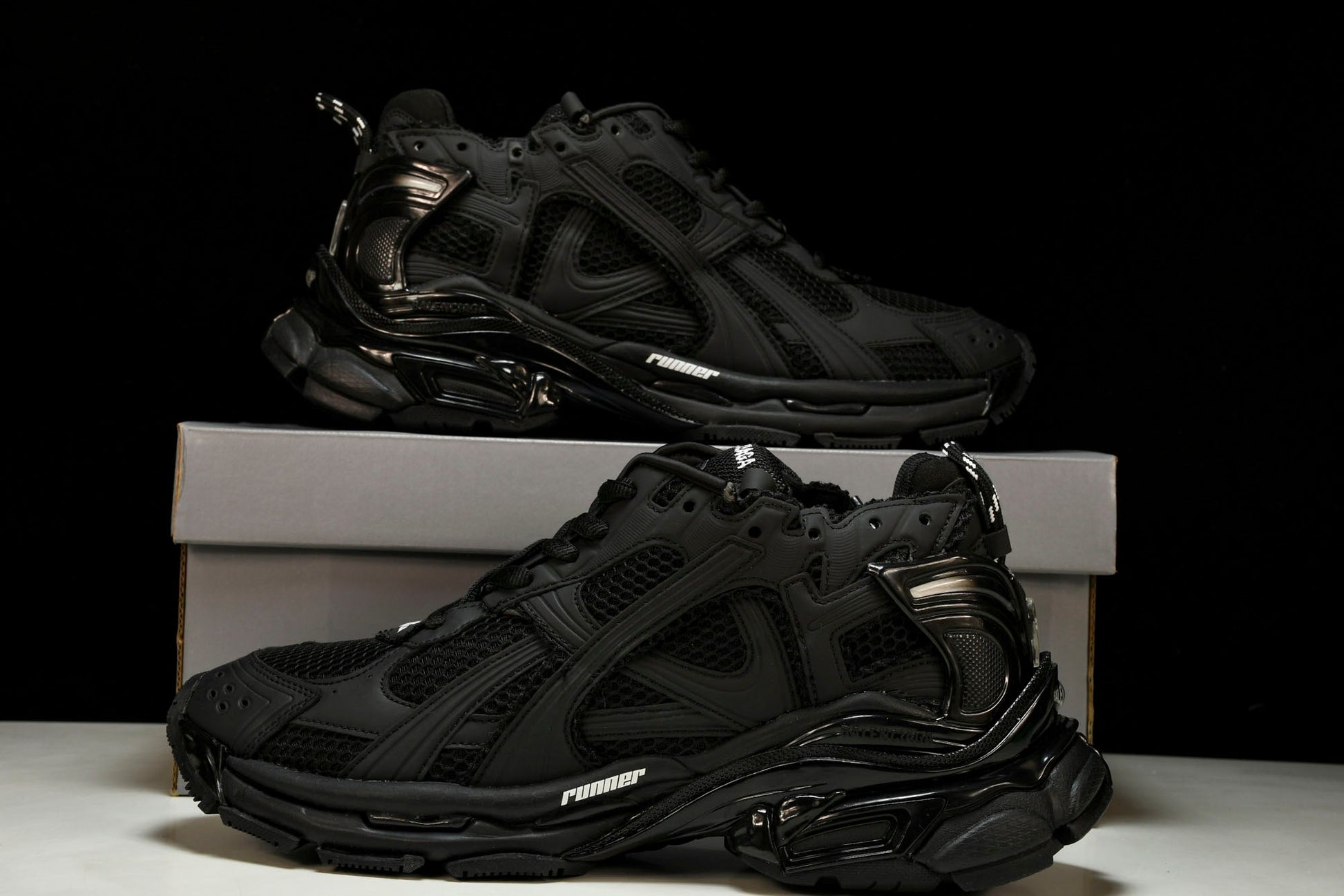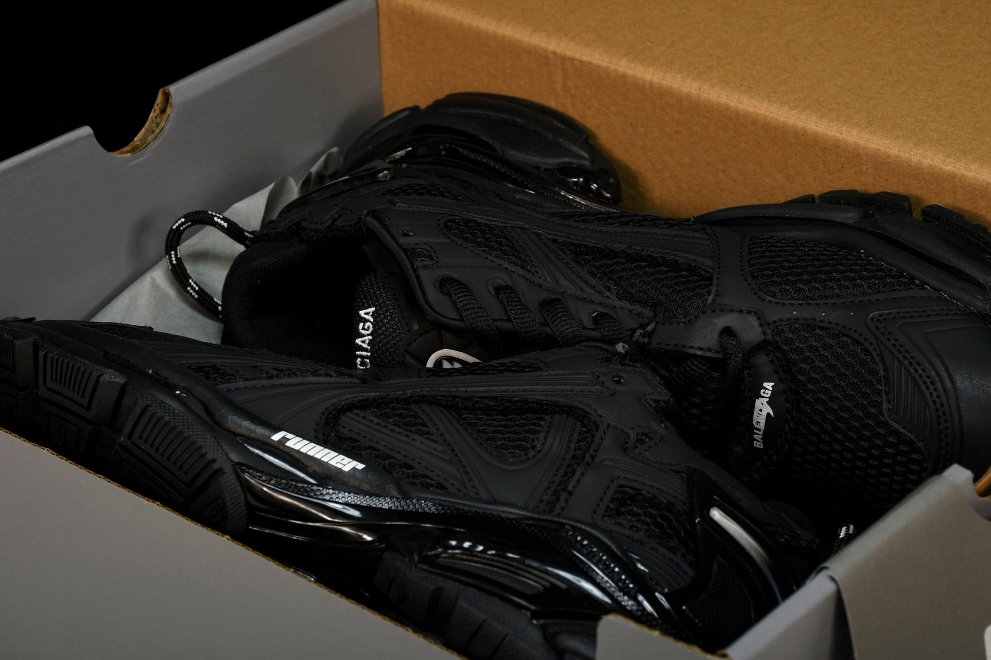 The B Runner showcases another edgy design that perfectly captures the brand's commitment to the sportswear aesthetic. This sneaker's upper incorporates mesh and nylon paneling for effective ventilation during movement, ensuring comfort and breathability. Complemented by a chunky ridged rubber sole that provides ample support, these sneakers combine style and functionality effortlessly. The sleek 'Triple Black - Matte' version, swathed in all-black, maintains the bold and sporty design that is characteristic of B's sportswear aesthetic. It's a sophisticated choice for those who value both fashion and performance in their sneakers.