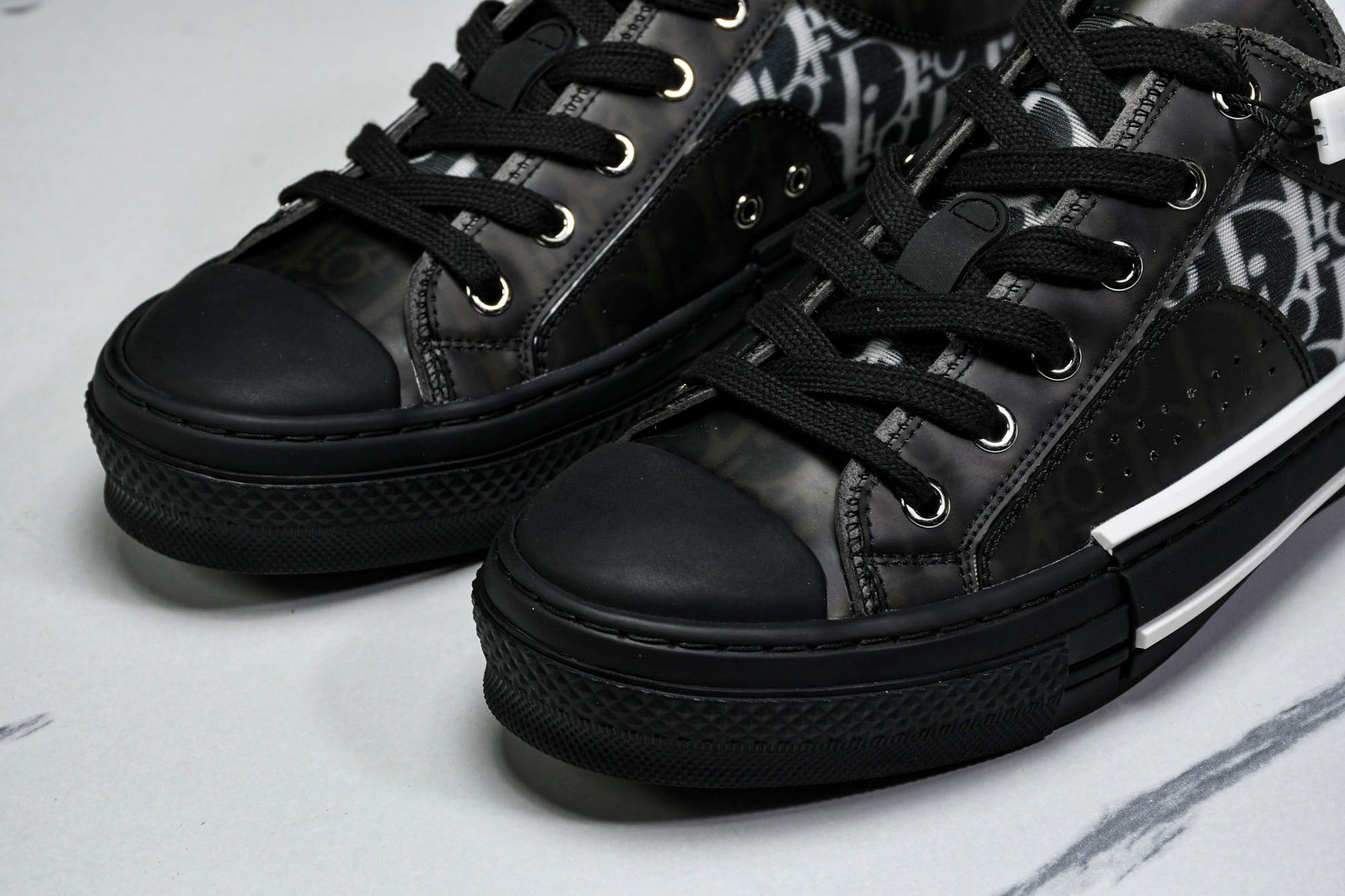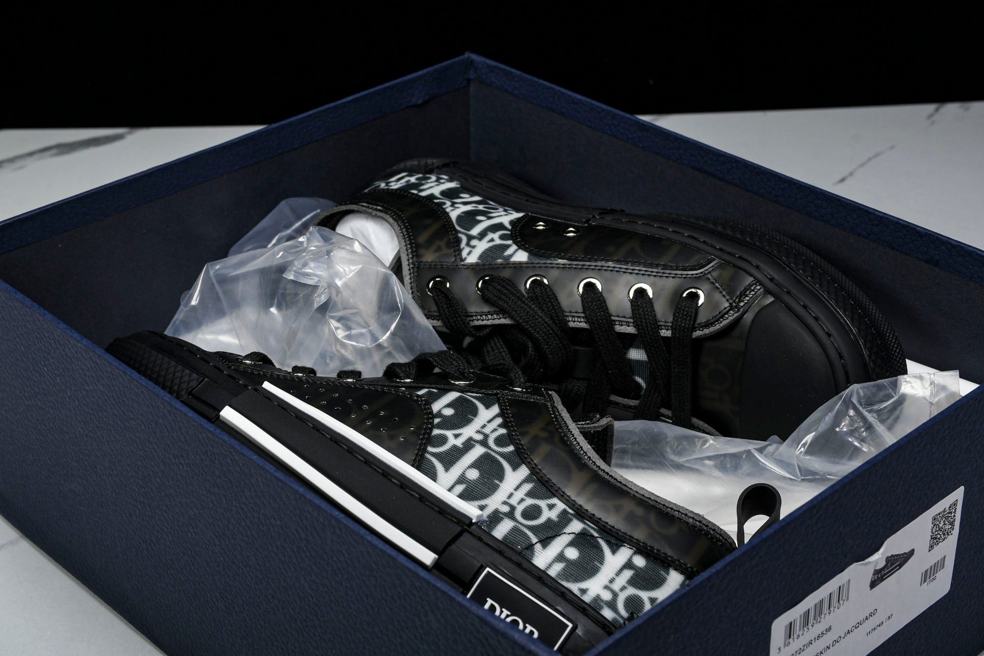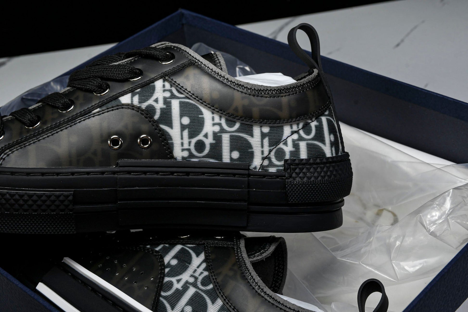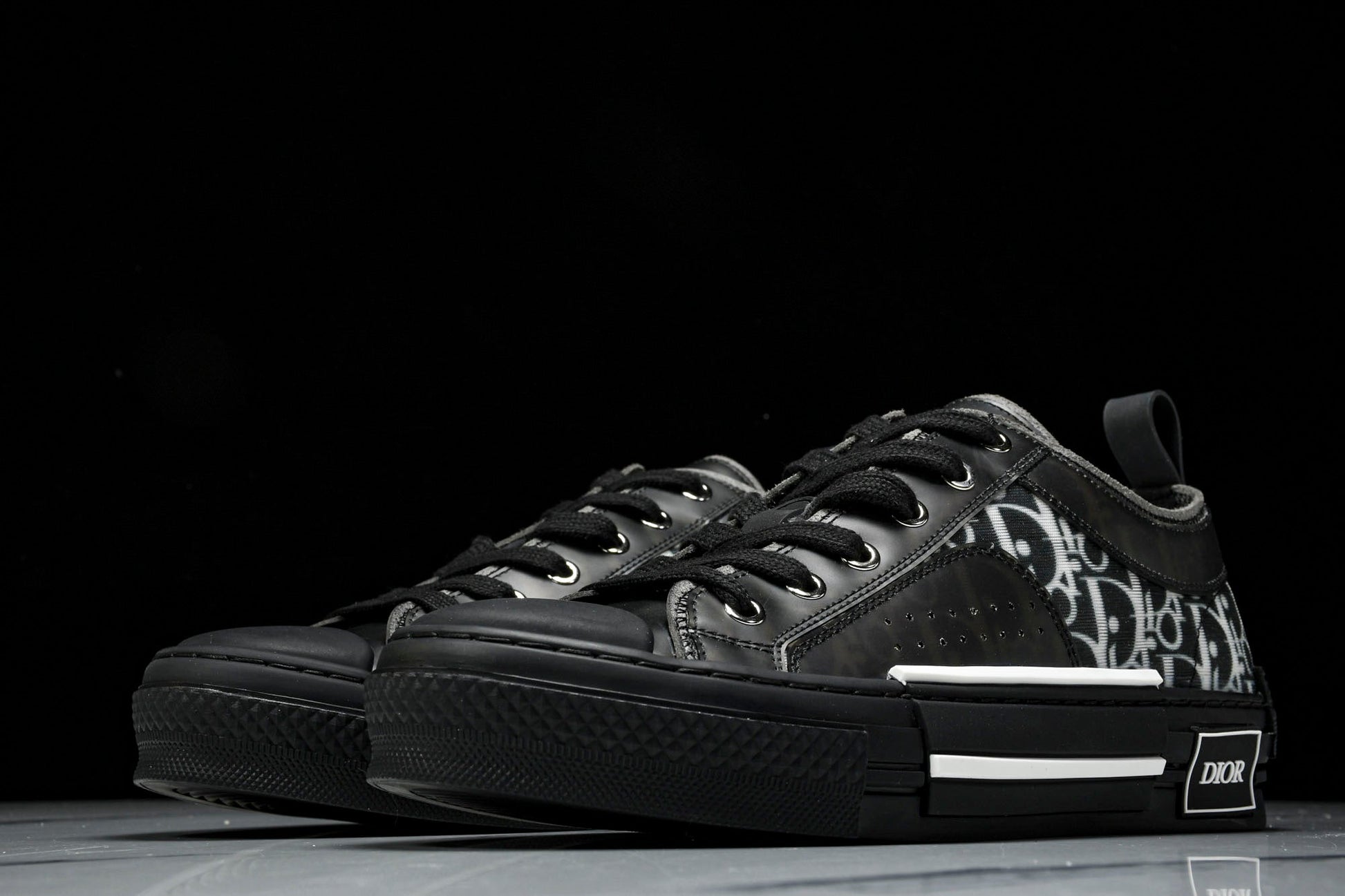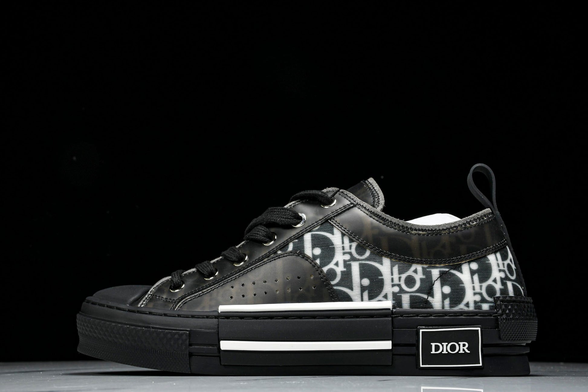 The B23 sneaker is set apart by its D1or oblique motif and elegant paneling. Essential details, such as eyelets and a lace-up front, chunky rubber sole, a rounded and reinforced toe as well as a back tab recall the codes of the classic high top and low top styles. The sneaker is further enhanced with contrasting details on the sides, including a D1or signature, and pairs easily with any casual outfit.