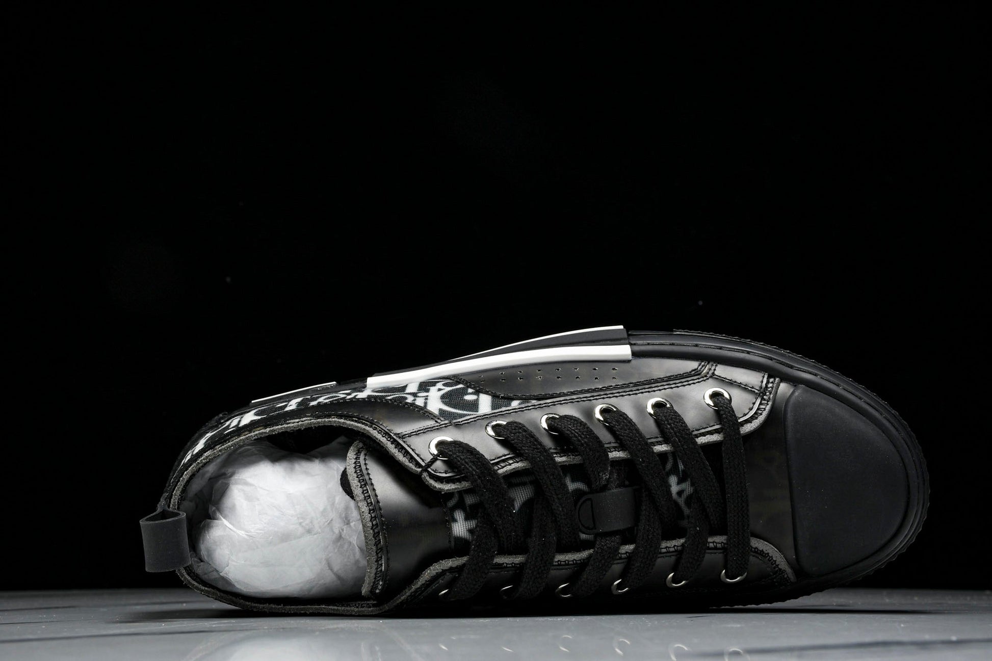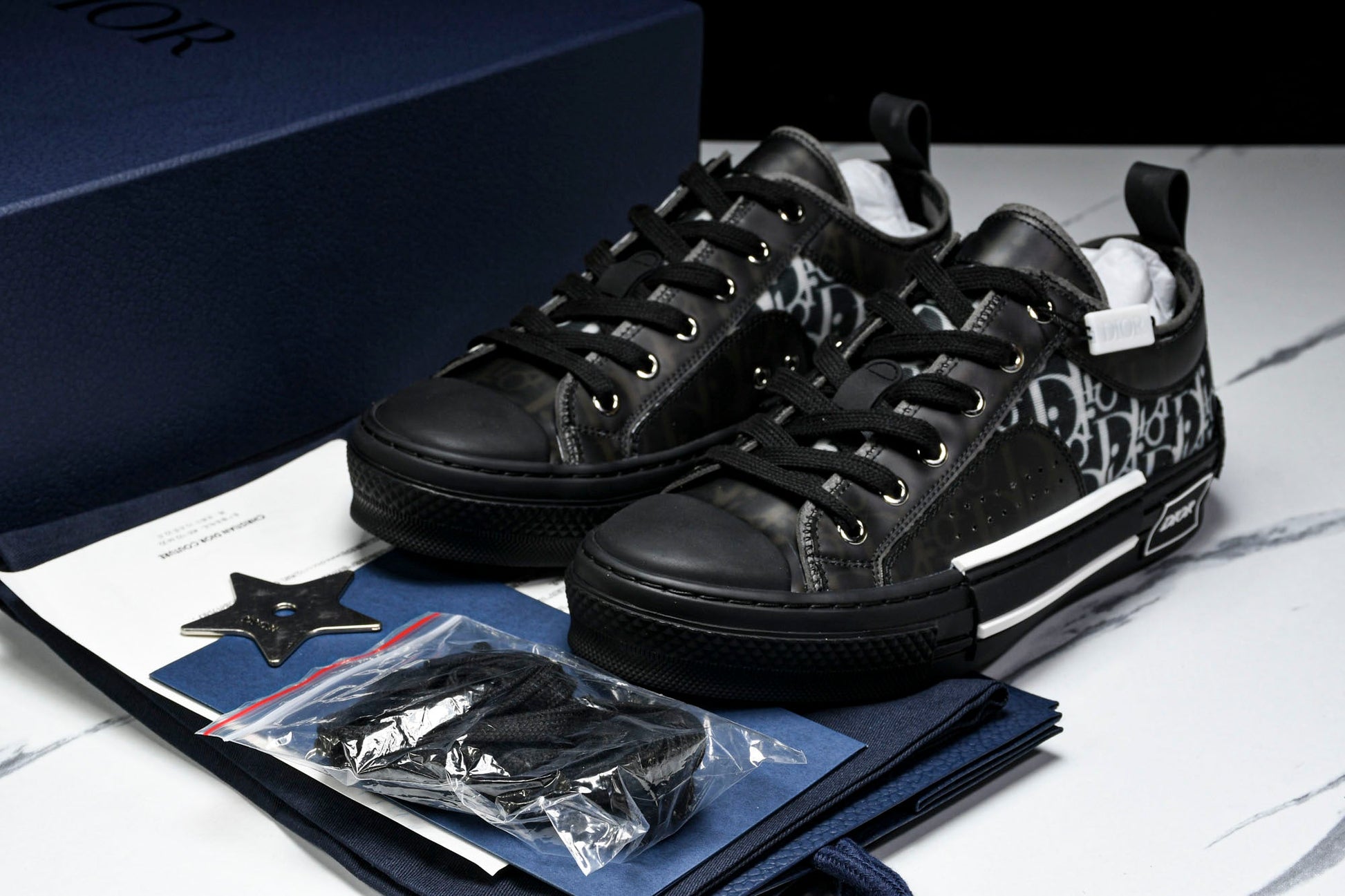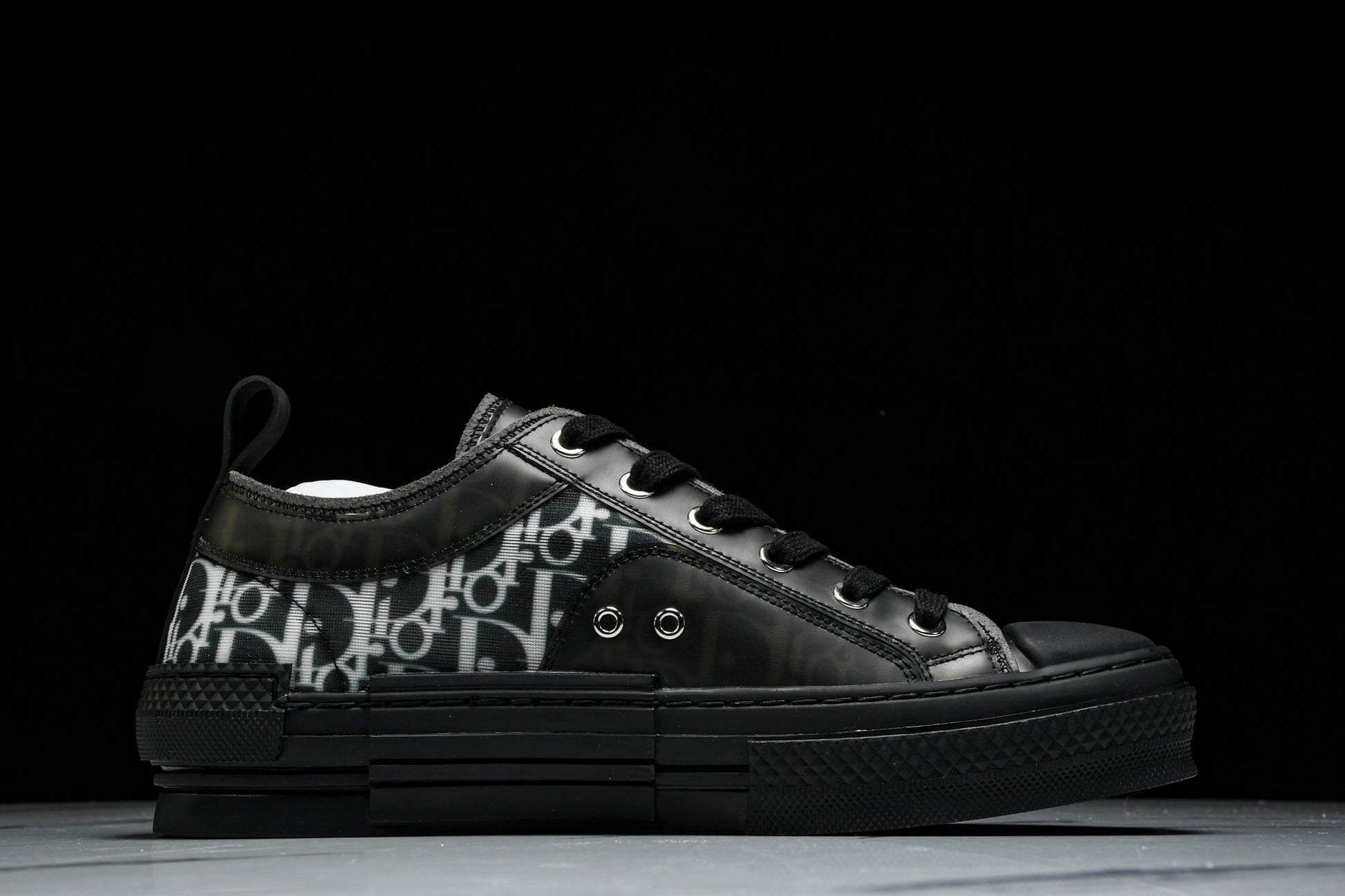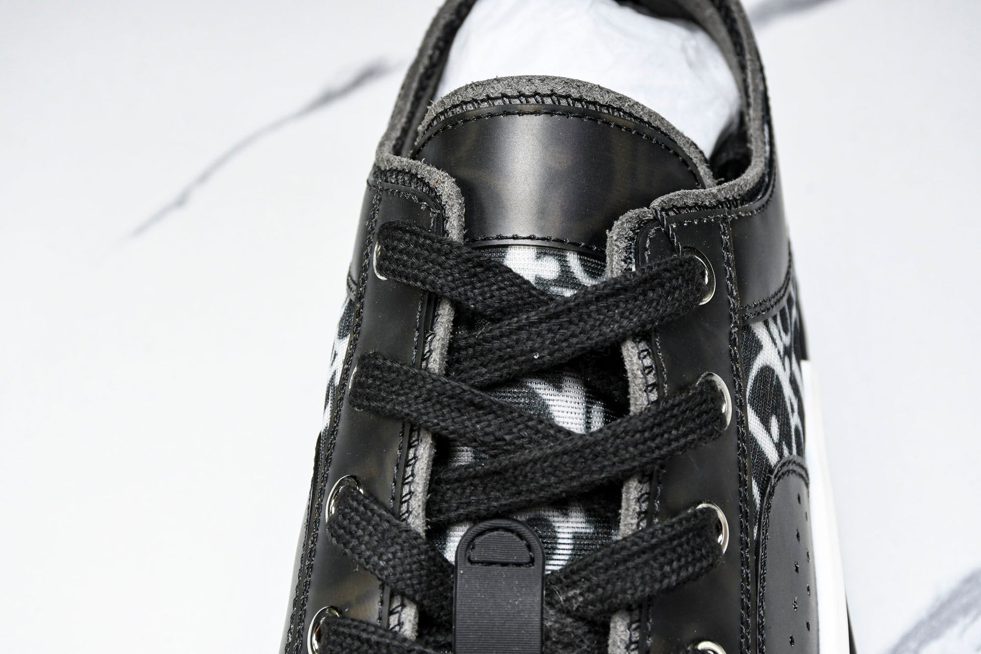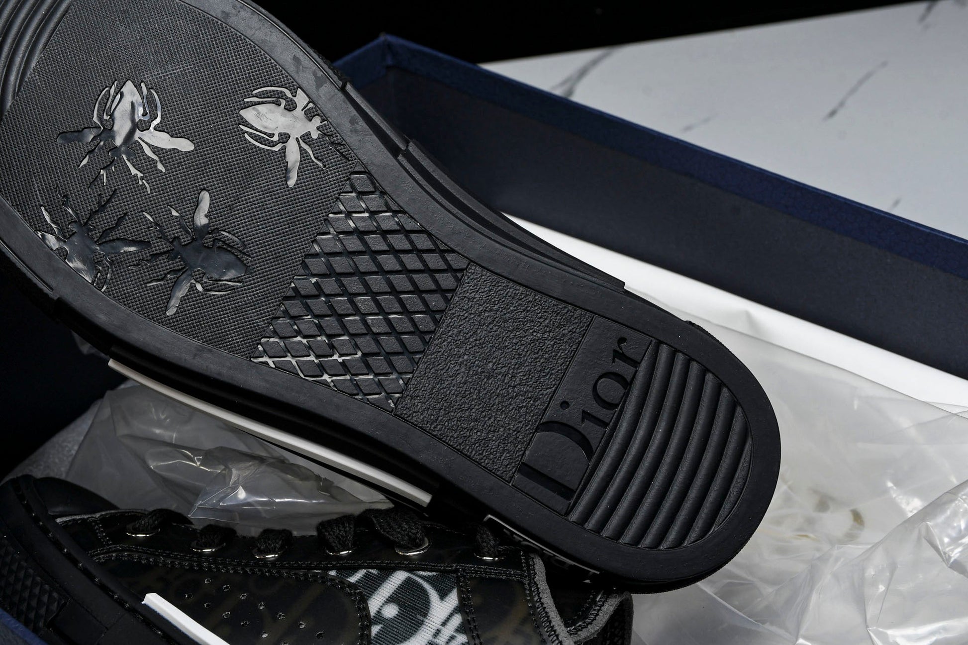 The B23 sneaker is set apart by its D1or oblique motif and elegant paneling. Essential details, such as eyelets and a lace-up front, chunky rubber sole, a rounded and reinforced toe as well as a back tab recall the codes of the classic high top and low top styles. The sneaker is further enhanced with contrasting details on the sides, including a D1or signature, and pairs easily with any casual outfit.