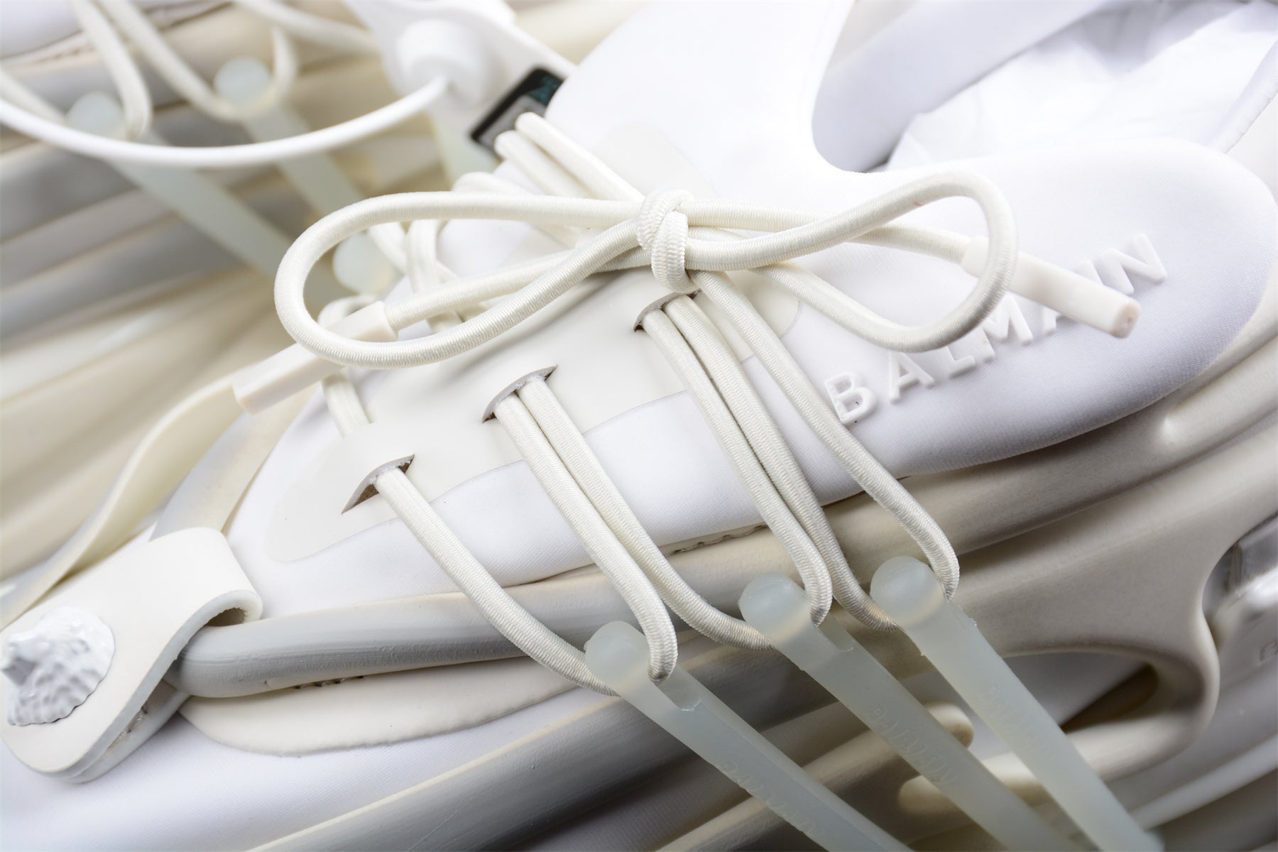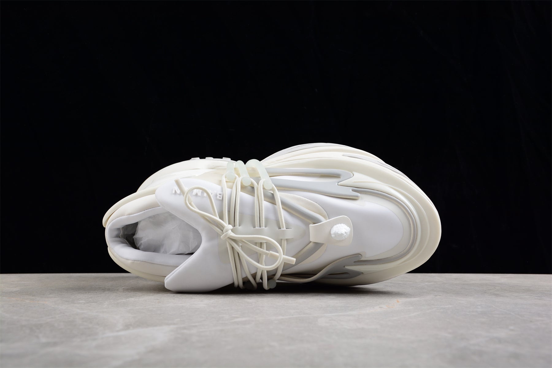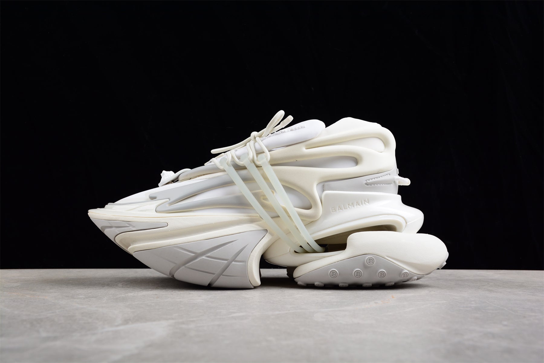 Introducing the Balmain Unicorn Low-Top 'White', designed for movement and innovation by Olivier Rousteing. Inspired by anime and sleek speed boats, these futuristic kicks feature a striking multi-sectional sole crafted with advanced shock-absorber cushioning. With three translucent bands for a customizable fit, these sneakers offer both vertical and horizontal adjustments. Adorned with Balmain's signature metallic lion's head emblem, these shoes are unmistakably part of the fashion house's legacy. Crafted with neoprene and calfskin leather, and featuring a hollow sole with air-cushion effect, the UNICORN sneakers are both stylish and comfortable.