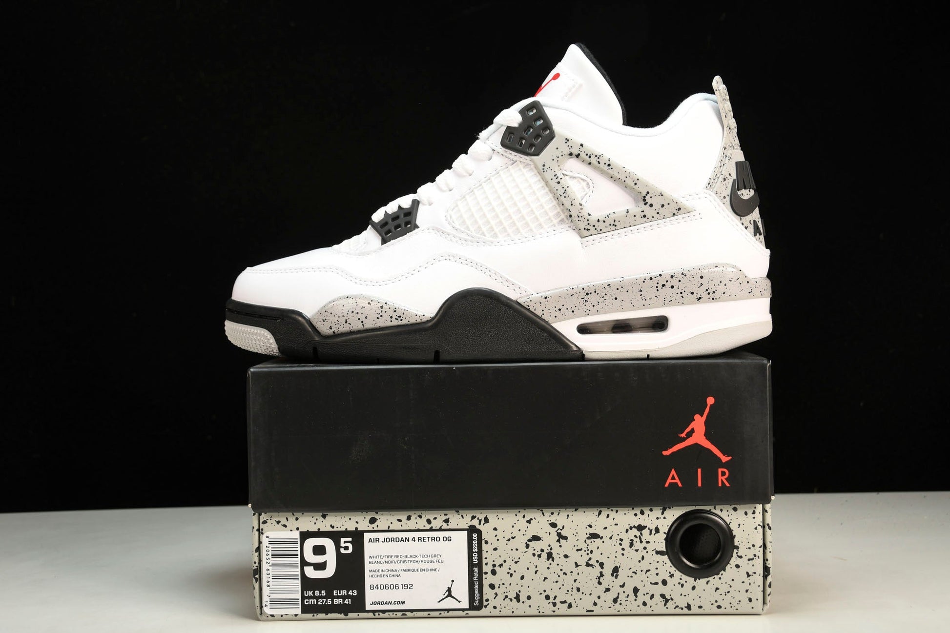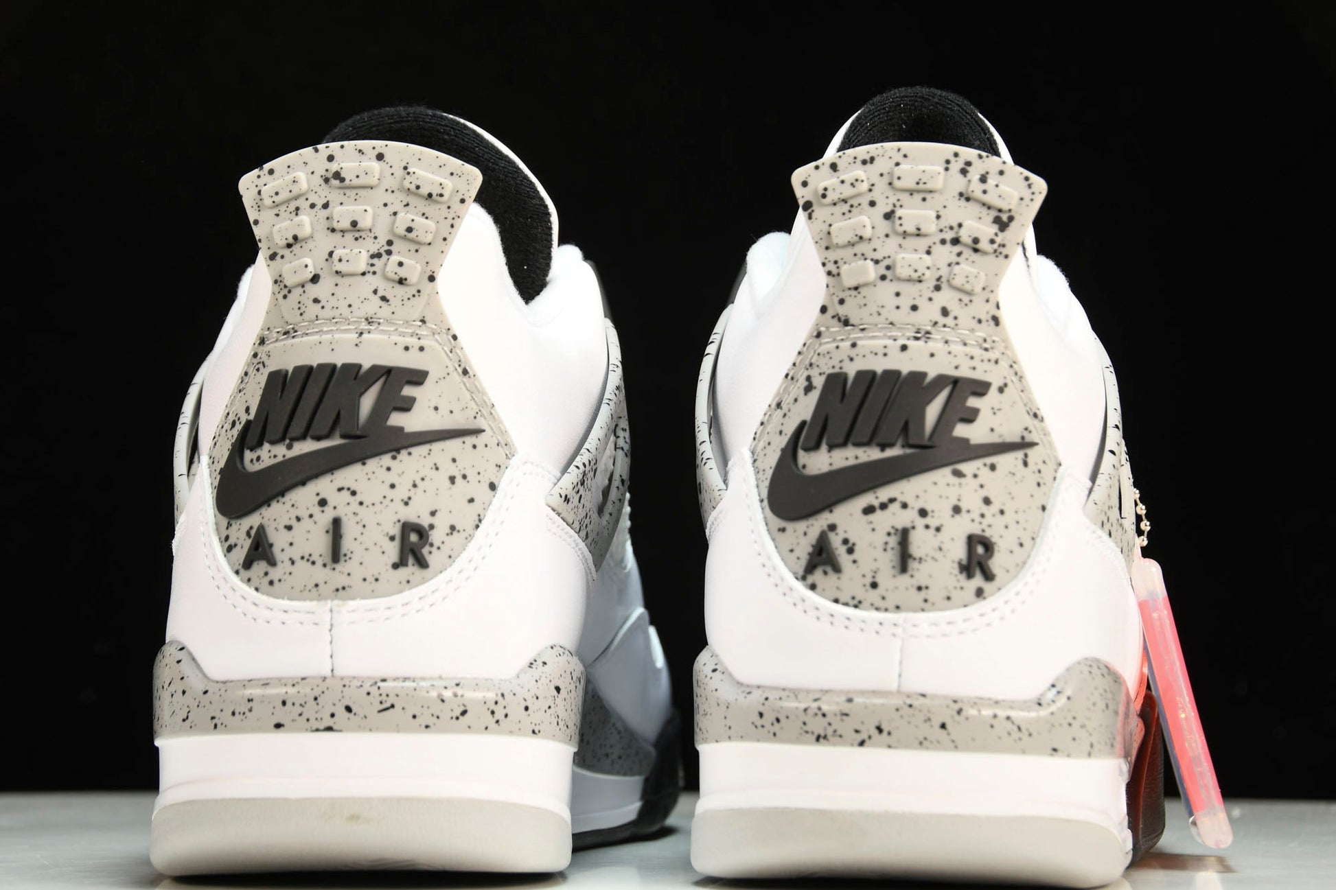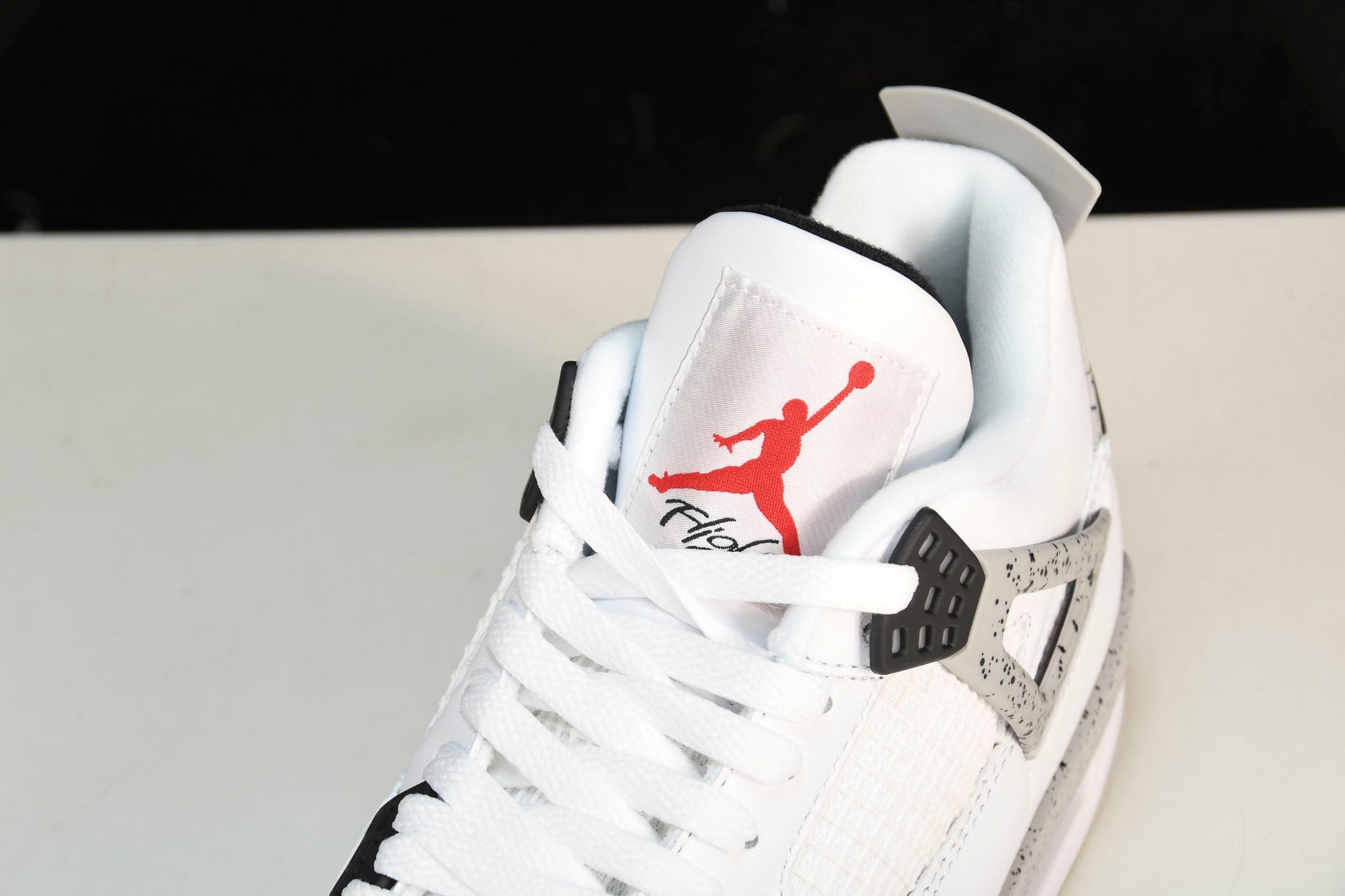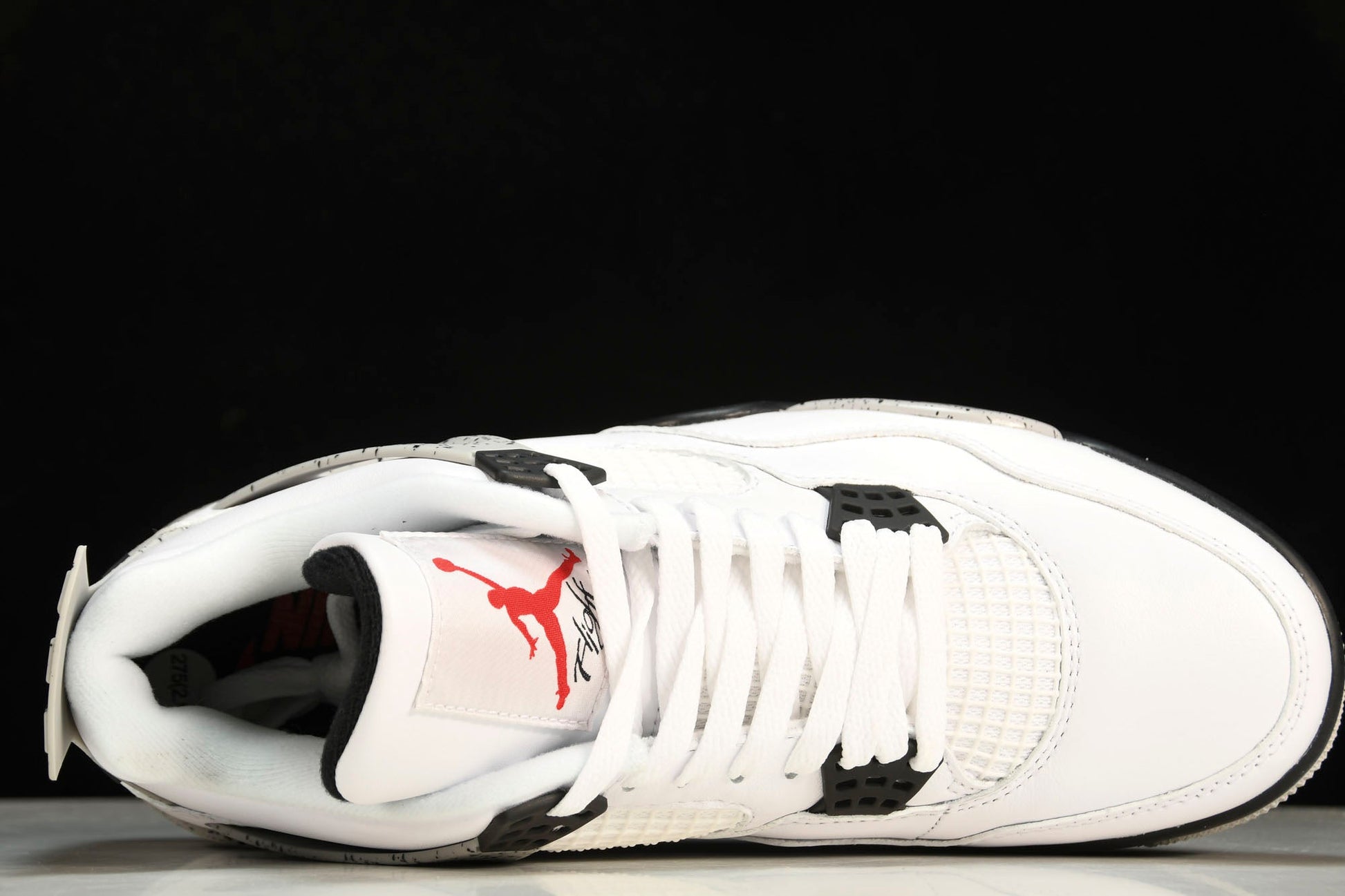 The AJ4 Retro OG 'White Cement' revives the iconic 1989 colorway in White/Fire Red/Black/Tech Gray. The white leather upper is complemented by black waffle eyestays and white mesh, with "Cement" detailing appearing as black-speckled gray accents on the midsole, wings, and heel tab. A black NK AR logo and check adorn the cement-patterned heel, while the white tongue showcases a red J logo above the "Flight" branding in black. The black insole features a red logo, and the white midsole includes visible sole cushioning, with the rubber outsole incorporating the full color palette.