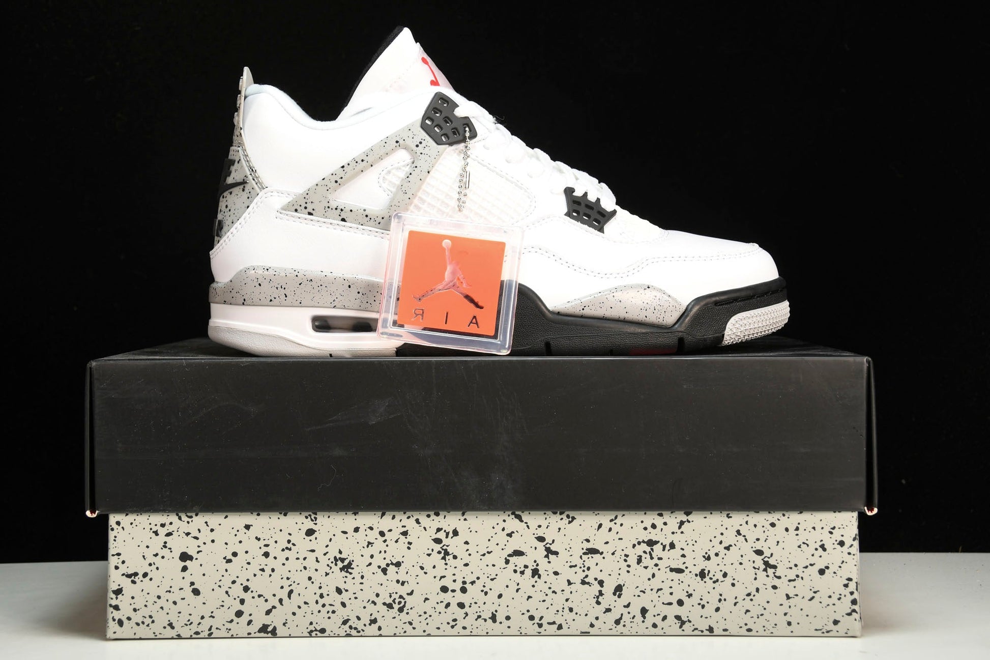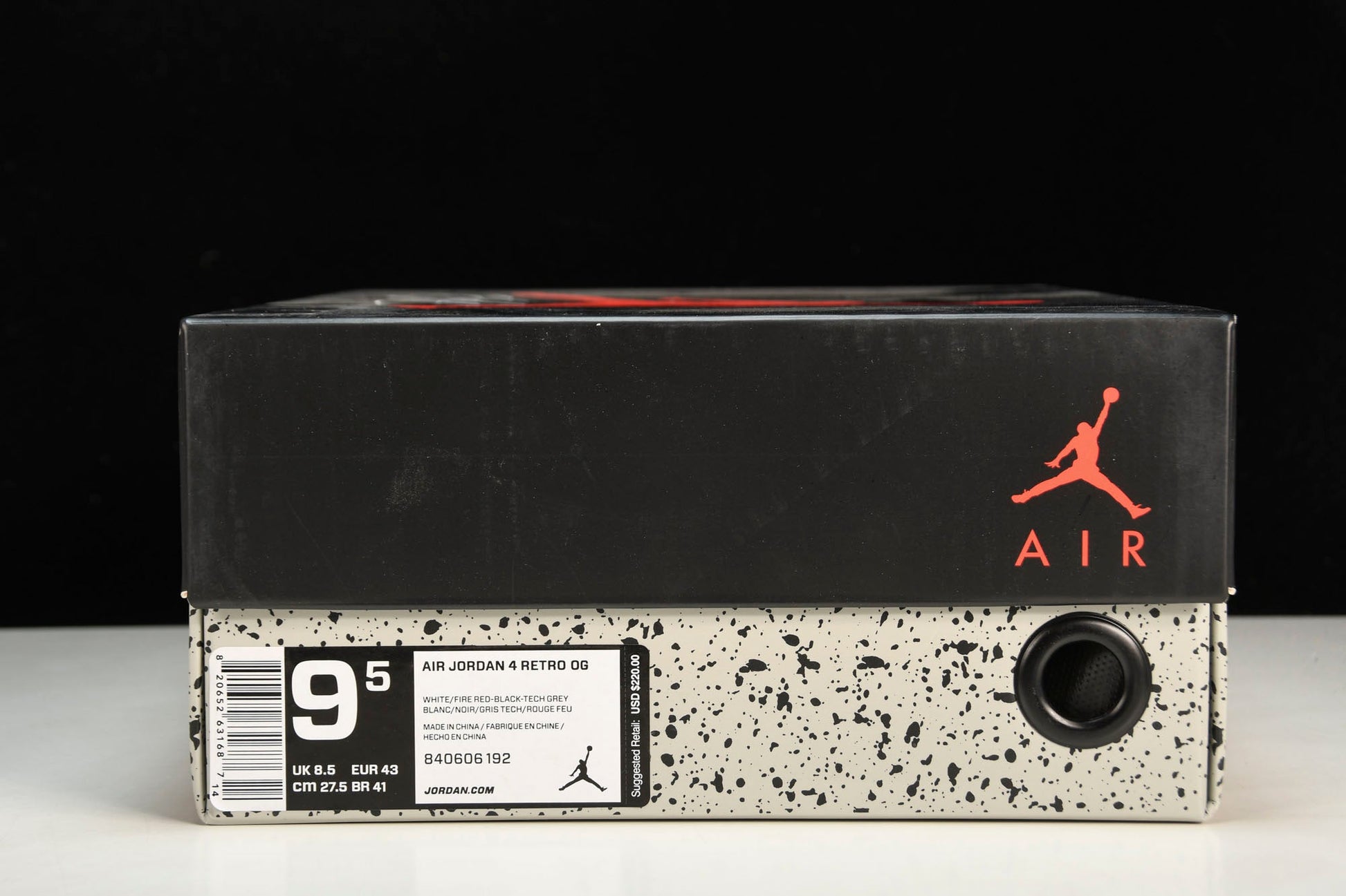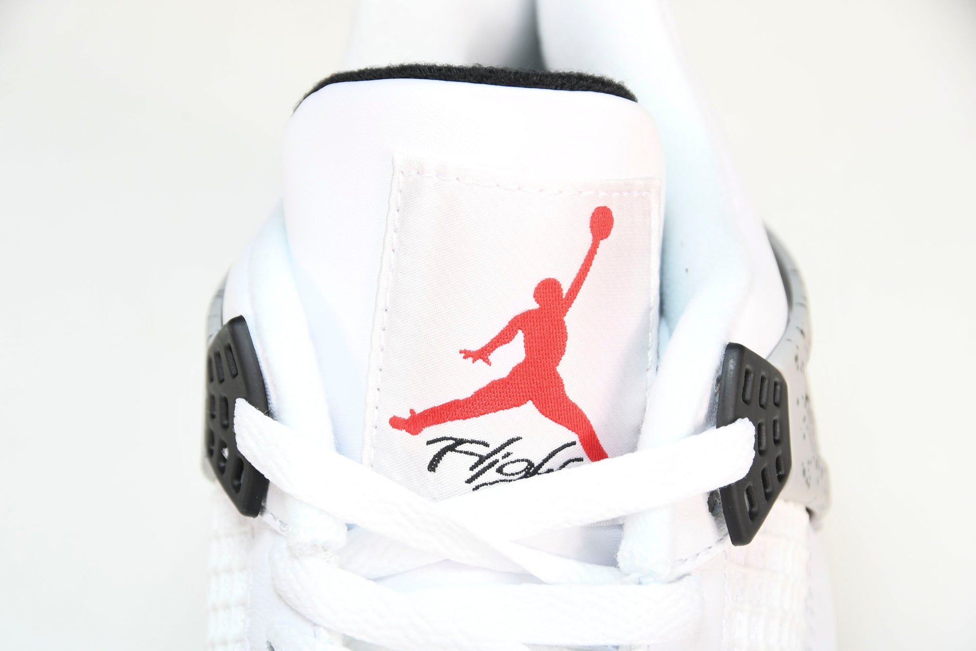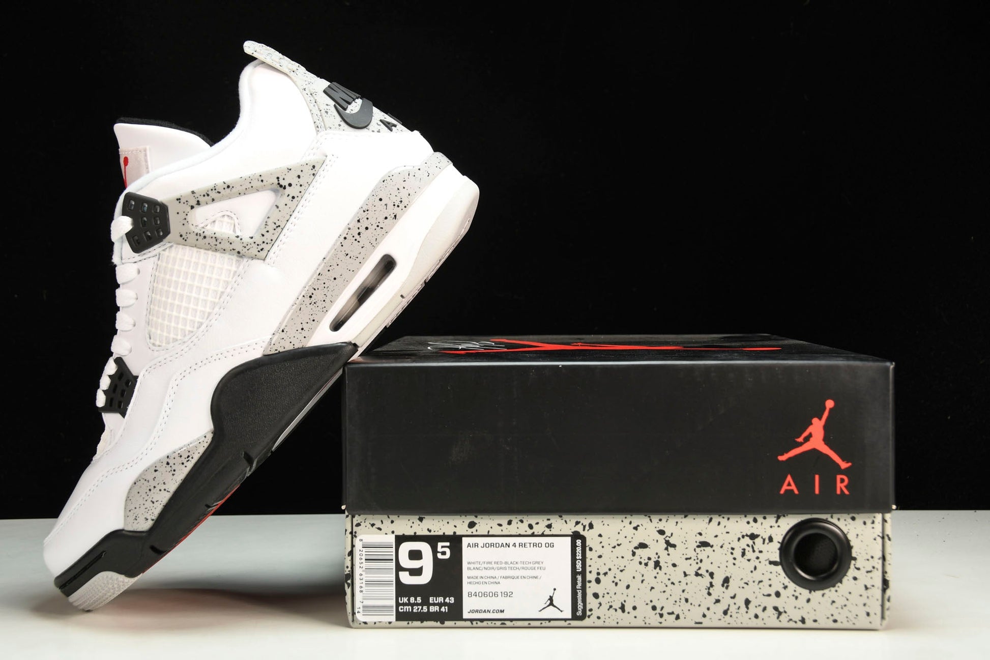 The AJ4 Retro OG 'White Cement' revives the iconic 1989 colorway in White/Fire Red/Black/Tech Gray. The white leather upper is complemented by black waffle eyestays and white mesh, with "Cement" detailing appearing as black-speckled gray accents on the midsole, wings, and heel tab. A black NK AR logo and check adorn the cement-patterned heel, while the white tongue showcases a red J logo above the "Flight" branding in black. The black insole features a red logo, and the white midsole includes visible sole cushioning, with the rubber outsole incorporating the full color palette.
