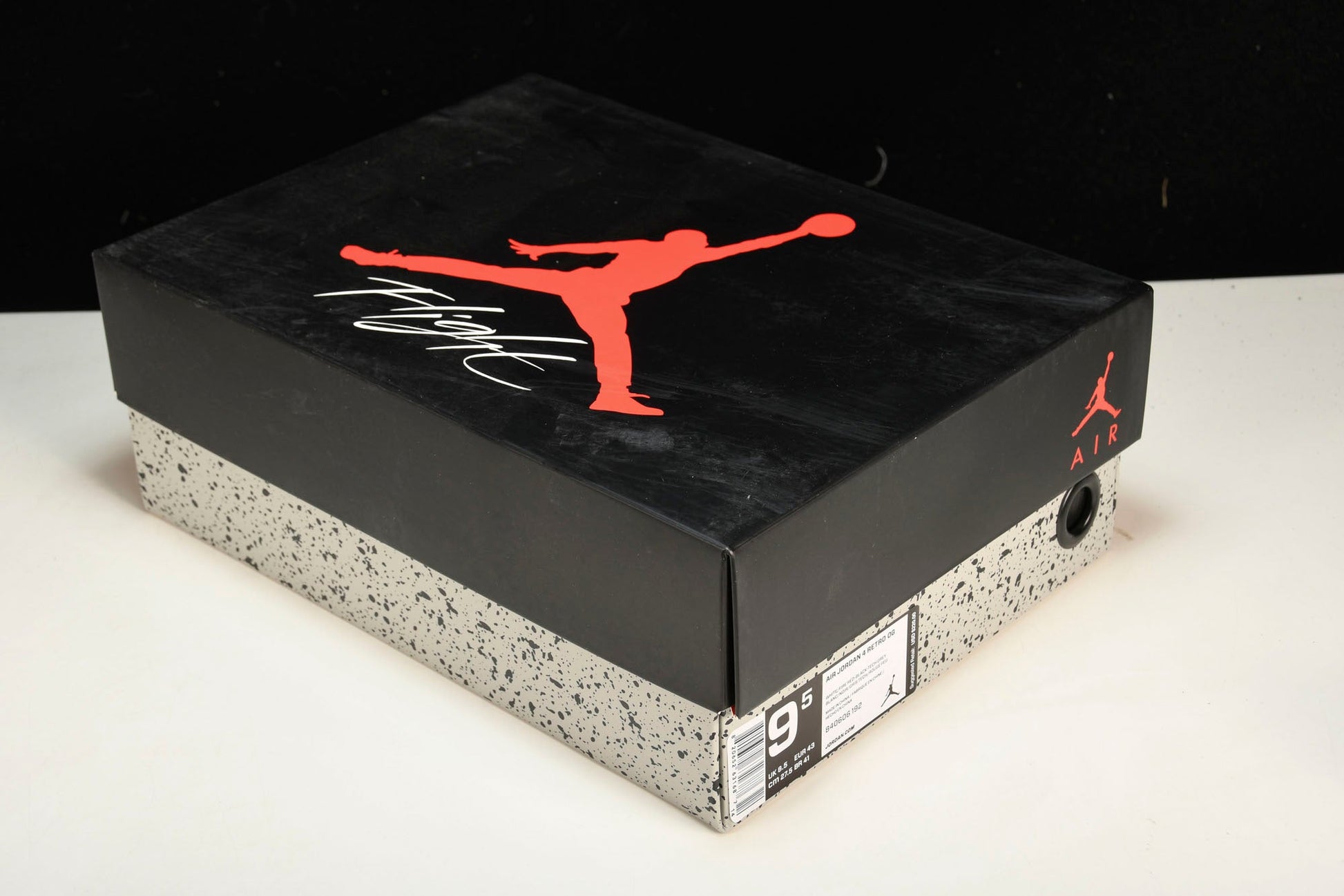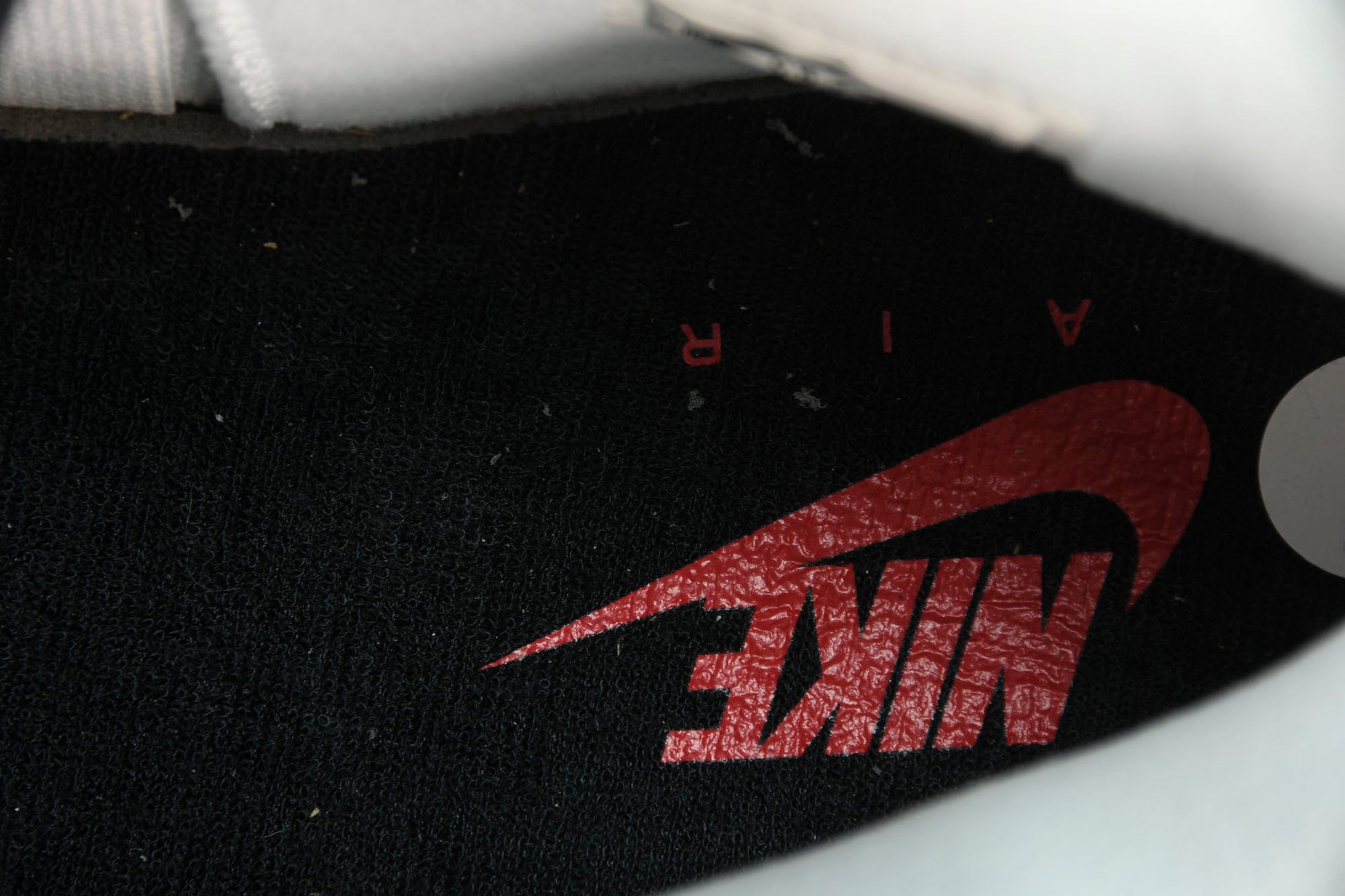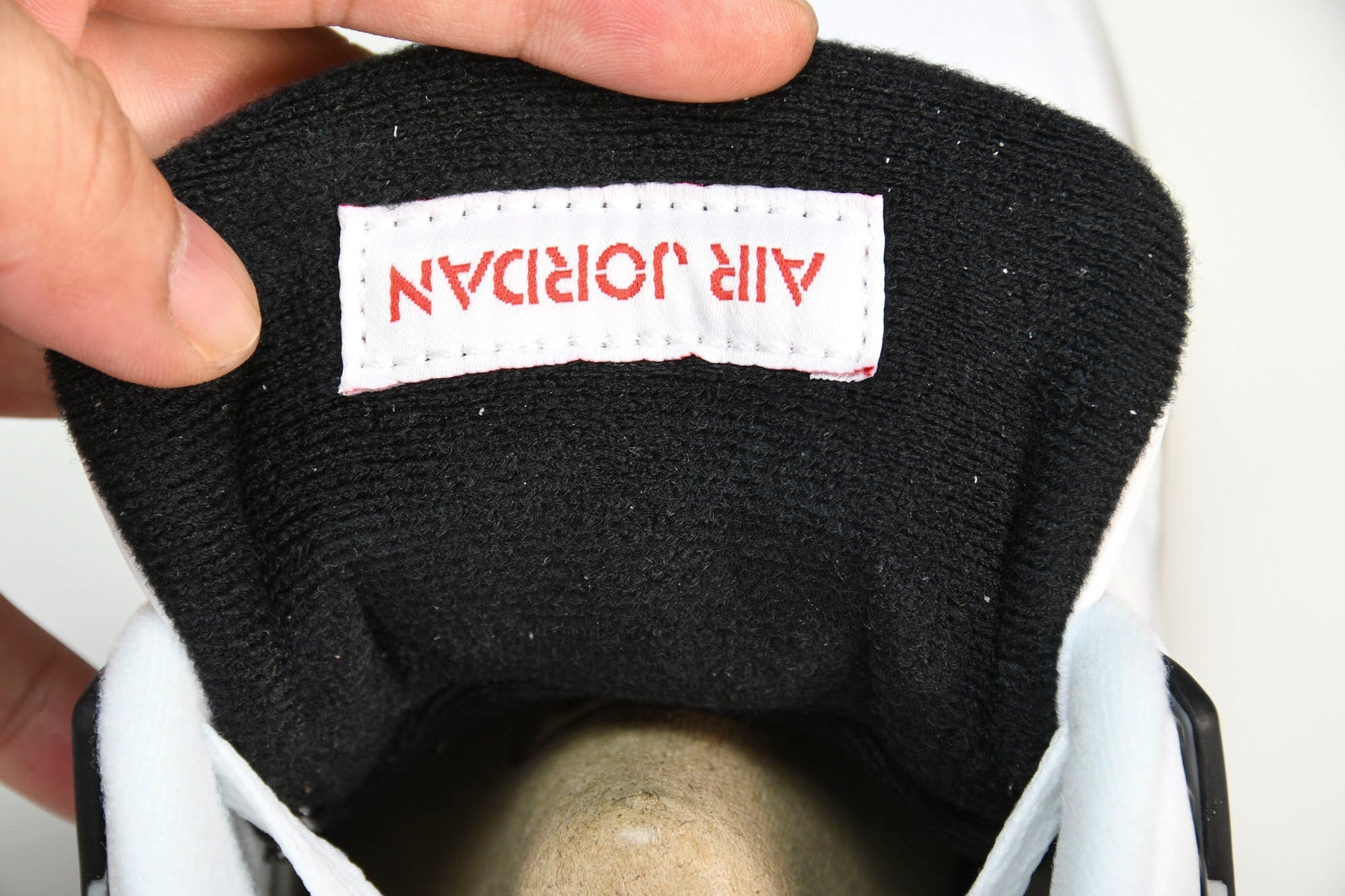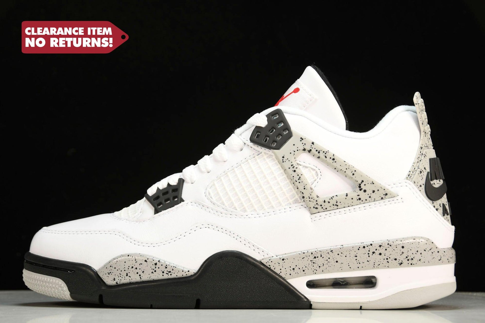 The AJ4 Retro OG 'White Cement' revives the iconic 1989 colorway in White/Fire Red/Black/Tech Gray. The white leather upper is complemented by black waffle eyestays and white mesh, with "Cement" detailing appearing as black-speckled gray accents on the midsole, wings, and heel tab. A black NK AR logo and check adorn the cement-patterned heel, while the white tongue showcases a red J logo above the "Flight" branding in black. The black insole features a red logo, and the white midsole includes visible sole cushioning, with the rubber outsole incorporating the full color palette.