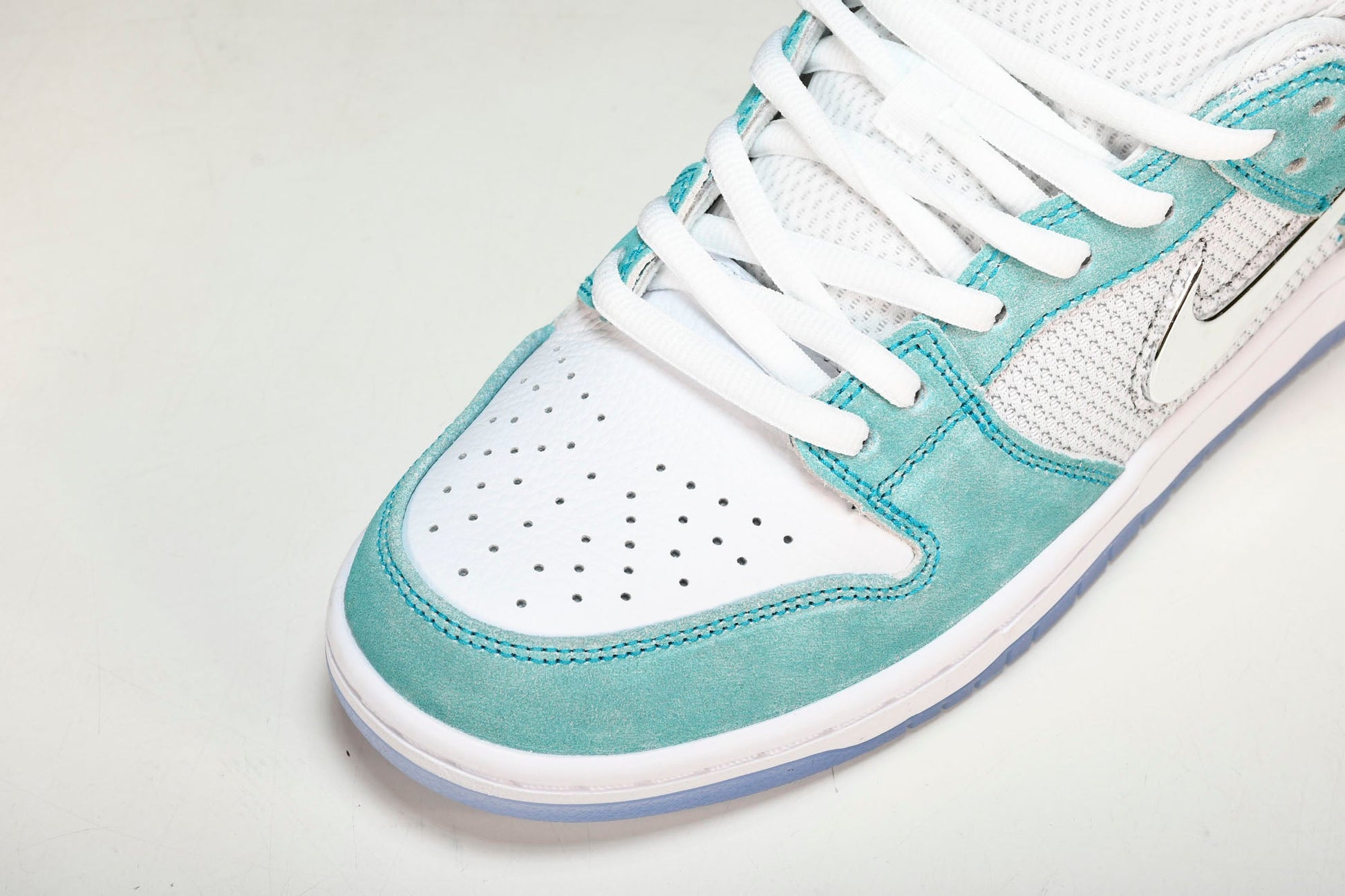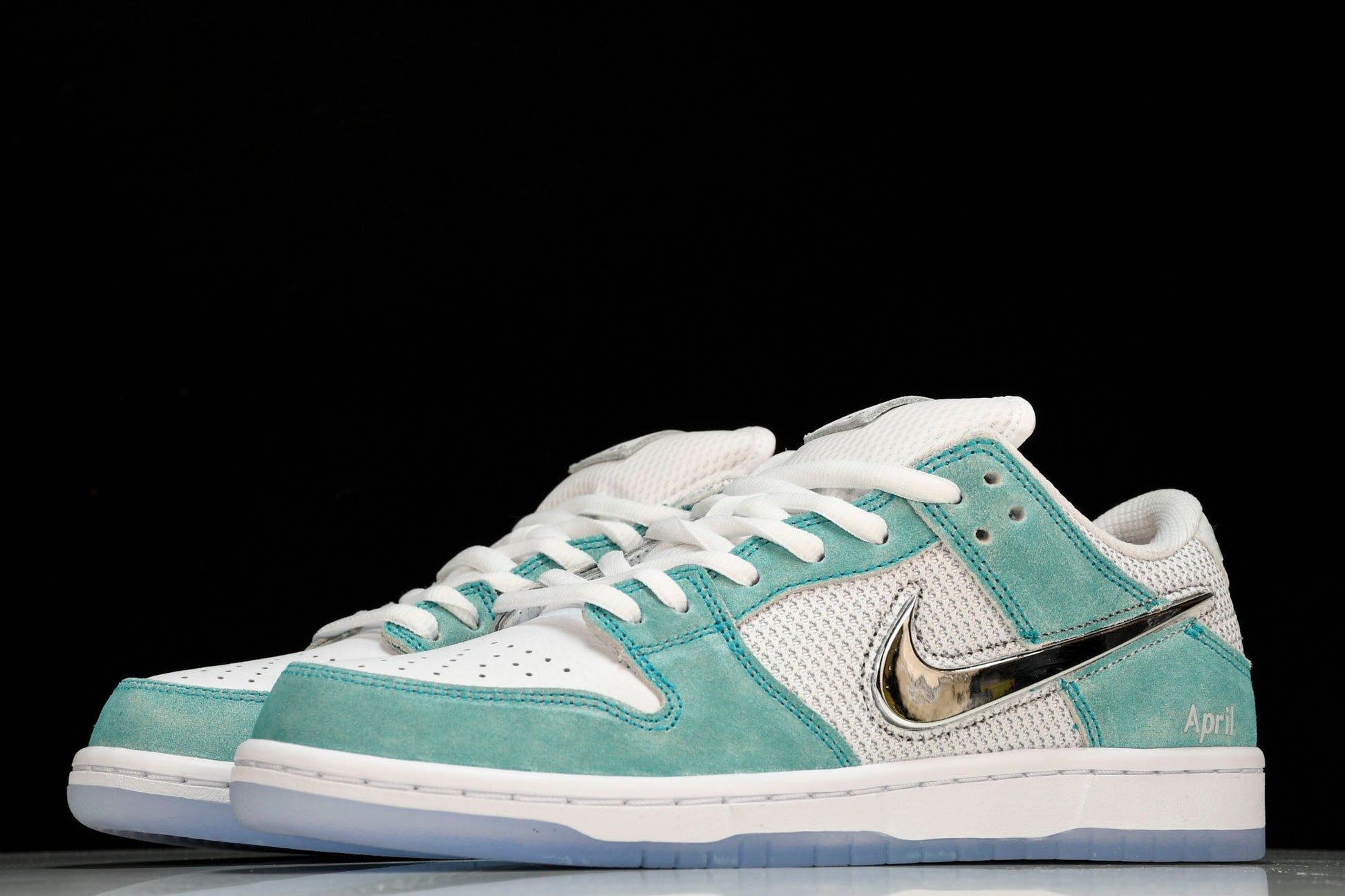 Experience a dynamic collaboration with the SB Dnk Low x April Skateboards - this distinctive sneaker seamlessly merges Australia's April Skateboards' artistic vision with the iconic SB Dnk silhouette. The shoe boasts a refreshing color palette of white, metallic silver, and turbo green, featuring white mesh details and tonal leather toes. The Turbo Green suede overlays add a striking contrast, complemented by a metallic silver check and April branding on the lateral ankle and heels. The design is completed with white midsoles and translucent outsoles, showcasing April Skateboards' signature rose logo underfoot. Step into this piece of collaborative art that celebrates the fusion of skate culture and creative expression.