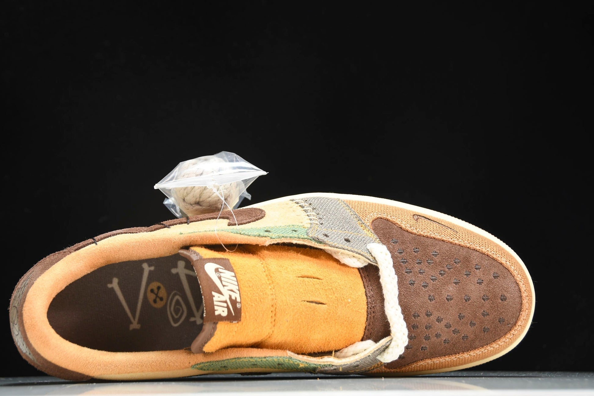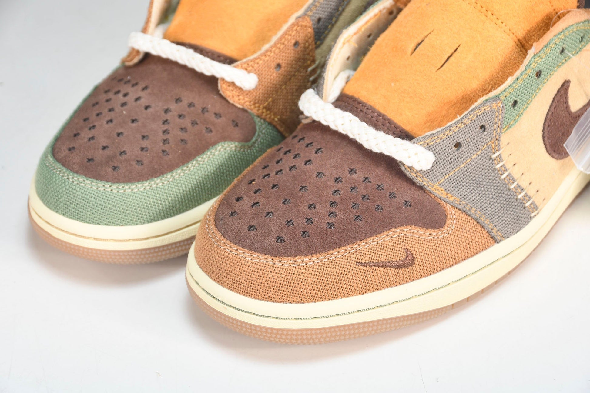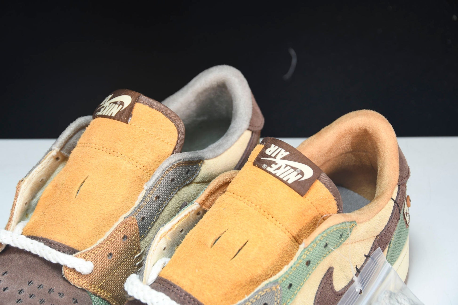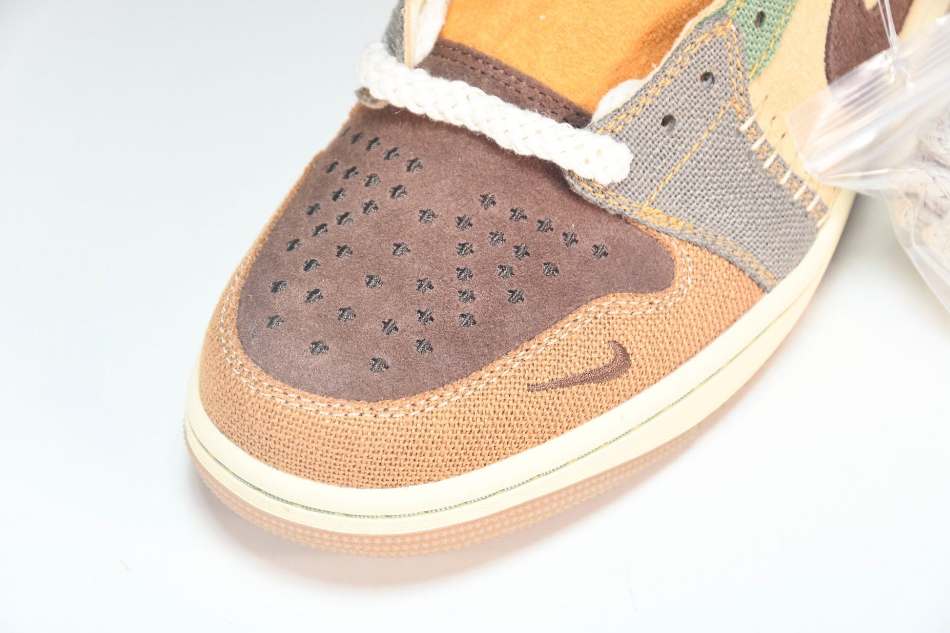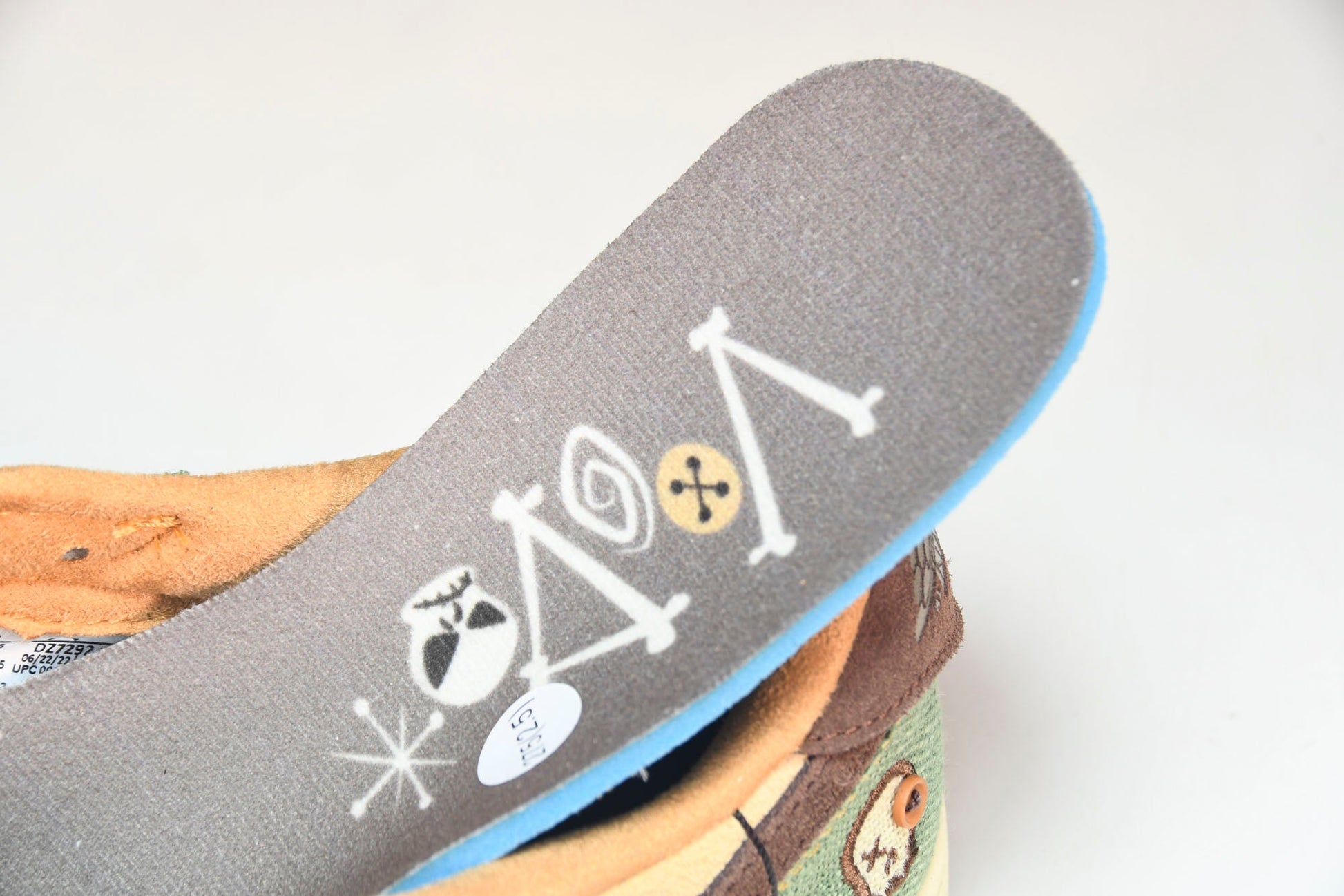 The Zion Williamson x AJ1 Retro Low OG ‘Voodoo’ shares a New Orleans-inspired theme with a companion Zion 2 colorway from June 2022. Braided rope laces secure the upper, featuring beige suede quarter panels and a brown suede toe box. Burlap-like overlays feature raw edges and mismatched color blocking in light brown, Oil Green and Fossil. In addition to exposed deco stitching, unique accents include an inverted mini-tick on the forefoot and an embroidered voodoo-doll graphic on the lateral heel. An upside-down W logo is stamped on the brown suede heel tab, which lifts up to reveal mismatched ‘Voodoo’ and ‘Zion’ graphics on the interior side.