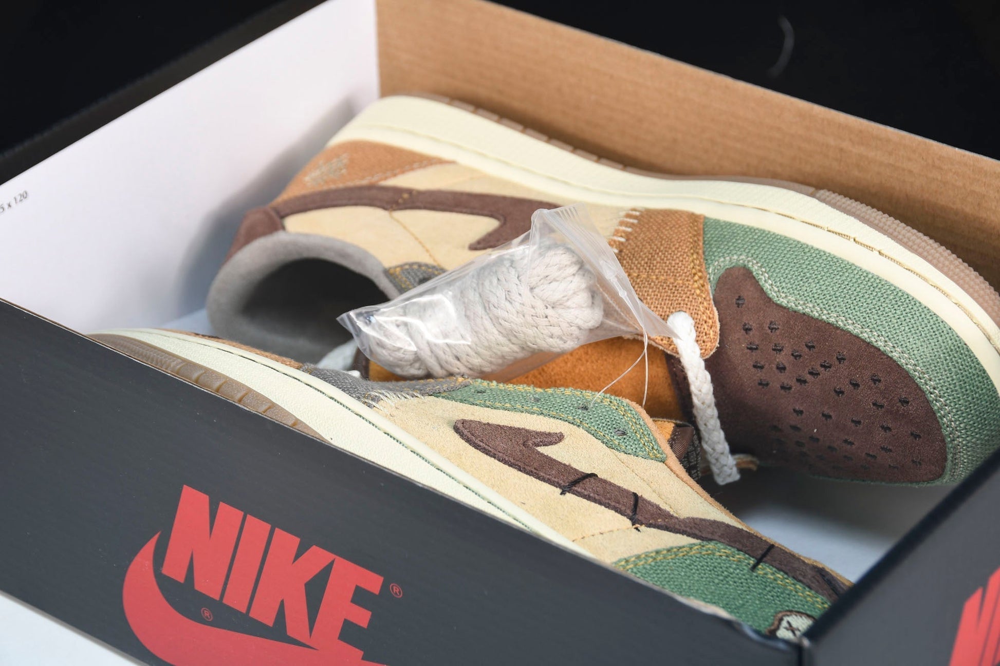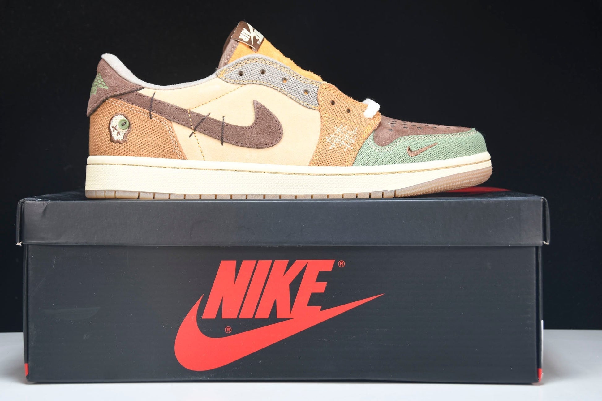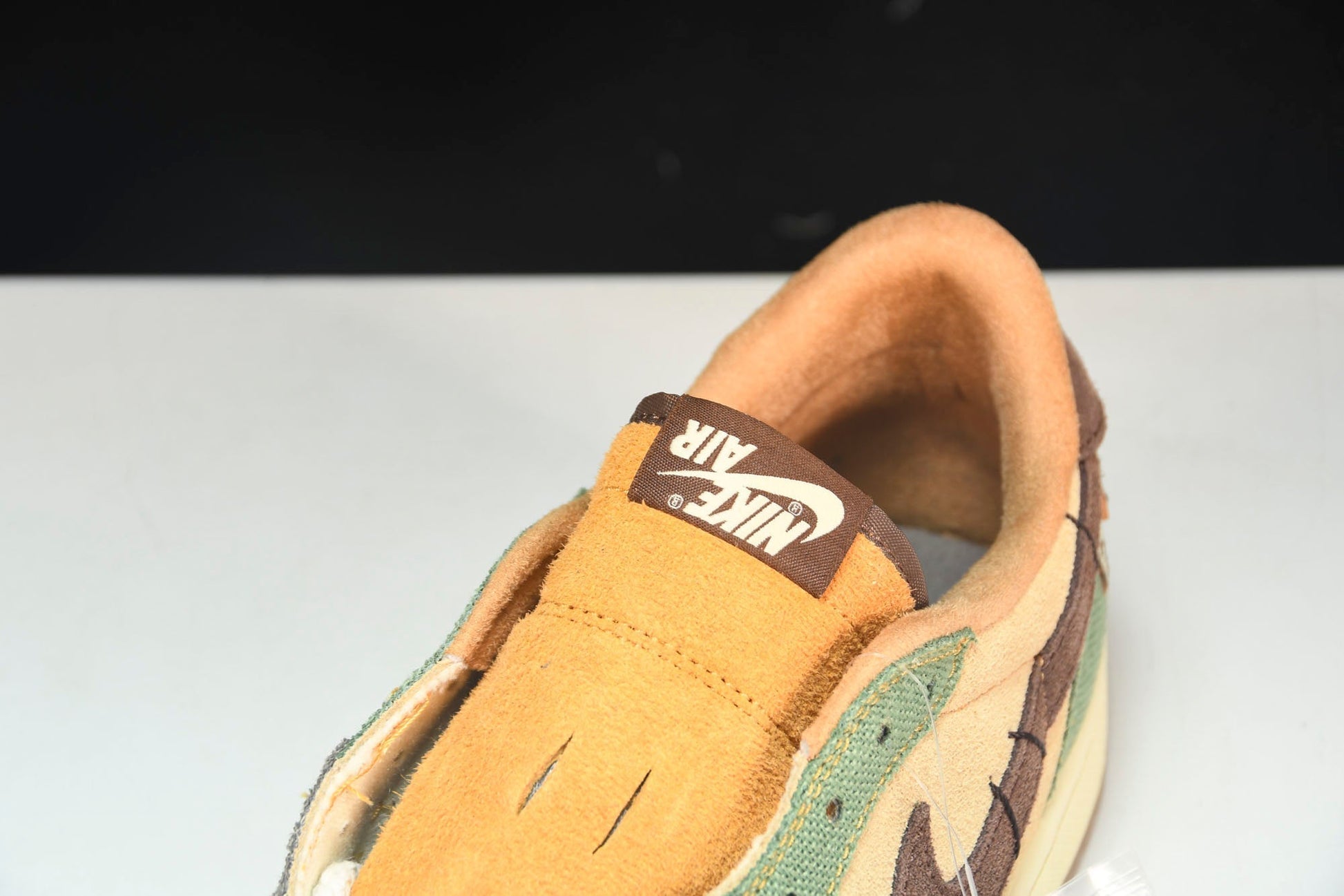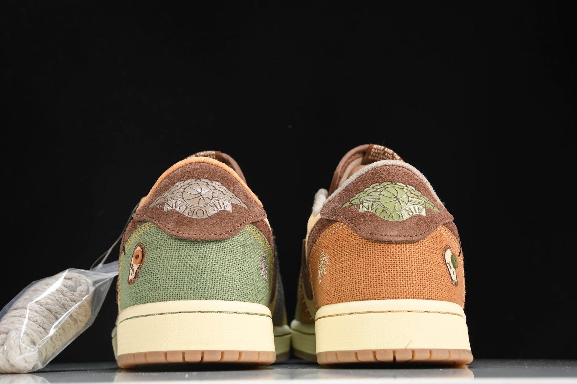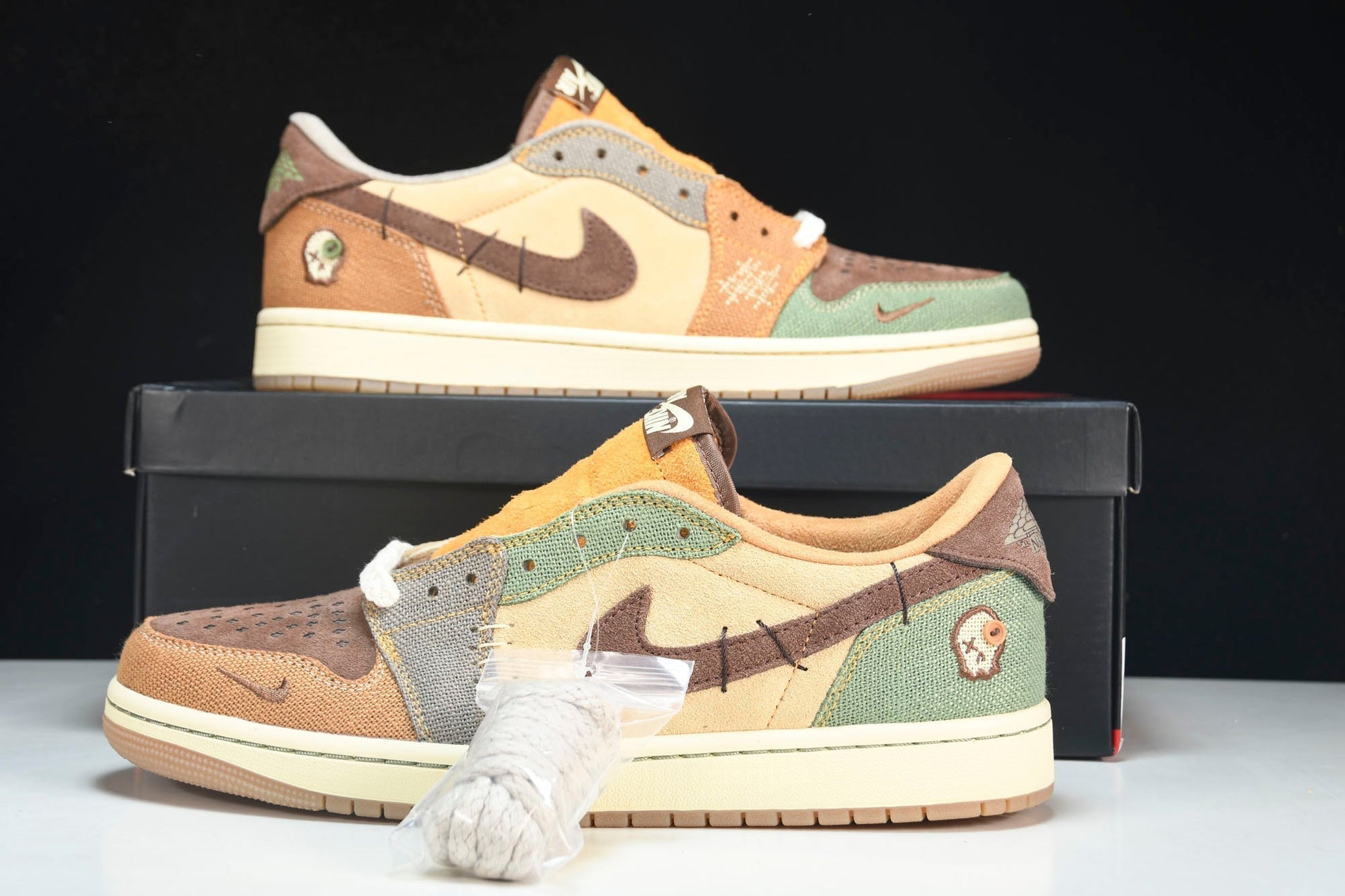 The Zion Williamson x AJ1 Retro Low OG ‘Voodoo’ shares a New Orleans-inspired theme with a companion Zion 2 colorway from June 2022. Braided rope laces secure the upper, featuring beige suede quarter panels and a brown suede toe box. Burlap-like overlays feature raw edges and mismatched color blocking in light brown, Oil Green and Fossil. In addition to exposed deco stitching, unique accents include an inverted mini-tick on the forefoot and an embroidered voodoo-doll graphic on the lateral heel. An upside-down W logo is stamped on the brown suede heel tab, which lifts up to reveal mismatched ‘Voodoo’ and ‘Zion’ graphics on the interior side.