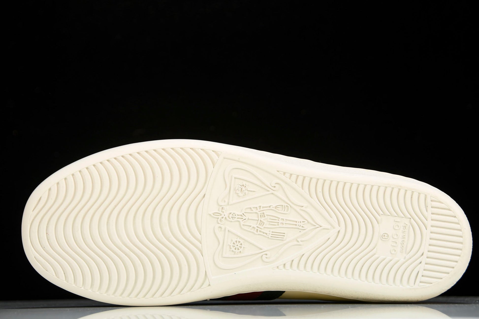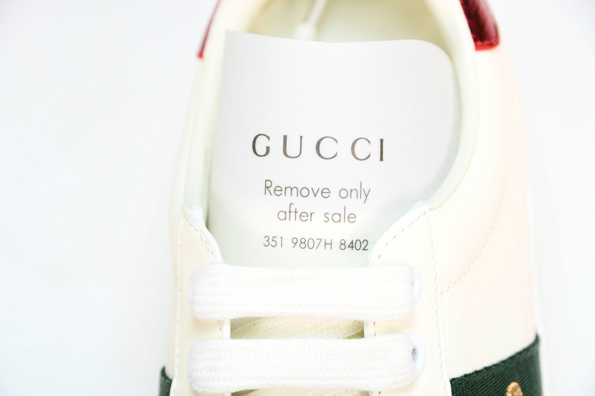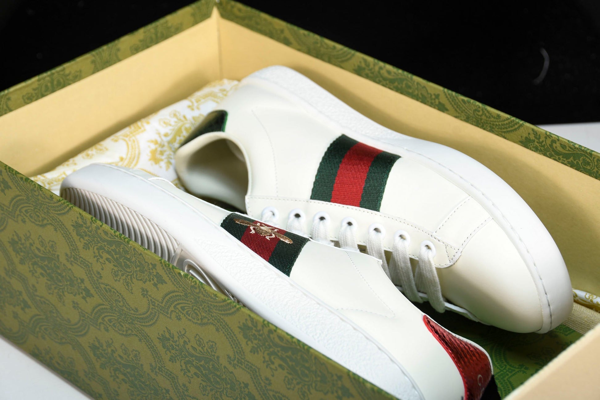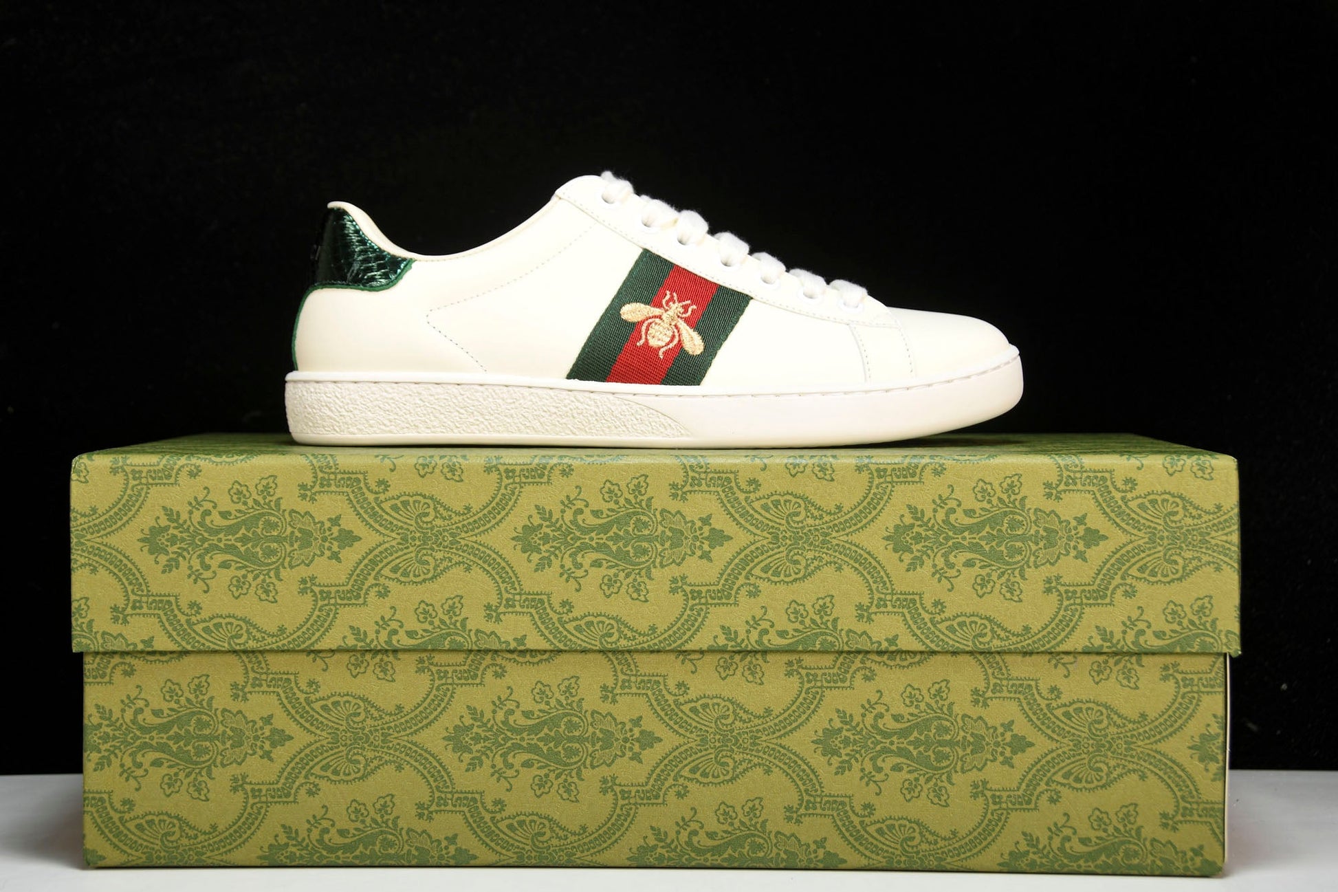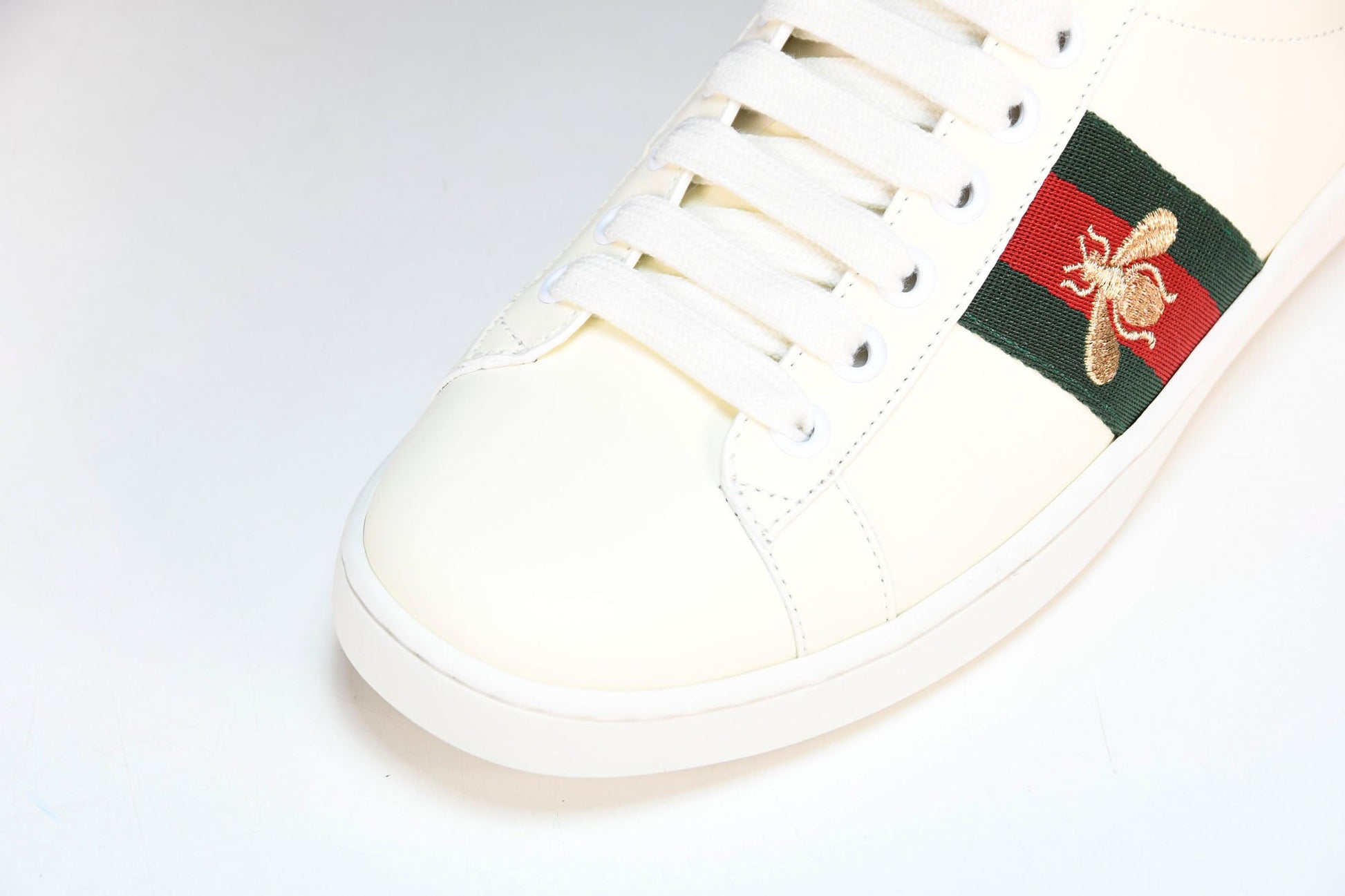 The Guссi Ace 'Bee' sneakers epitomize the perfect fusion of luxury and contemporary style. Crafted from premium materials, these iconic low-top sneakers feature the signature green and red web stripes along with an intricately embroidered bee motif, creating a distinctive and eye-catching design. The green and red theme continues with the mismatched back heels. The clean white leather base adds a timeless touch, ensuring versatility in styling. Meticulously crafted with Guссi's impeccable attention to detail, the Ace 'Bee' sneakers stand as a symbol of elegance and fashion-forward sophistication. Elevate your footwear collection with this statement piece that effortlessly blends classic Guссi aesthetics with modern flair.