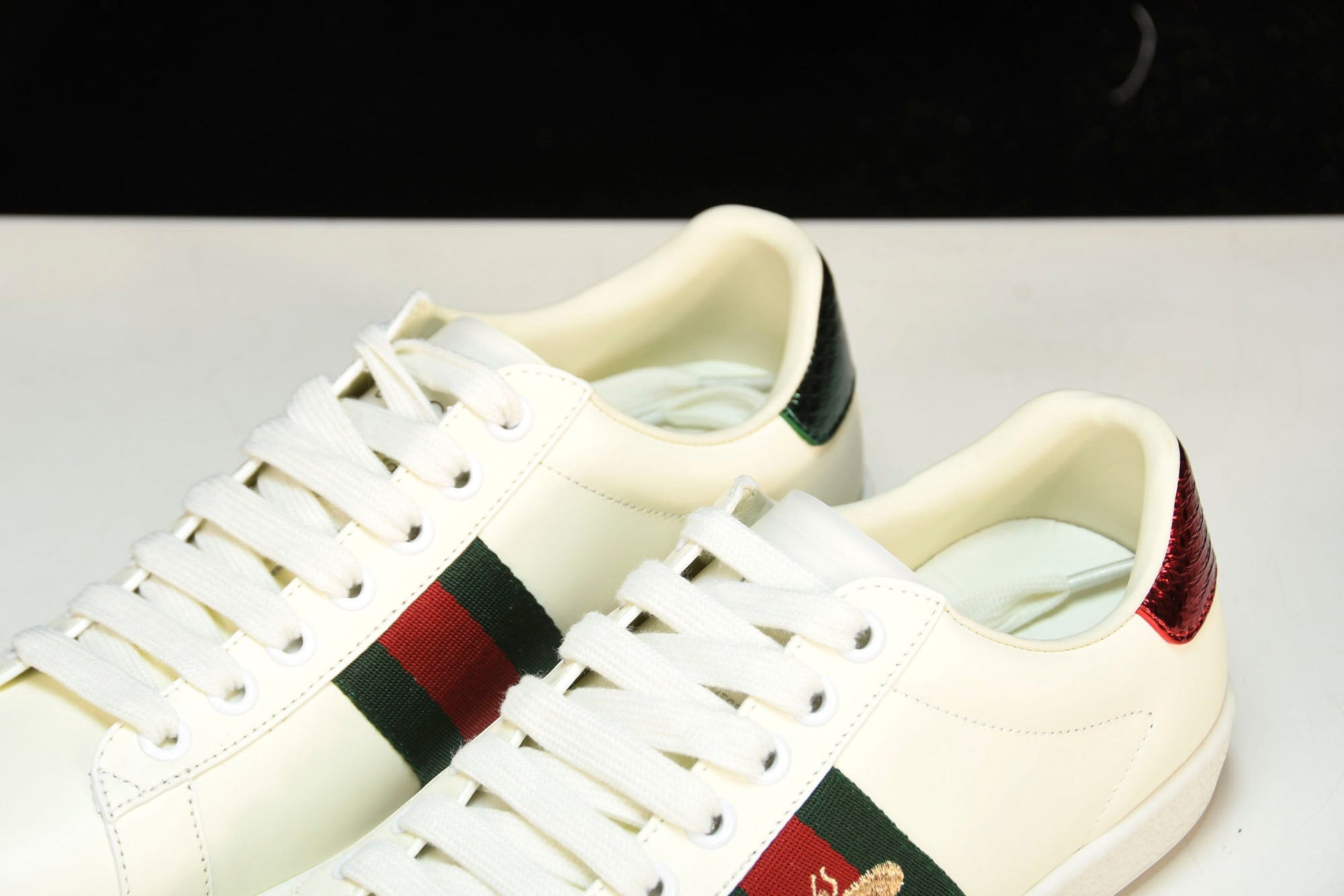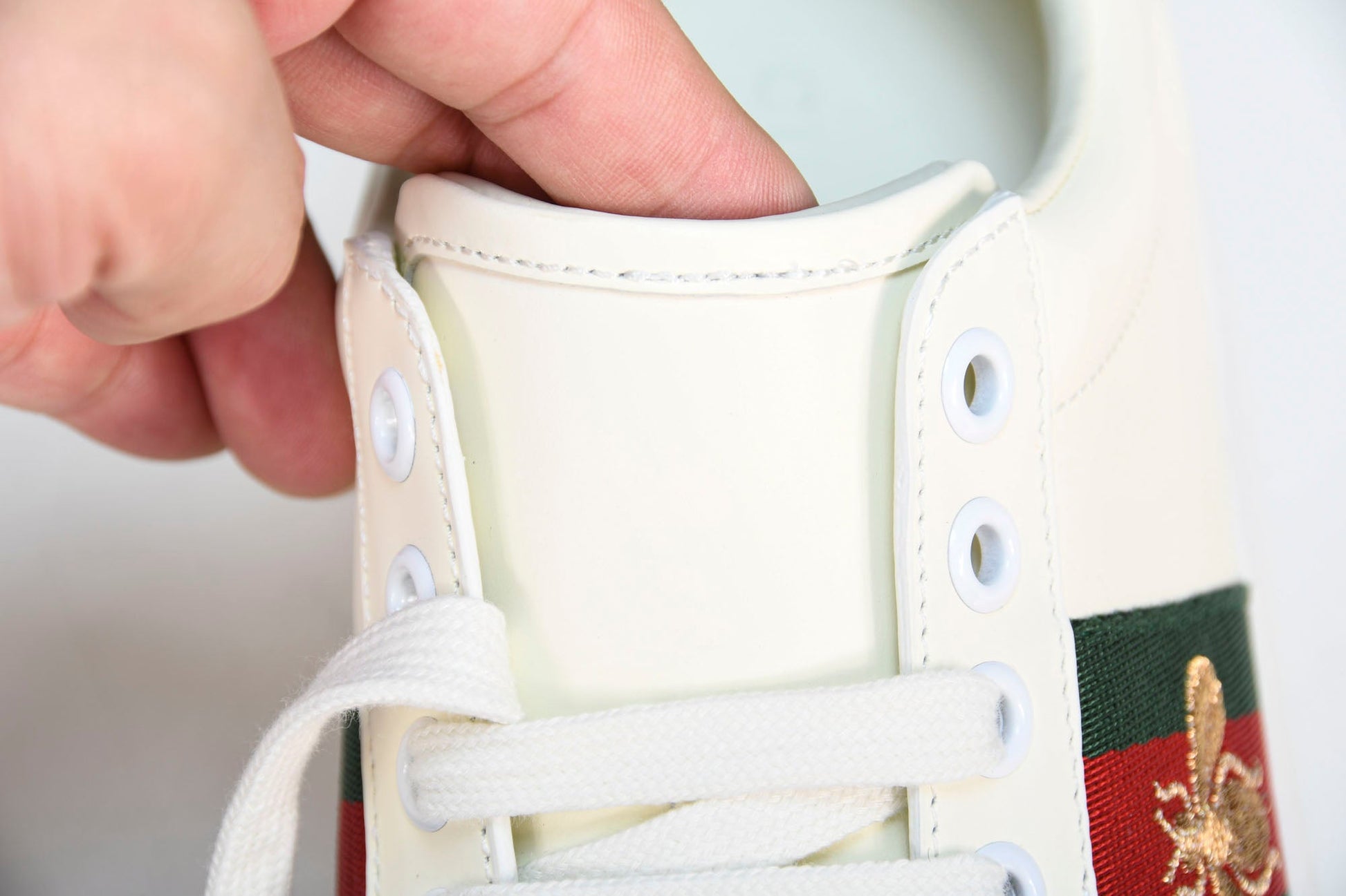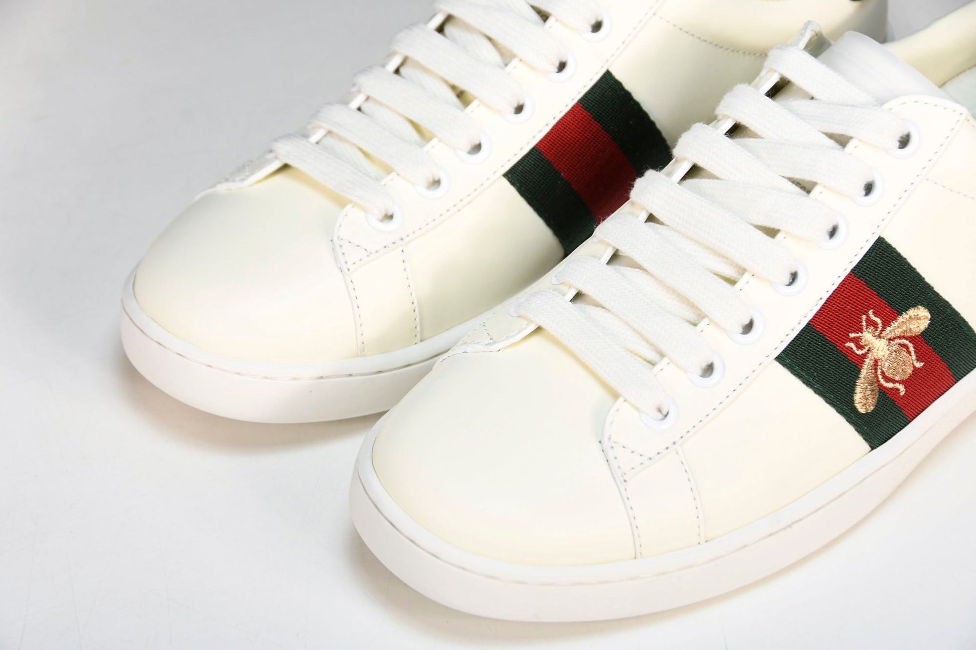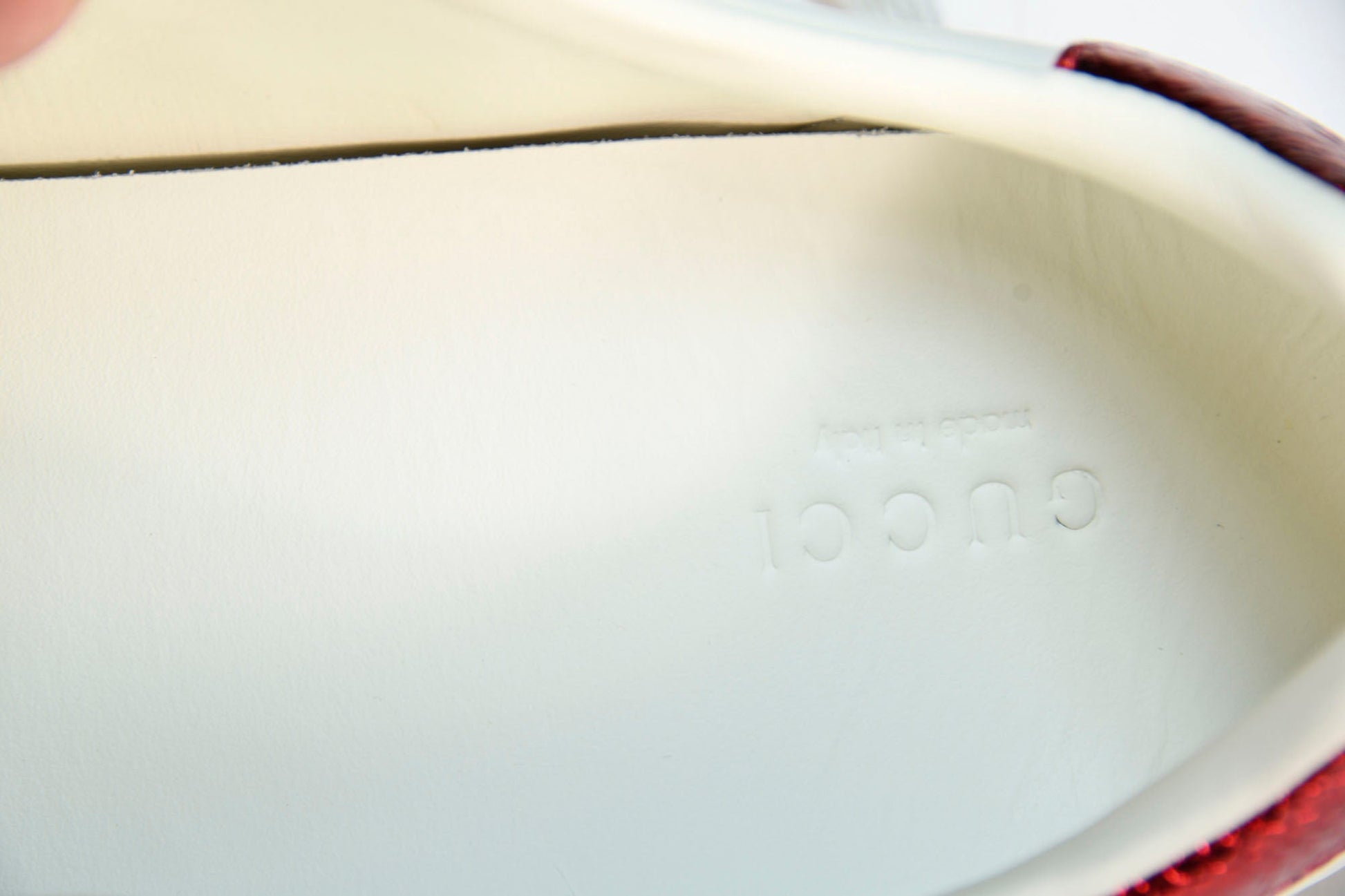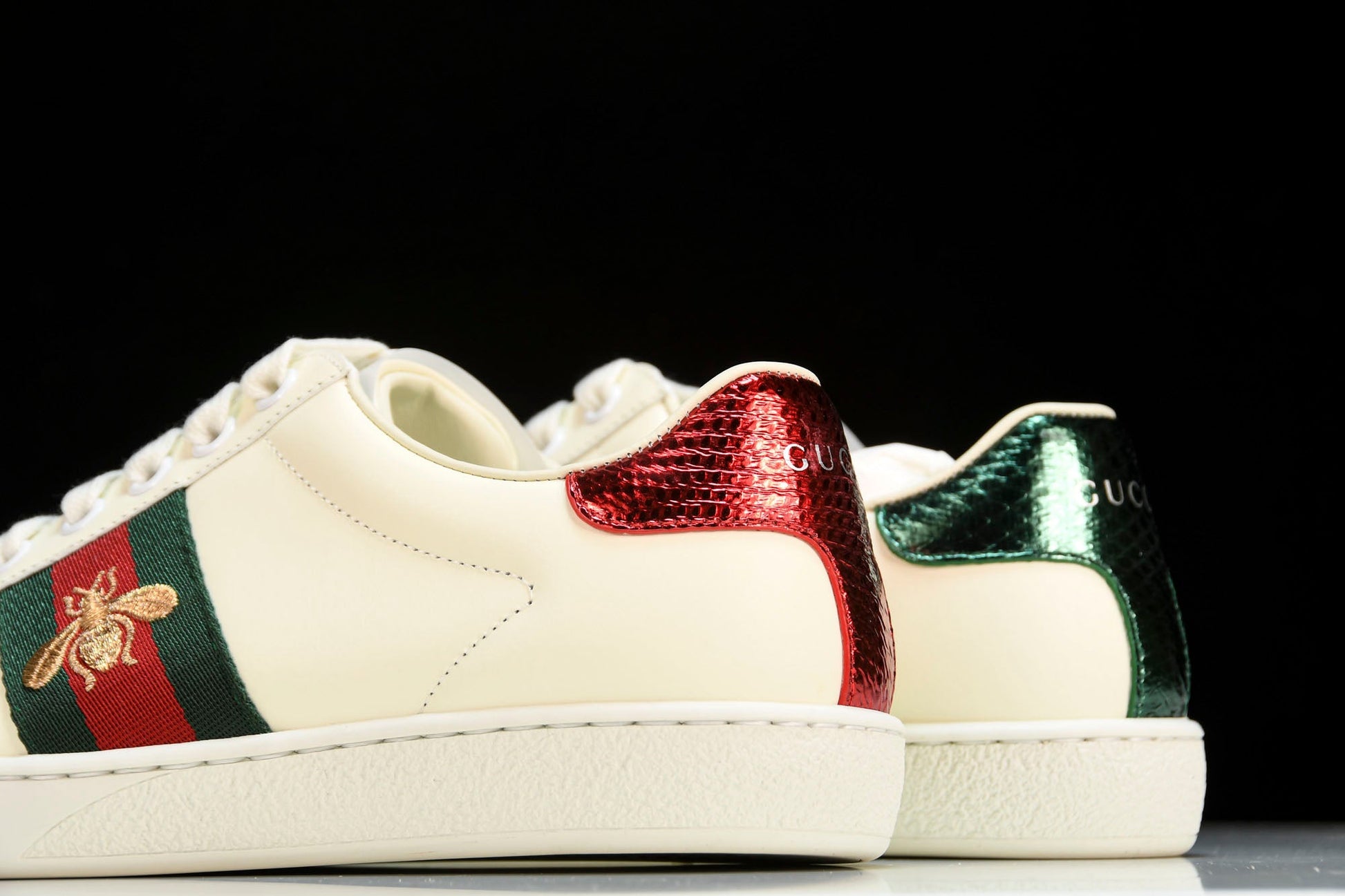 The Guссi Ace 'Bee' sneakers epitomize the perfect fusion of luxury and contemporary style. Crafted from premium materials, these iconic low-top sneakers feature the signature green and red web stripes along with an intricately embroidered bee motif, creating a distinctive and eye-catching design. The green and red theme continues with the mismatched back heels. The clean white leather base adds a timeless touch, ensuring versatility in styling. Meticulously crafted with Guссi's impeccable attention to detail, the Ace 'Bee' sneakers stand as a symbol of elegance and fashion-forward sophistication. Elevate your footwear collection with this statement piece that effortlessly blends classic Guссi aesthetics with modern flair.