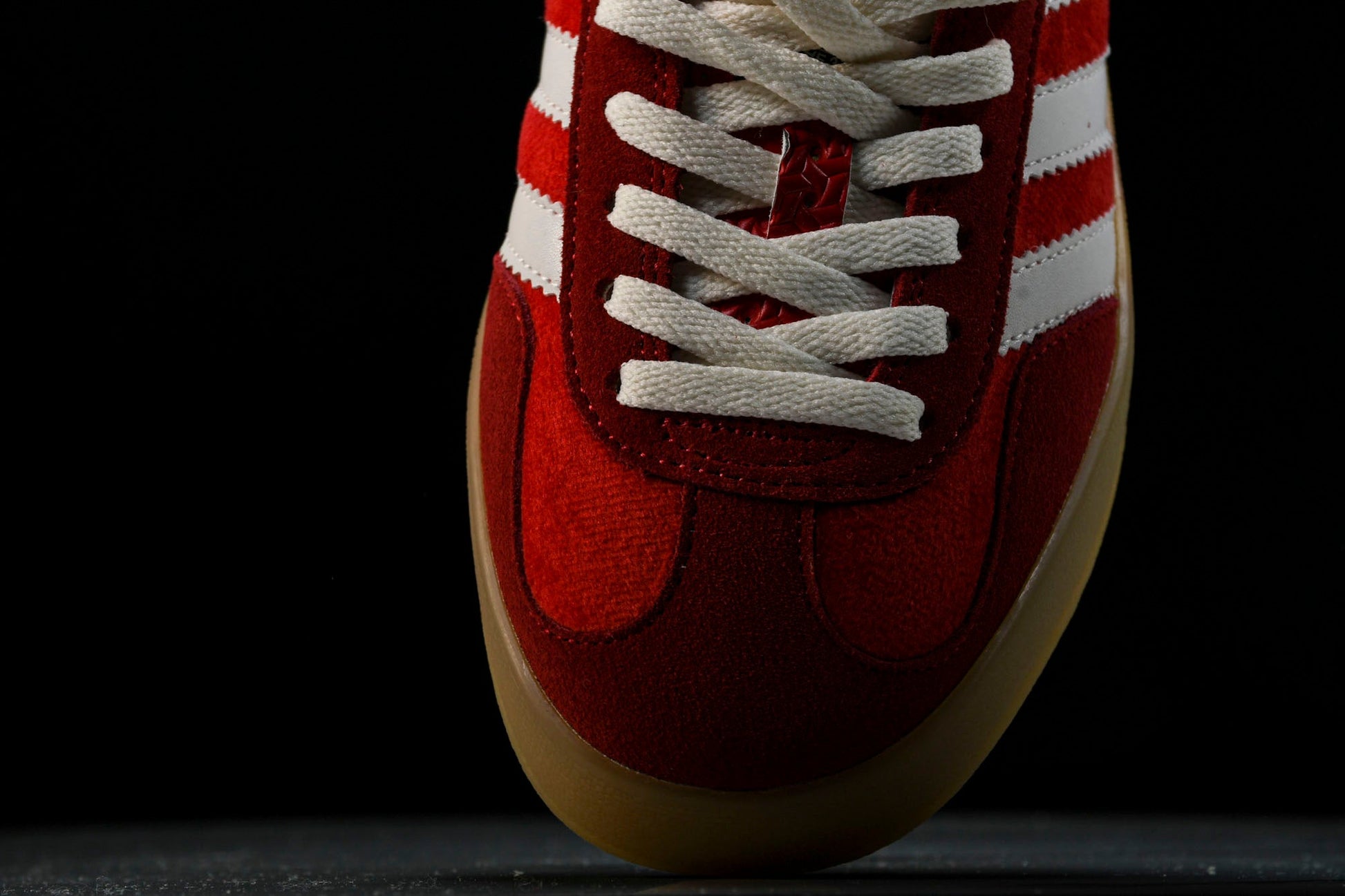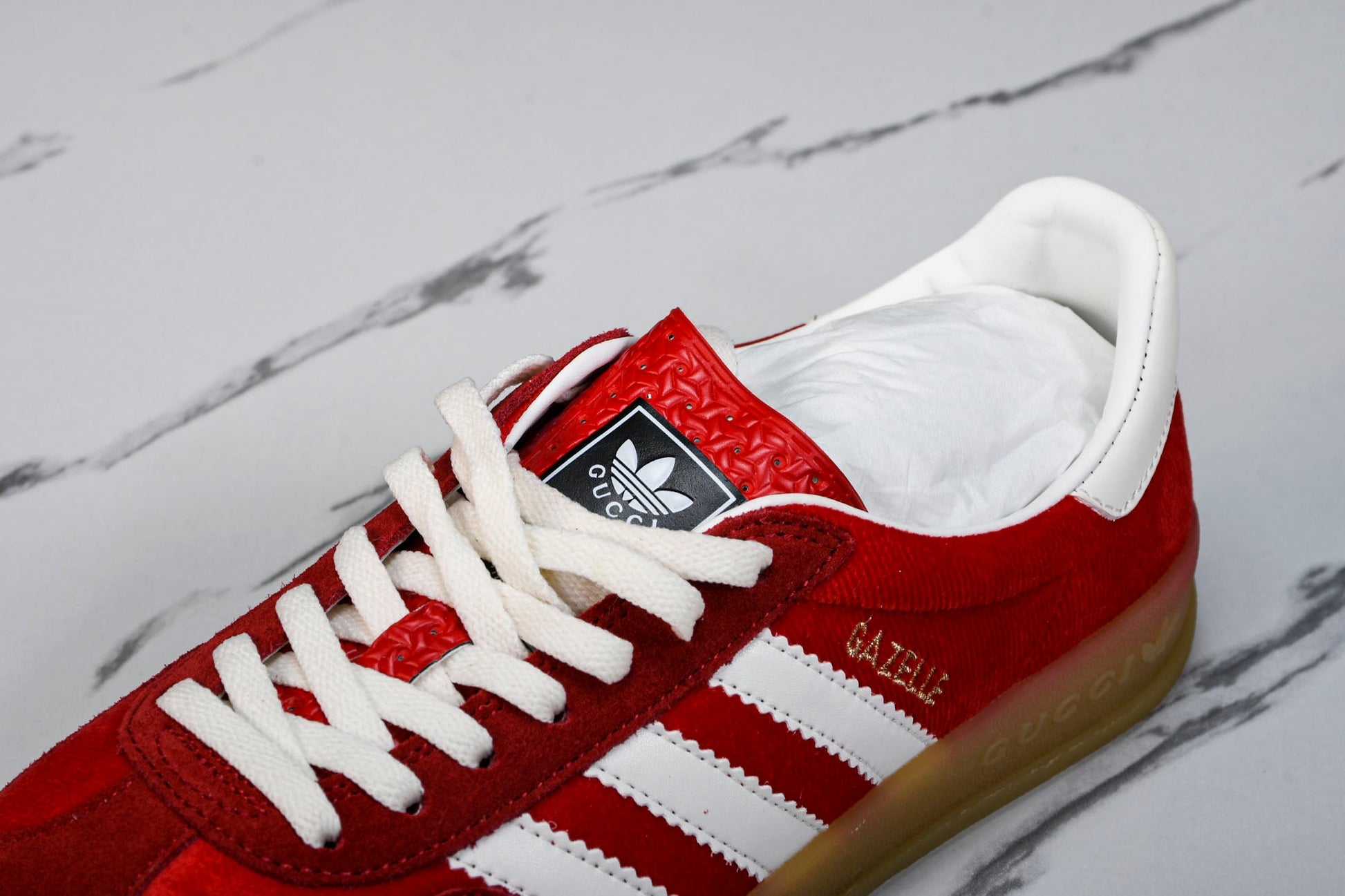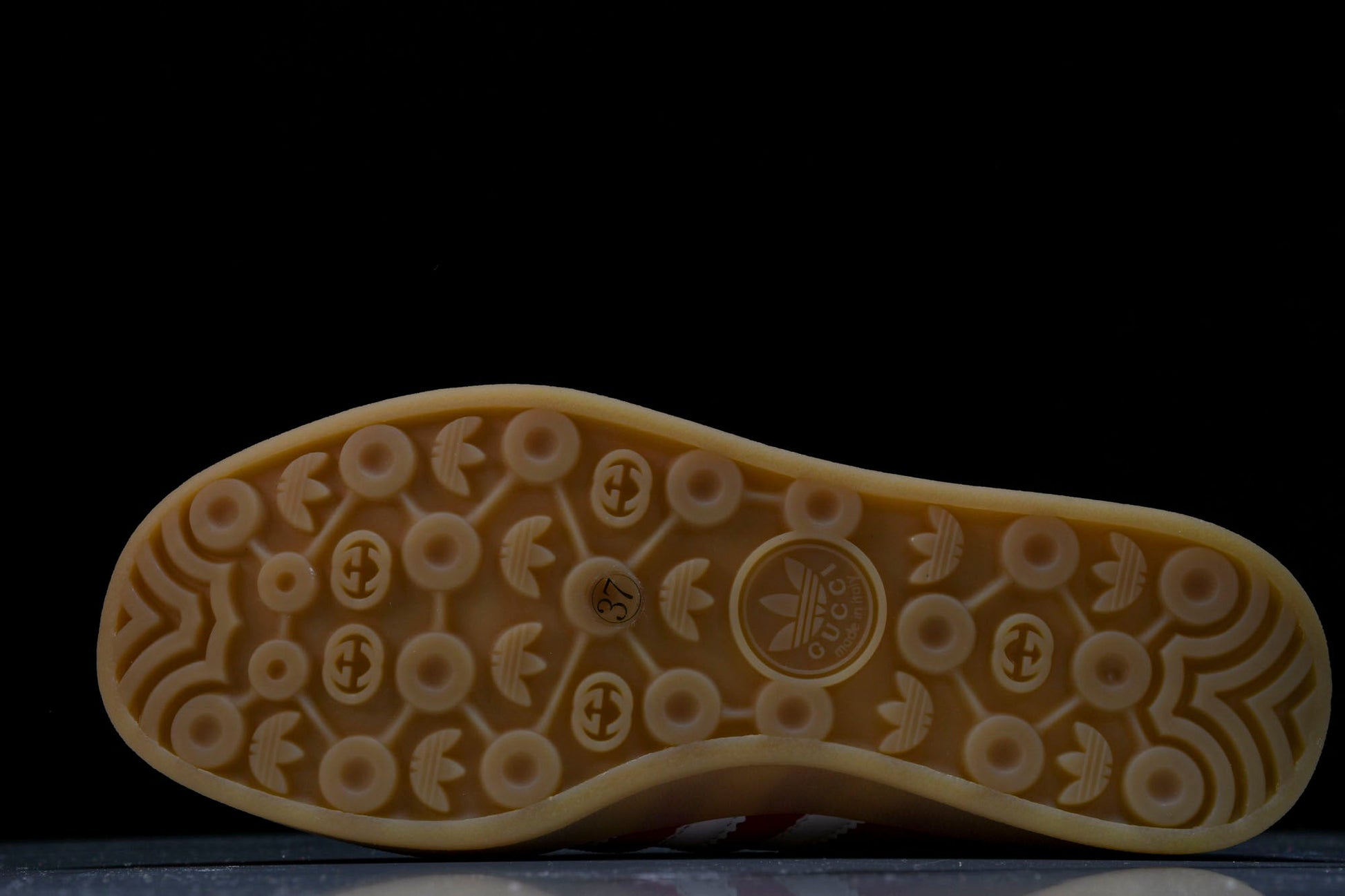 Guссi venture into a collection, where the web juxtaposes with the three white stripes, and the GG monogram combines with the trifoil. Pulling inspiration from the creative directors memories of the ‘80s and ‘90s, emblematic house motifs mix with those of the historic sportswear brand AD resulting in a series of hybrid looks. These red velvet GG gazelle sneakers have the Guссi trifoil print.