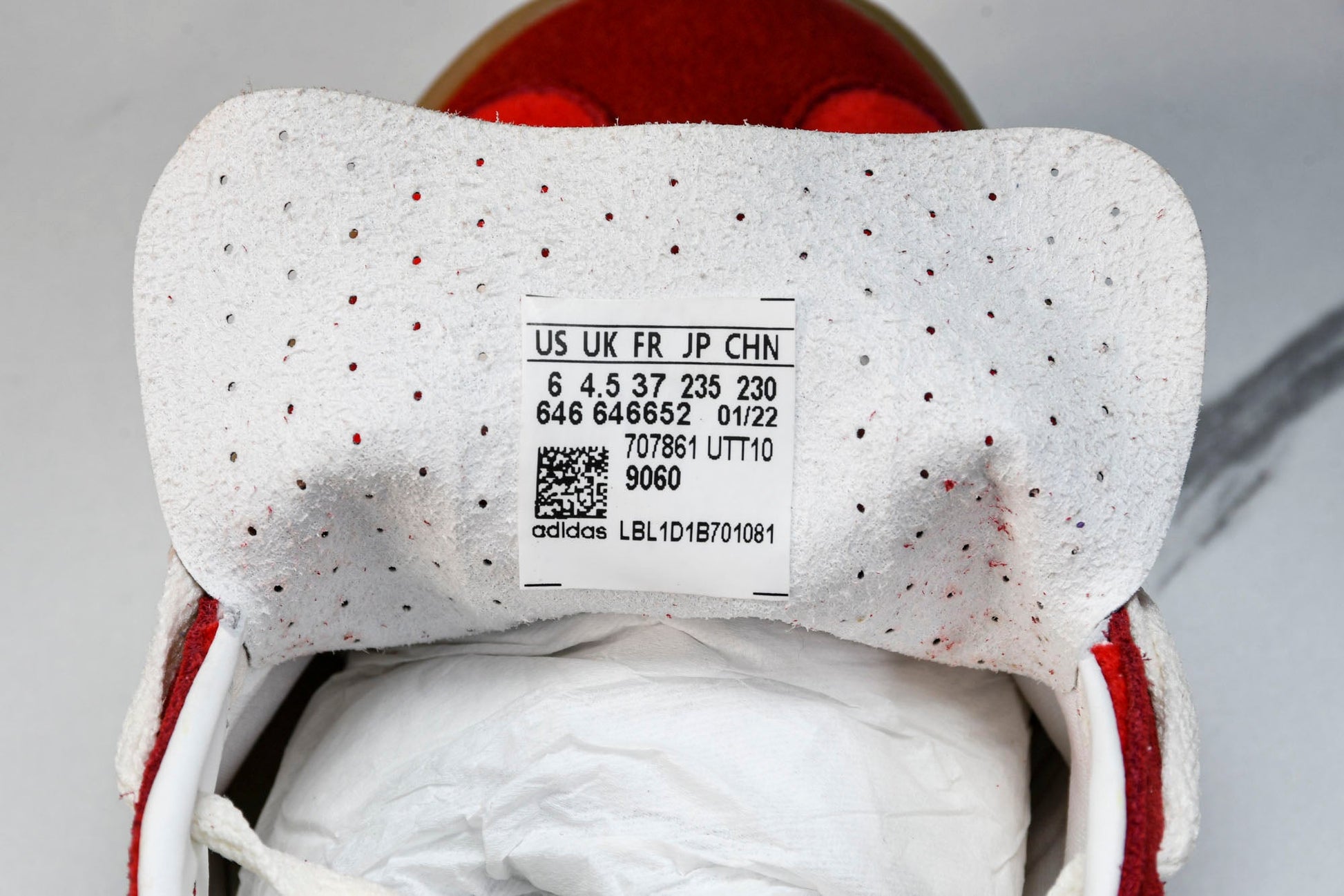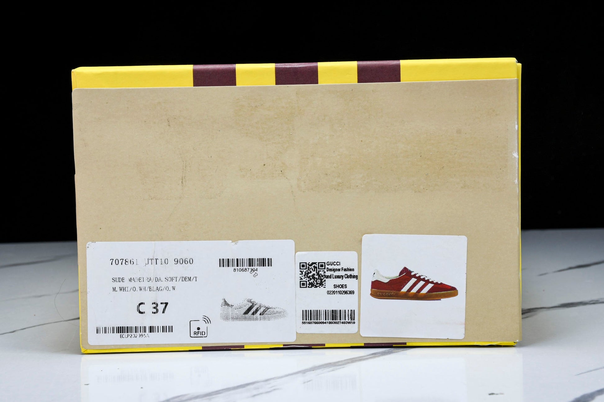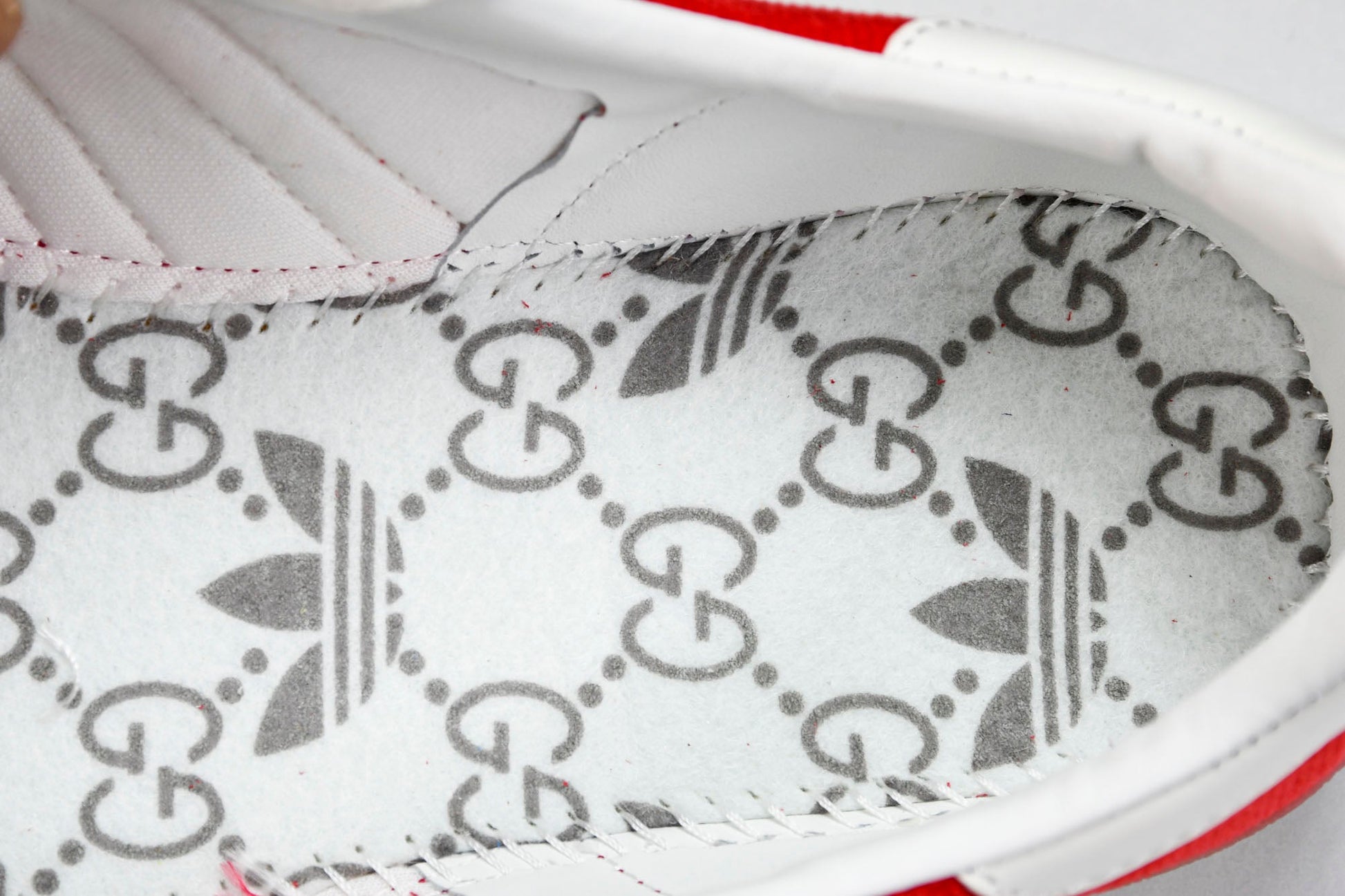 Guссi venture into a collection, where the web juxtaposes with the three white stripes, and the GG monogram combines with the trifoil. Pulling inspiration from the creative directors memories of the ‘80s and ‘90s, emblematic house motifs mix with those of the historic sportswear brand AD resulting in a series of hybrid looks. These red velvet GG gazelle sneakers have the Guссi trifoil print.
