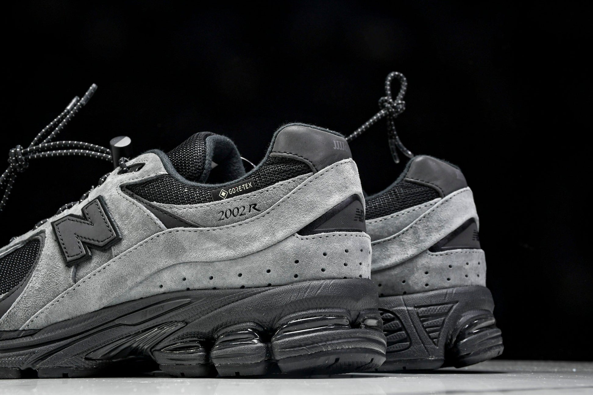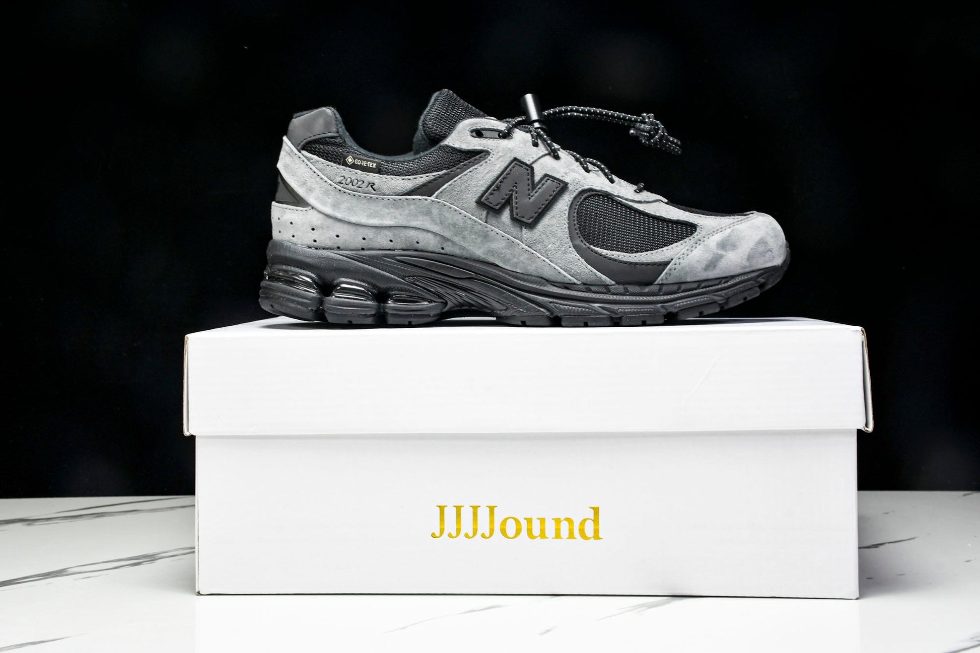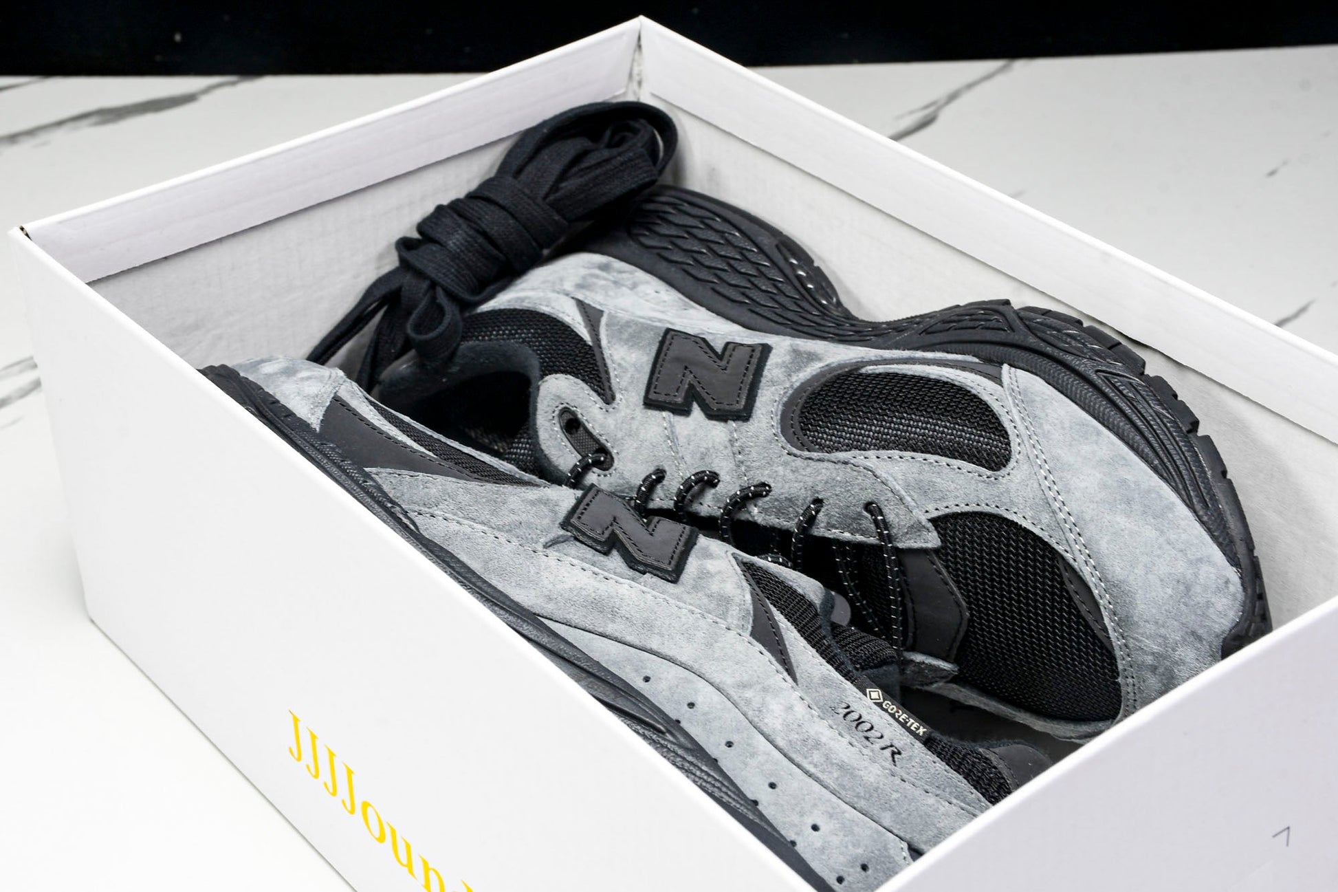 The NB 2002R x JJJJound Gore-Tex 'Charcoal'’ merges functional design with minimalist aesthetics, adapting the classic silhouette for winter conditions. A Gore-Tex lining ensures waterproof protection while maintaining breathability, complementing the charcoal and black leather-mesh upper. The black leather ‘N’ logo, discreet 2002R branding, and white Gore-Tex lettering add subtle detailing. Rugged yet refined, this collaboration balances utility and understated style.