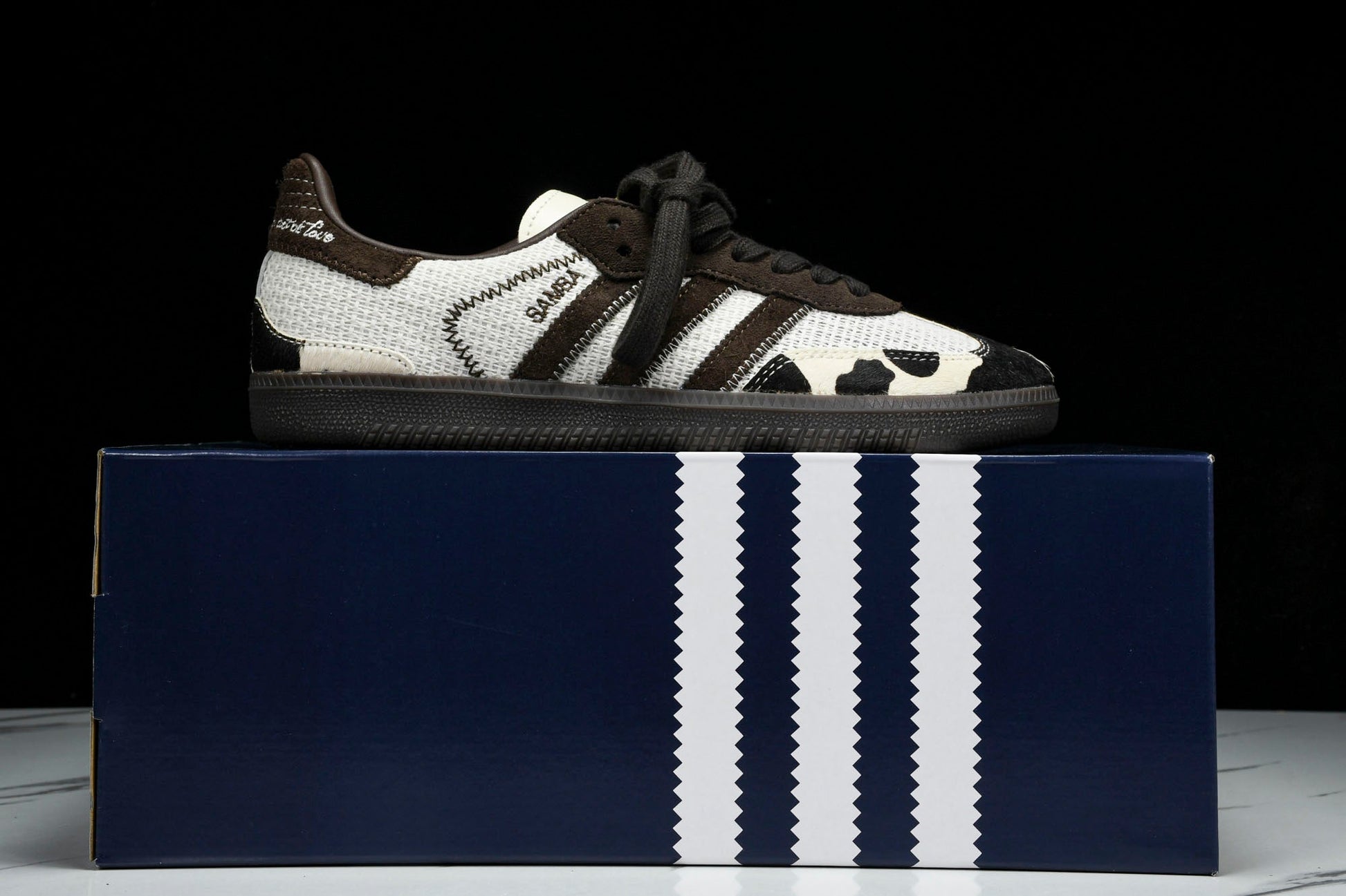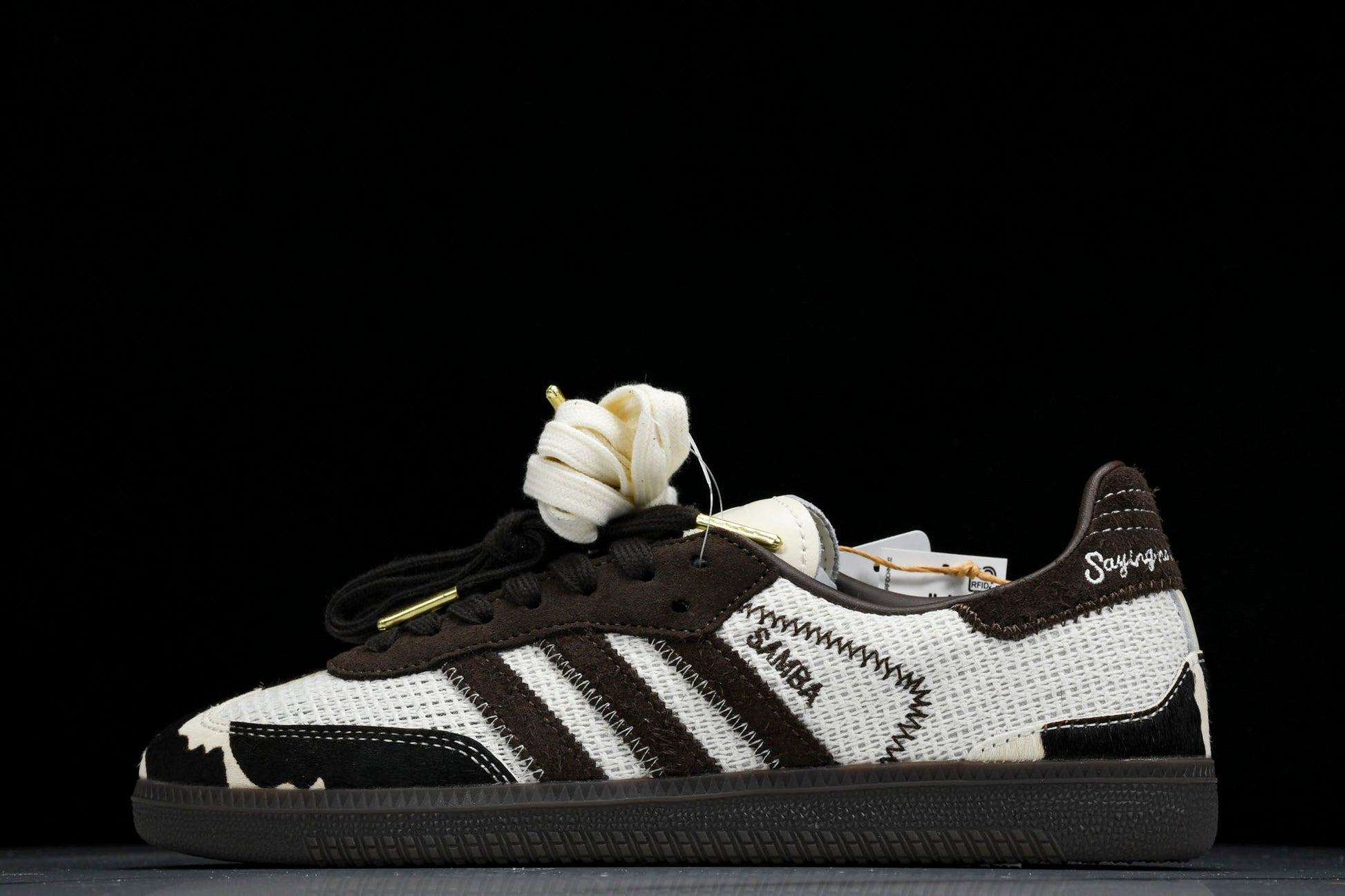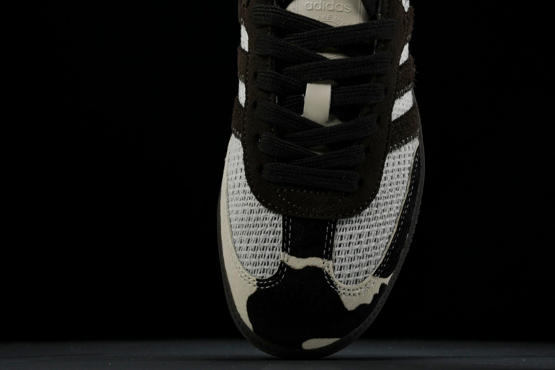 Part of a collaborative footwear collection, the Samba x notitle ‘Cow Print’ showcases an off-white knit textile base with faux cowhide overlays on the forefoot and heel. The design is accented with brown suede on the eyestay, stripes, and back tab, which features the phrase 'Saying No Is an Act of Love.' A brown gum rubber cupsole completes the look.