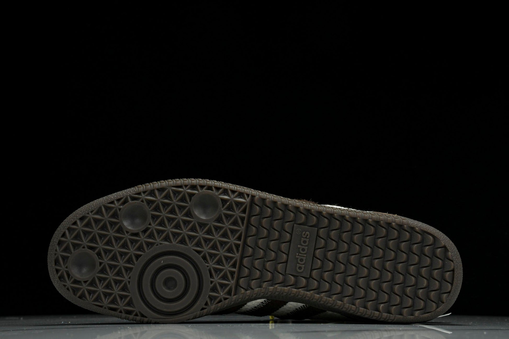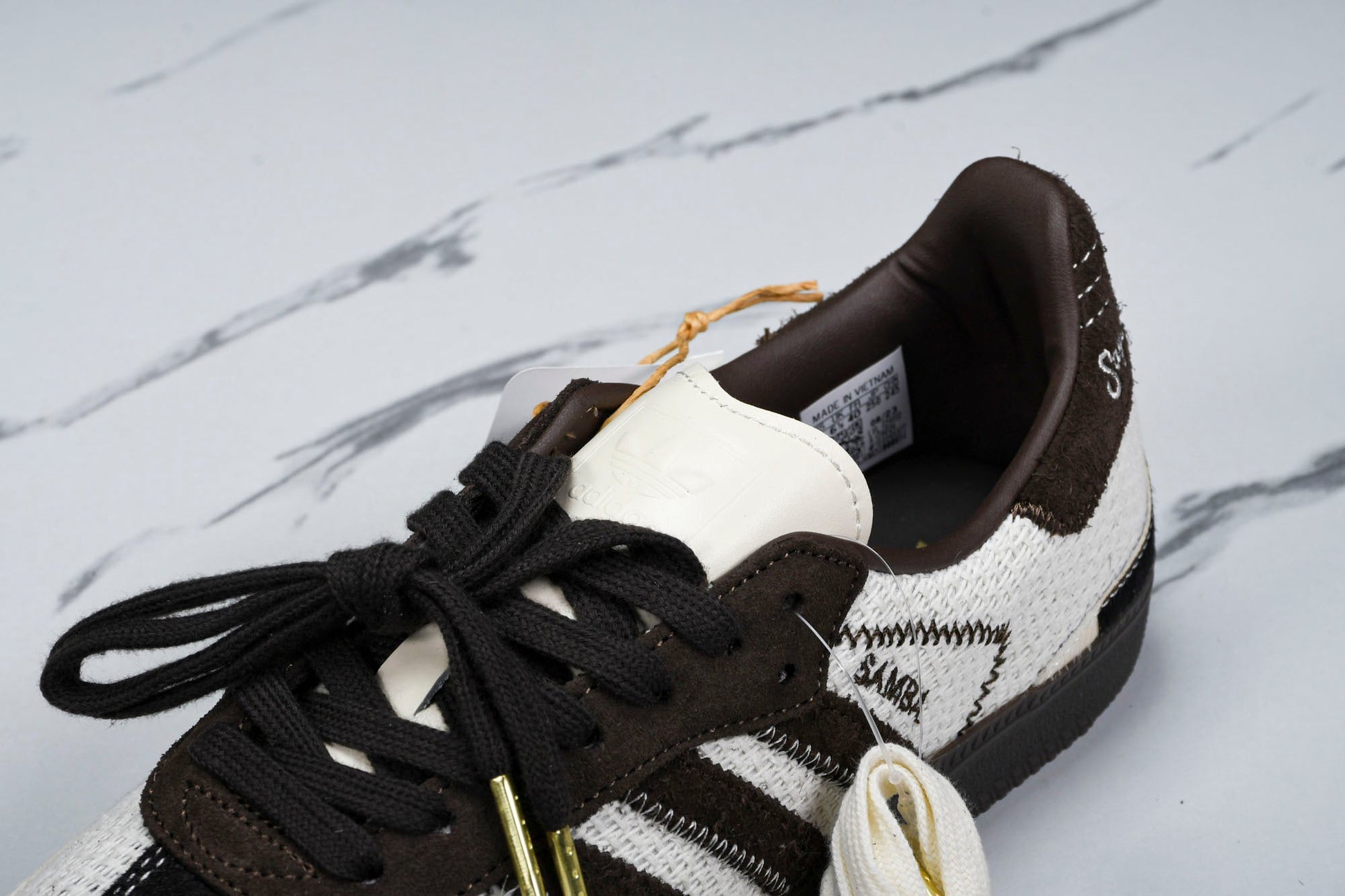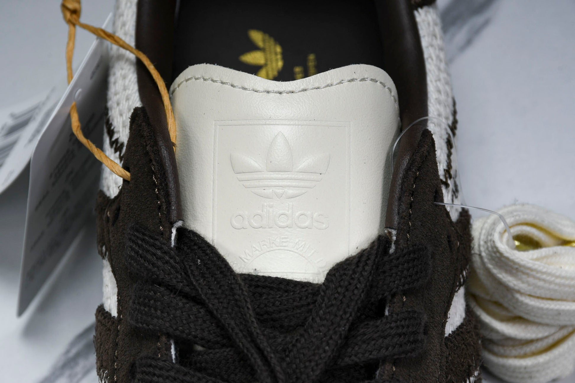 Part of a collaborative footwear collection, the Samba x notitle ‘Cow Print’ showcases an off-white knit textile base with faux cowhide overlays on the forefoot and heel. The design is accented with brown suede on the eyestay, stripes, and back tab, which features the phrase 'Saying No Is an Act of Love.' A brown gum rubber cupsole completes the look.