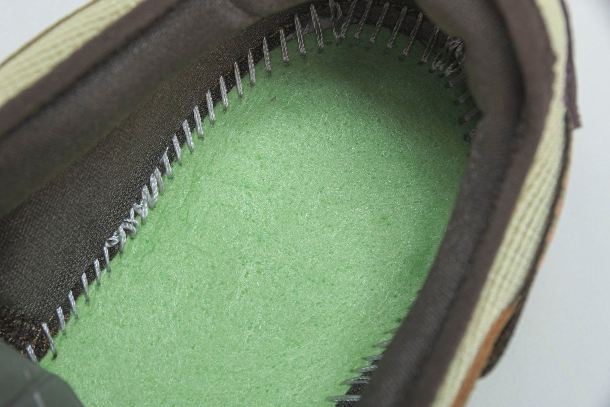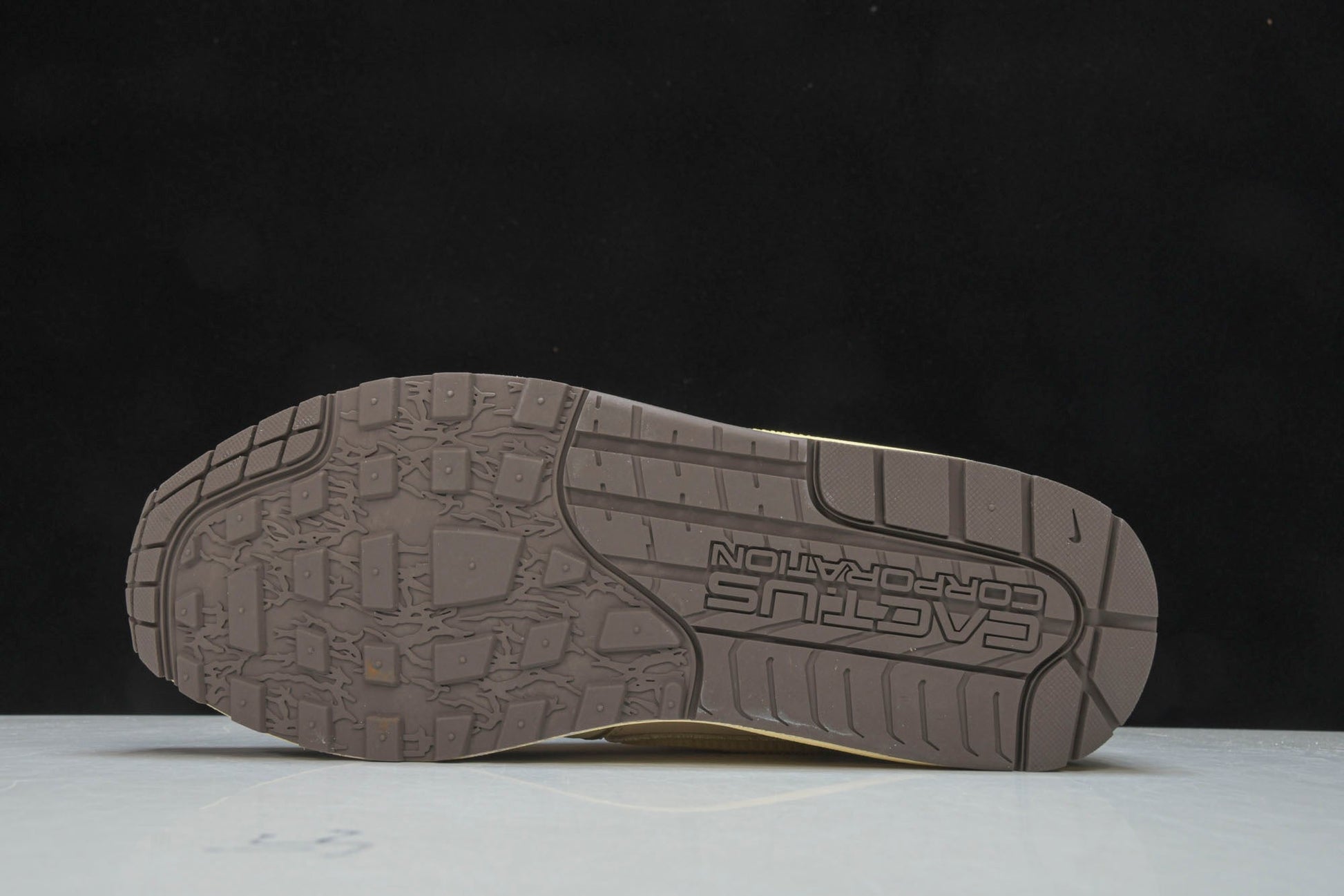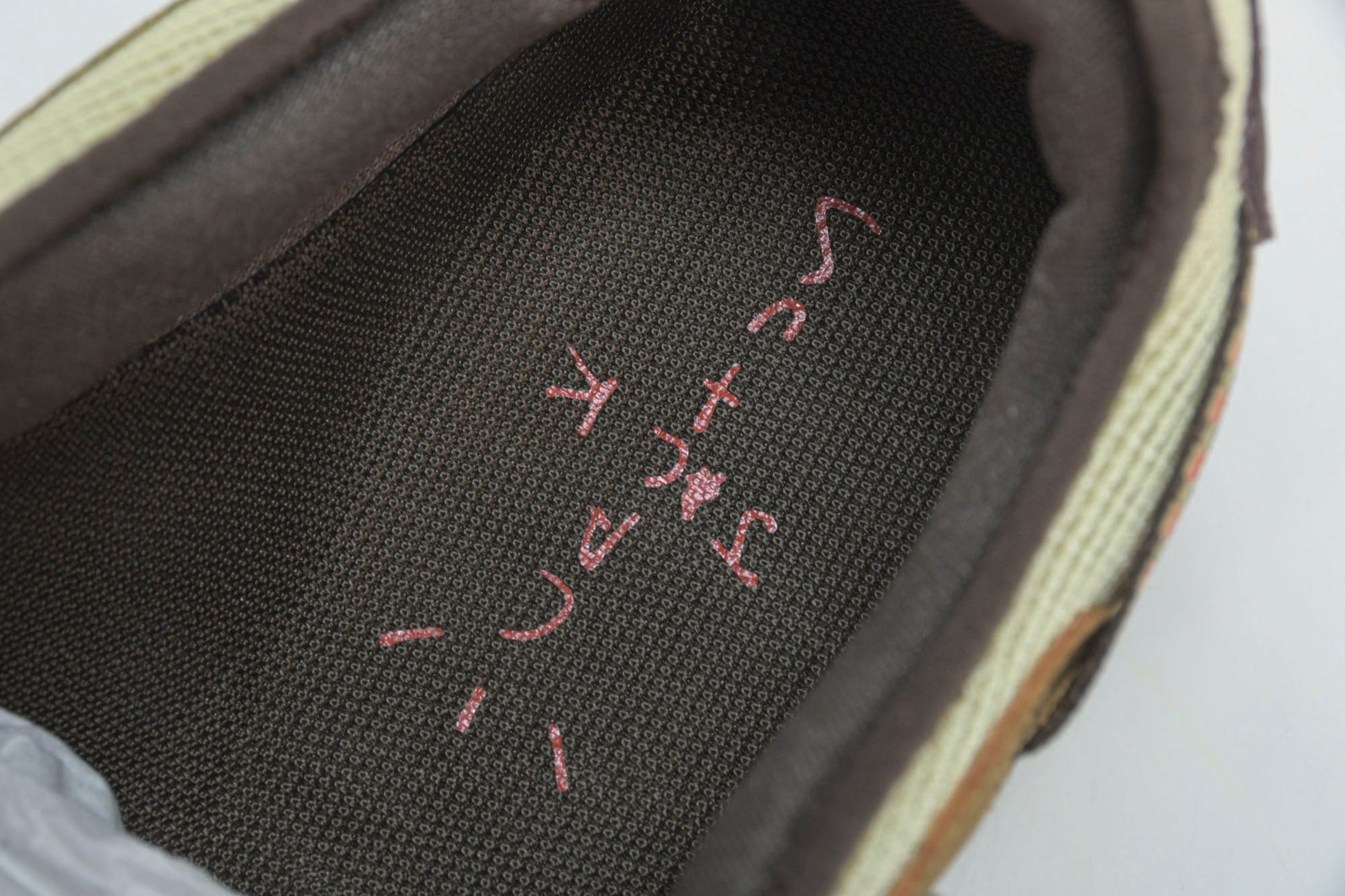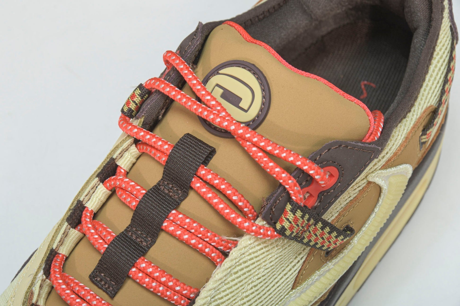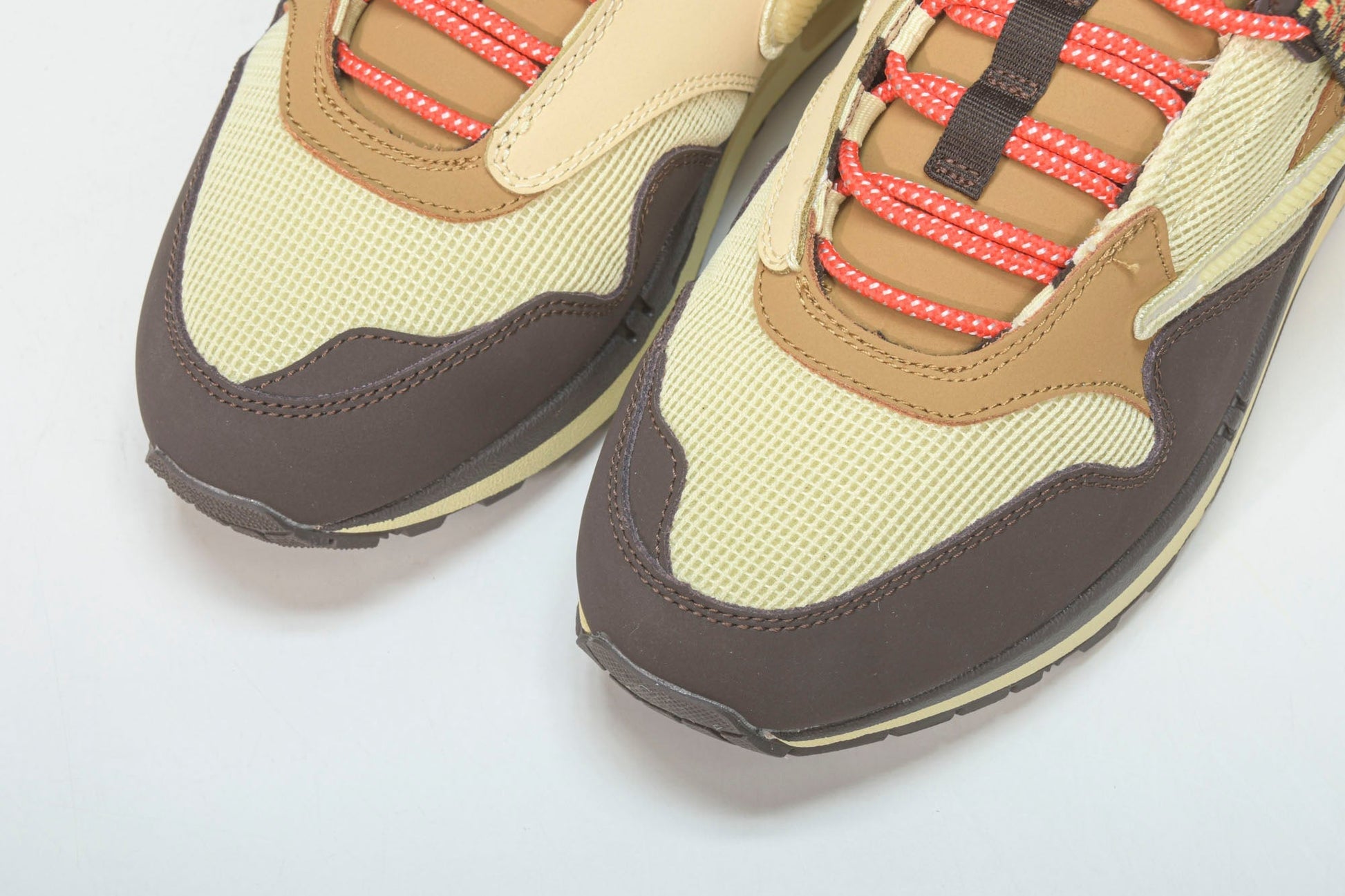 The Travis Scott AM1 ‘Baroque Brown’ treats the iconic retro runner to a rugged outdoor-inspired makeover. Red hiker-style laces secure a cream coloured mesh upper with dark tan leather overlays and a brown nubuck mudguard. Scott’s signature reverse tick decorates the lateral quarter panel in a lemon finish, while multicolor woven straps are integrated into the laces and heel overlay. The latter features a crimson triangular patch, accented with Cactus Jack branding on the right shoe and a classic nk logo on the left. The sneaker is mounted on a two tone foam midsole, fitted with cushioning in the heel and supported by a waffle-traction rubber outsole.